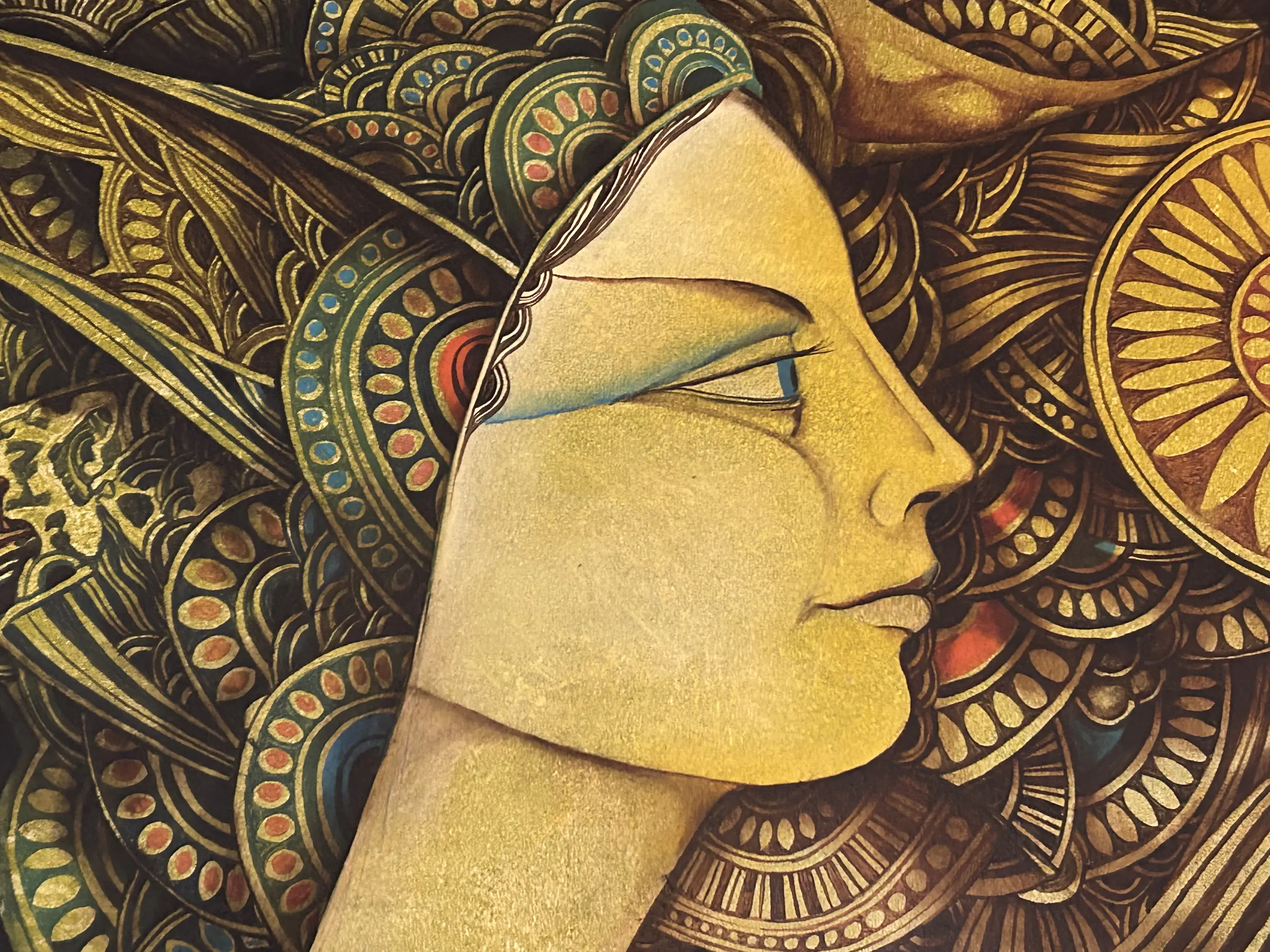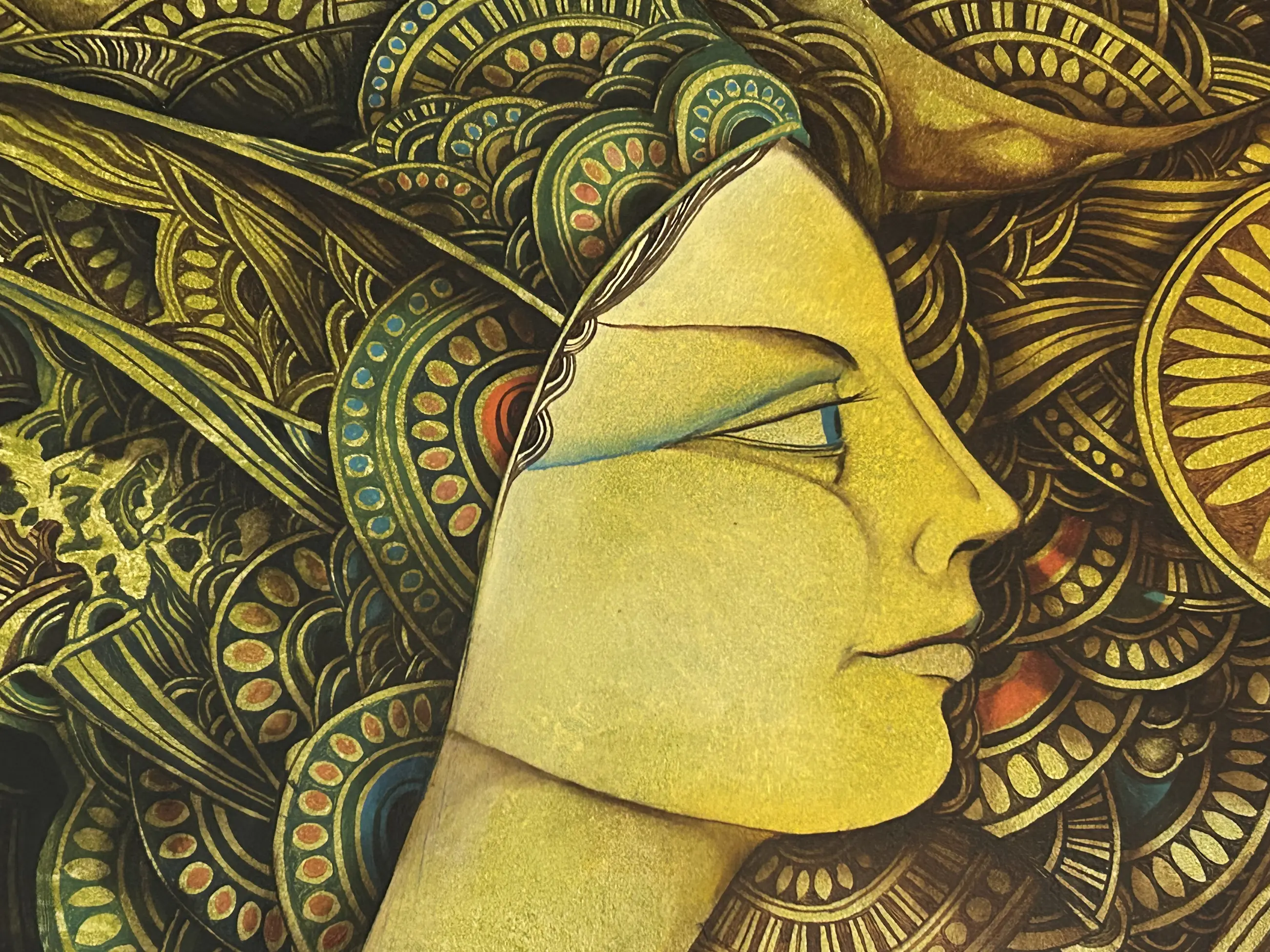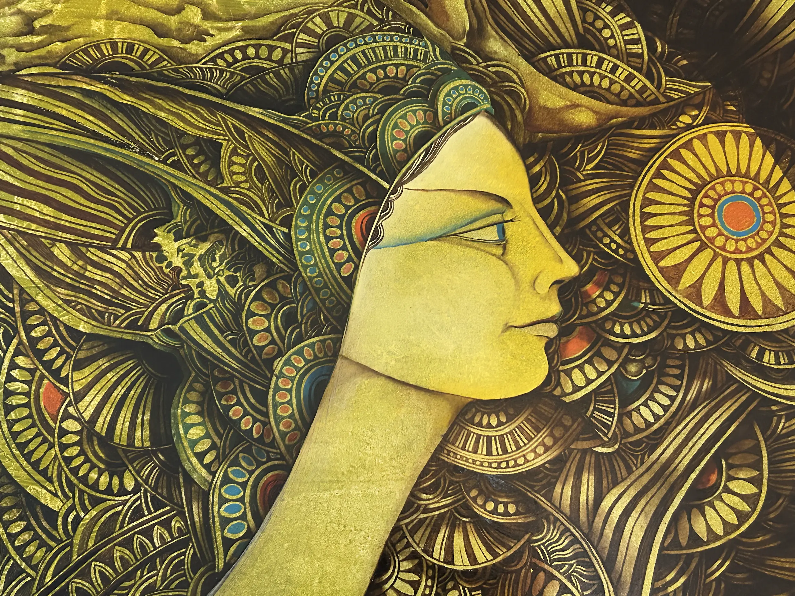 Prachtig werk van de Belgische (Wallonië) kunstenaar Ronald Dieu "Eden" Surrealistisch met neiging naar de Art Nouveau stijl. Geboren in Ghlin op 20 augustus 1945. Hoogleraar schilderkunst. Volgde de cursussen van Zéphir Busine, Gustave Camus en Edmond Dubrunfaut aan de Academie voor Schone Kunsten in Bergen.