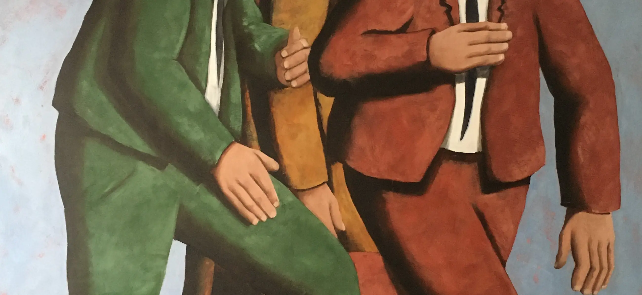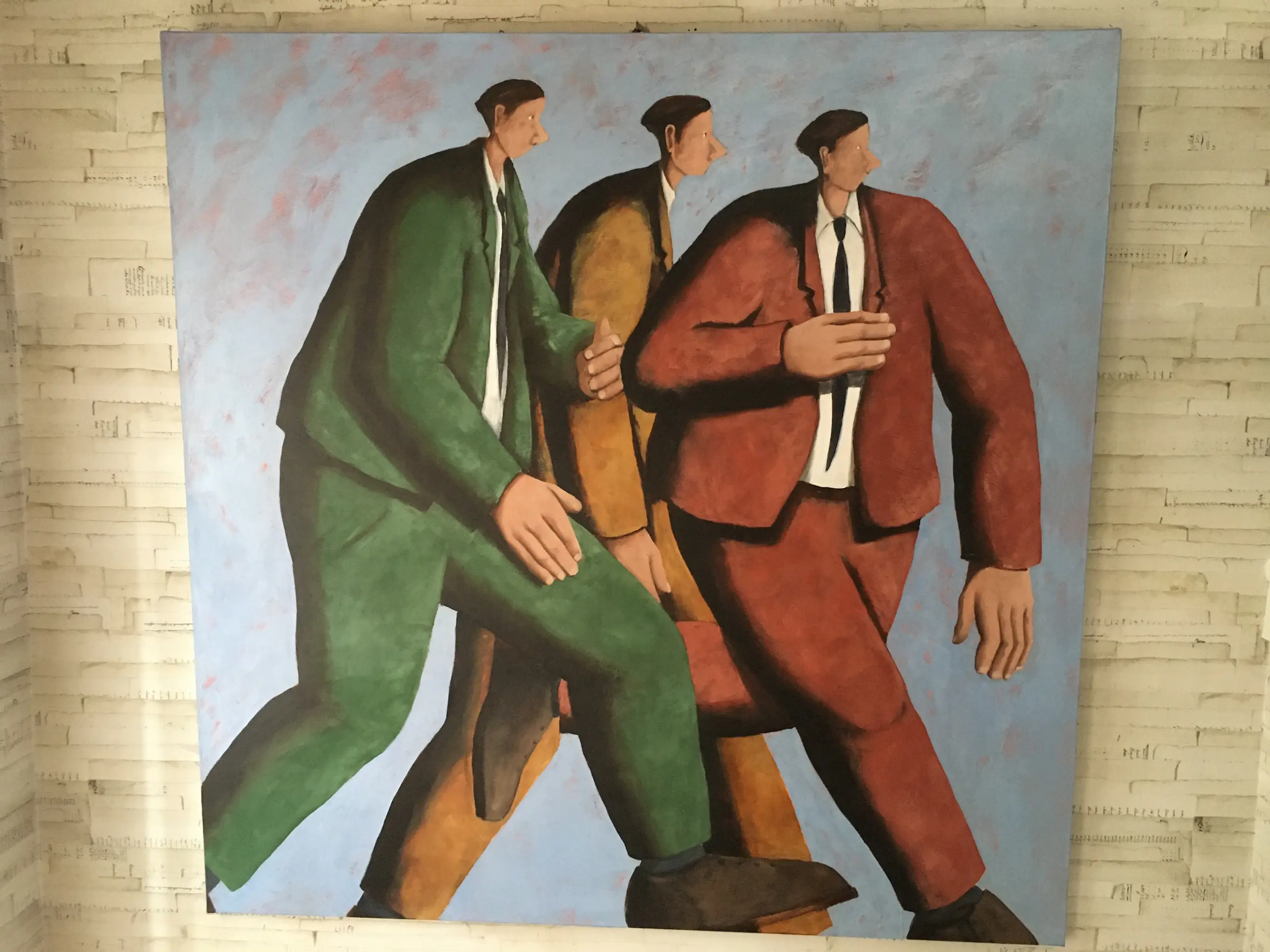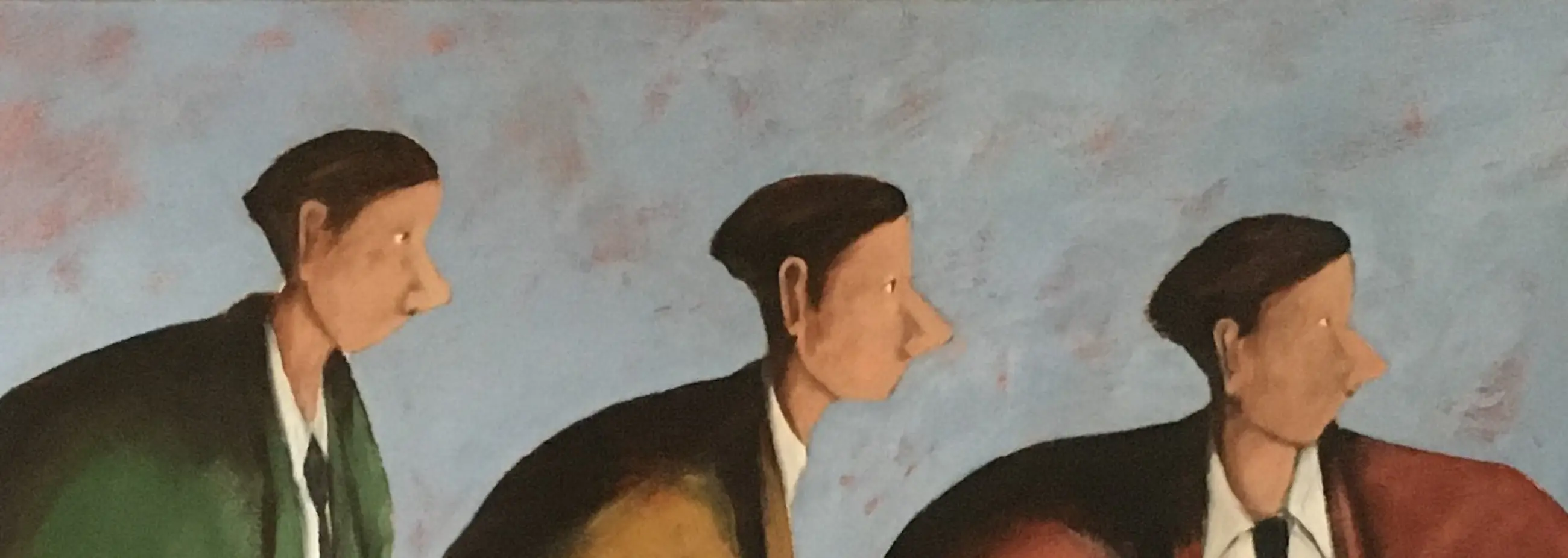 Het werk toont 3 mannen in kostuum (Groen, oker, bruin) die (gehaast?) naar rechts lopen. De achtergrond is lichtblauw. De figuren hebben kleine hoofden, een typisch kenmerk van Dupont.
