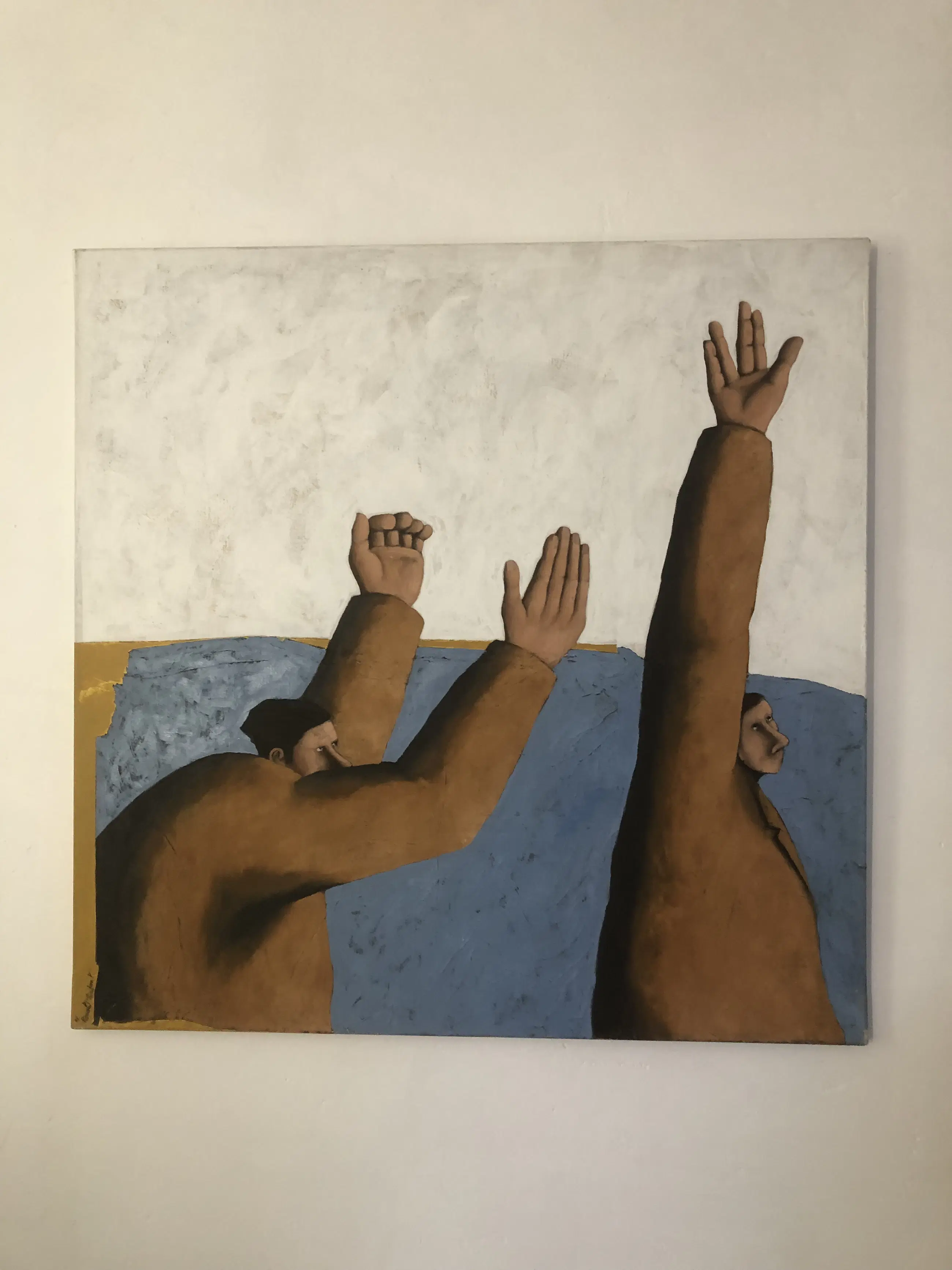 Personages met opgeheven armen. Uit de serie van vóór 2000.