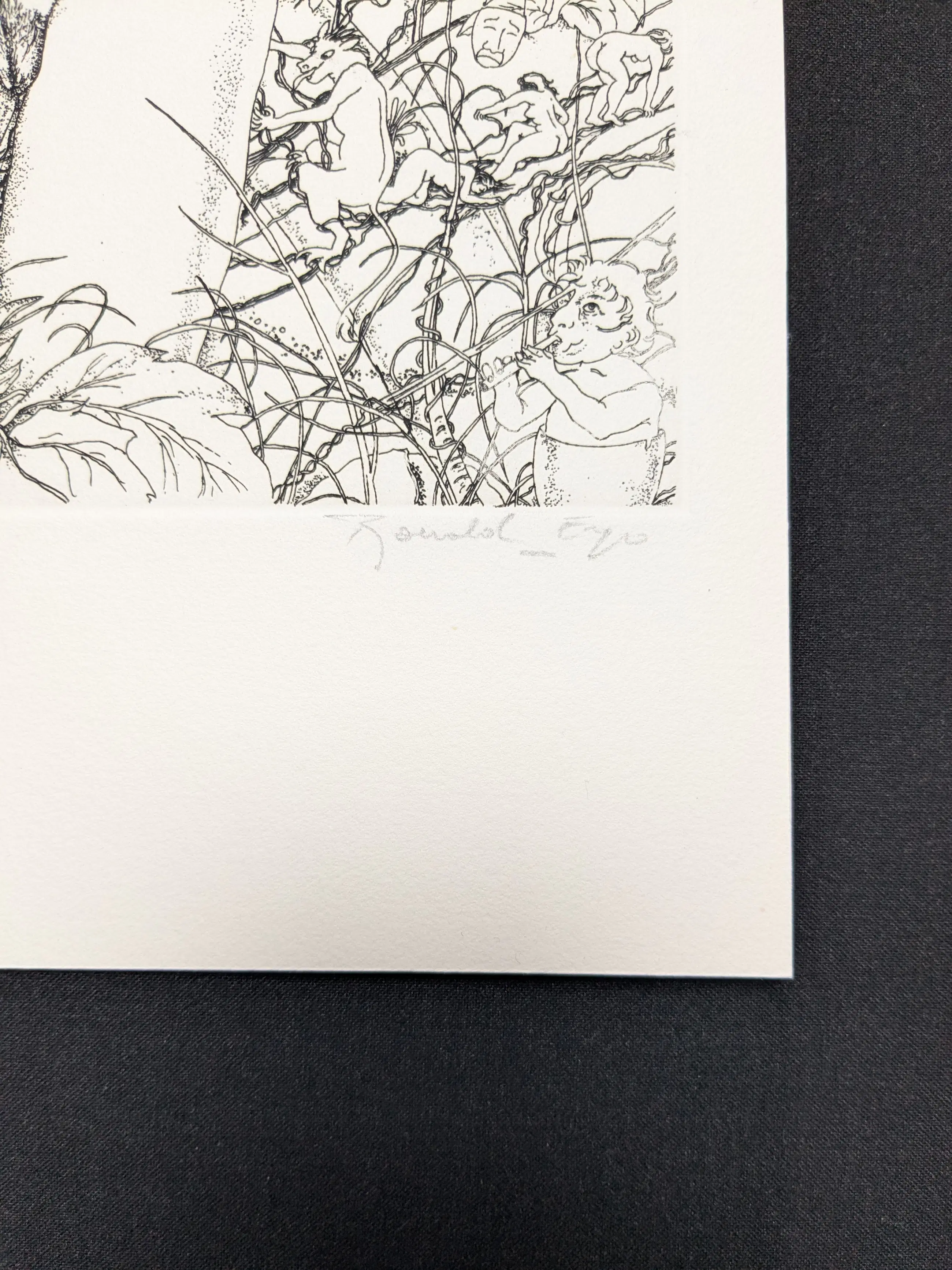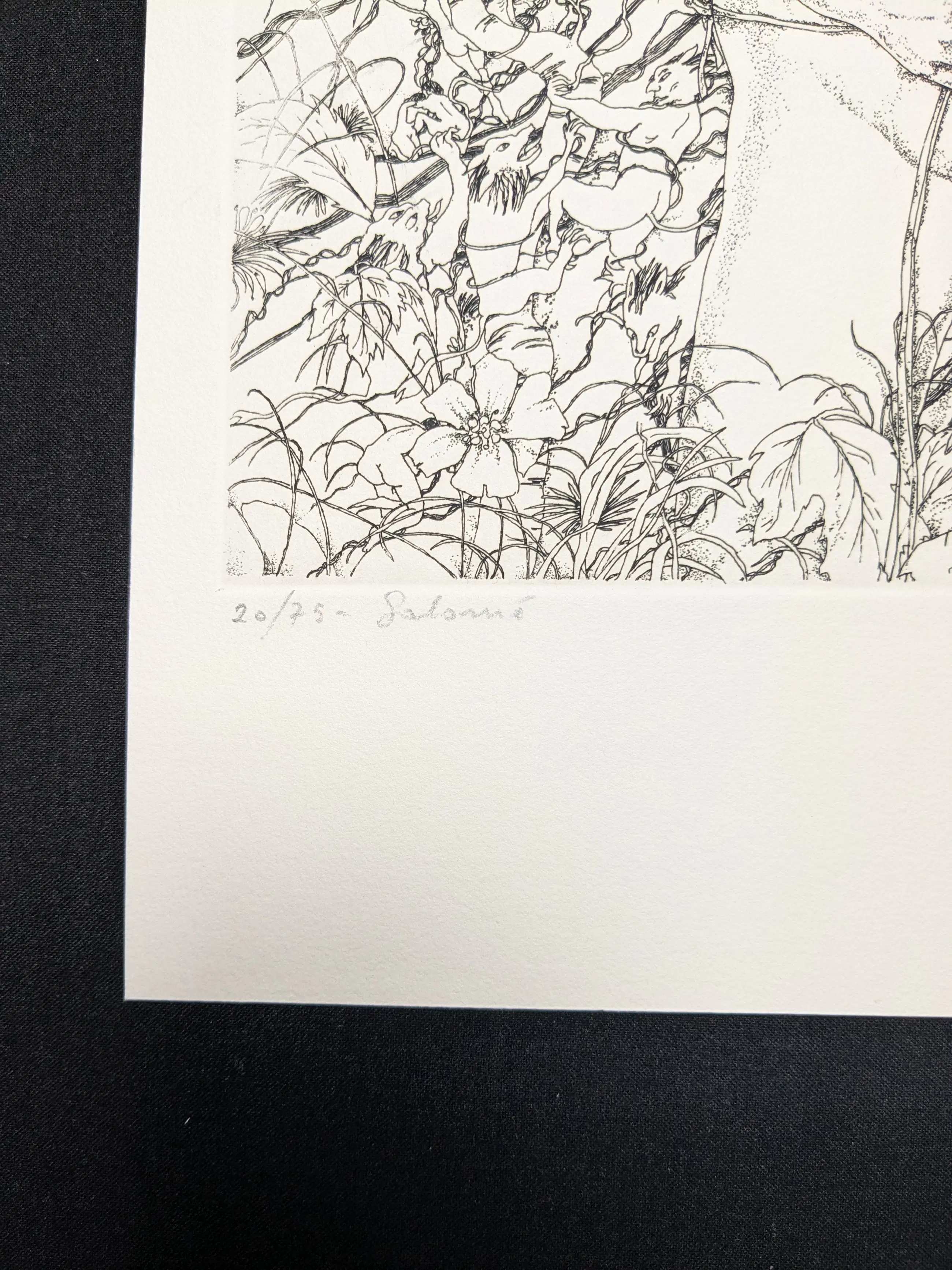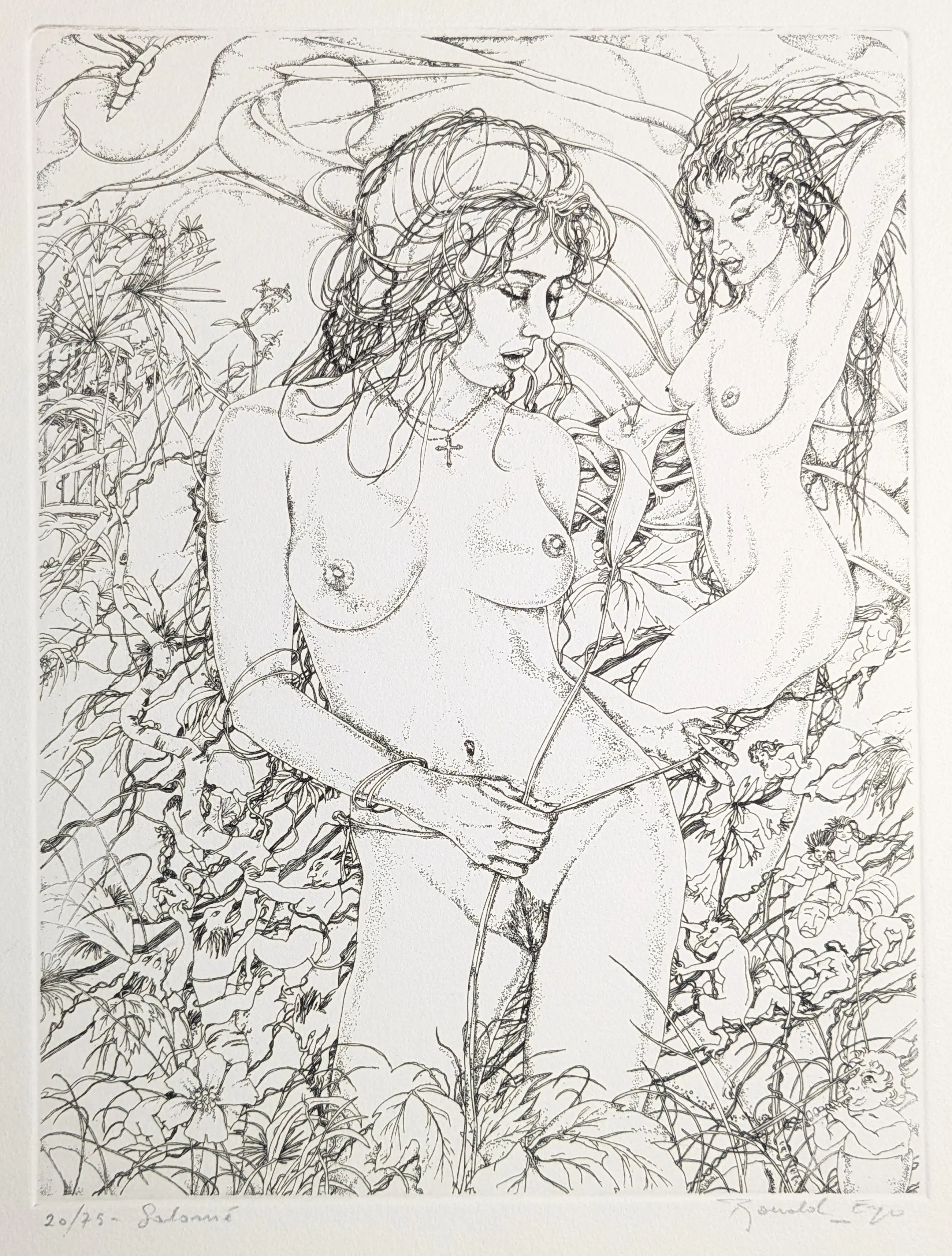 Een prachtige ets uit 1985 door Ronald Ergo in zijn typische magisch realistische en wat erotische stijl. De ets is gesigneerd, getiteld Salomé en genummerd 20/75 in potlood.