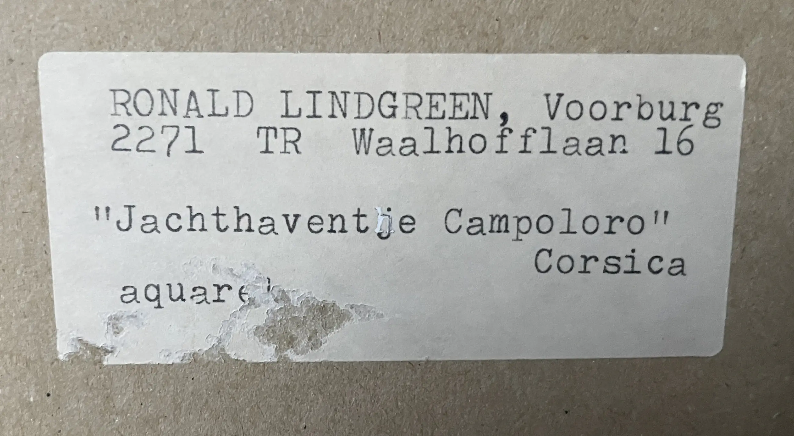 Het was een persoonlijk geschenk van Ronald Lindgreen aan mijn vader, als sfeer impressie van Corsica . Het geeft een mediterrane impressie van dit schitterende eiland. Het schilderij verkeerd in zeer goede staat, daar het op zijn advies niet blootgesteld mocht worden aan direkt zonlicht.