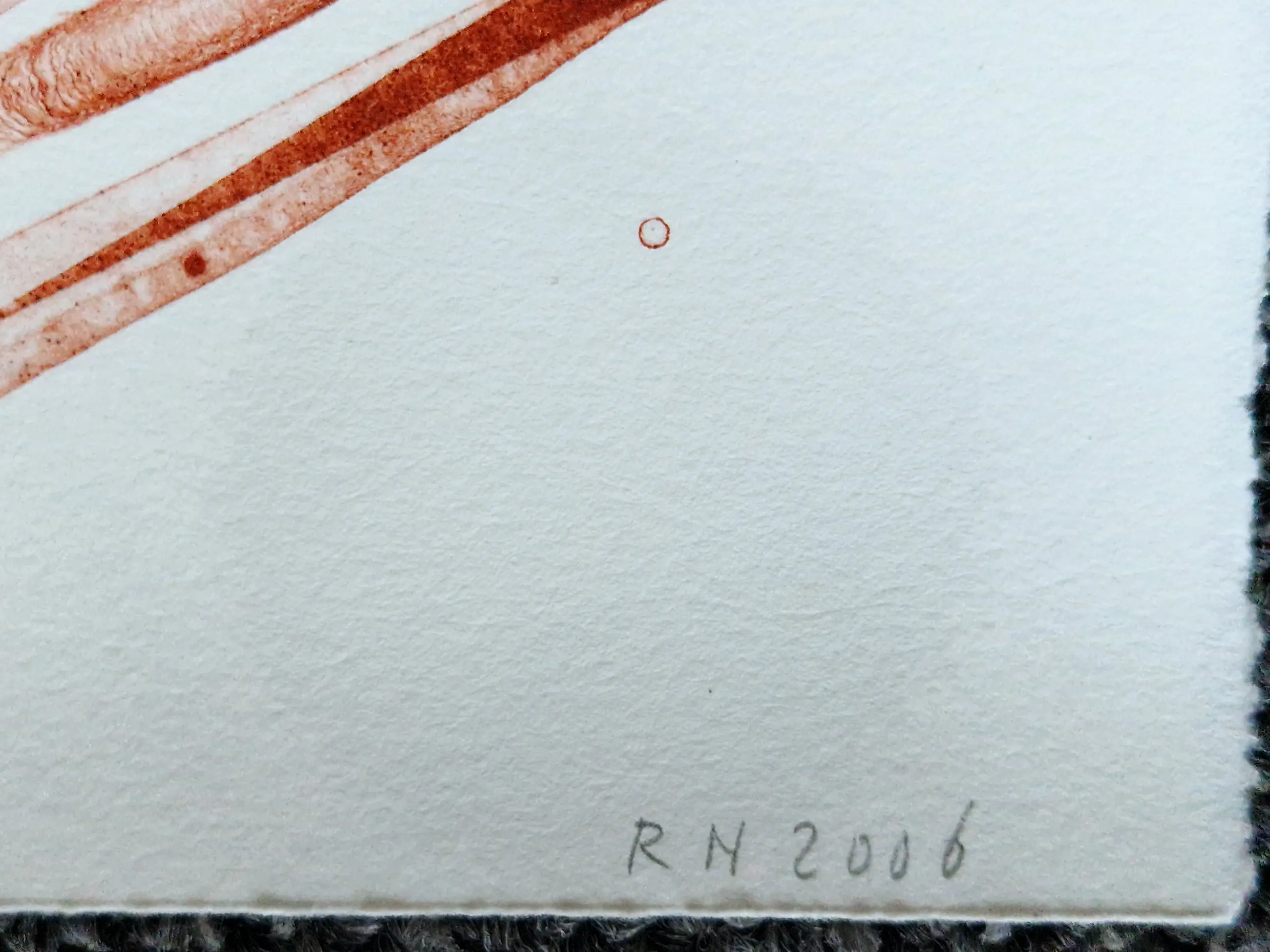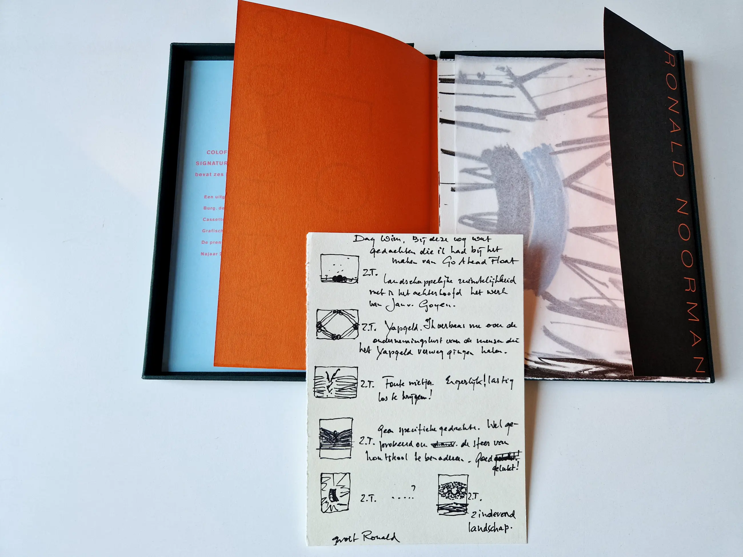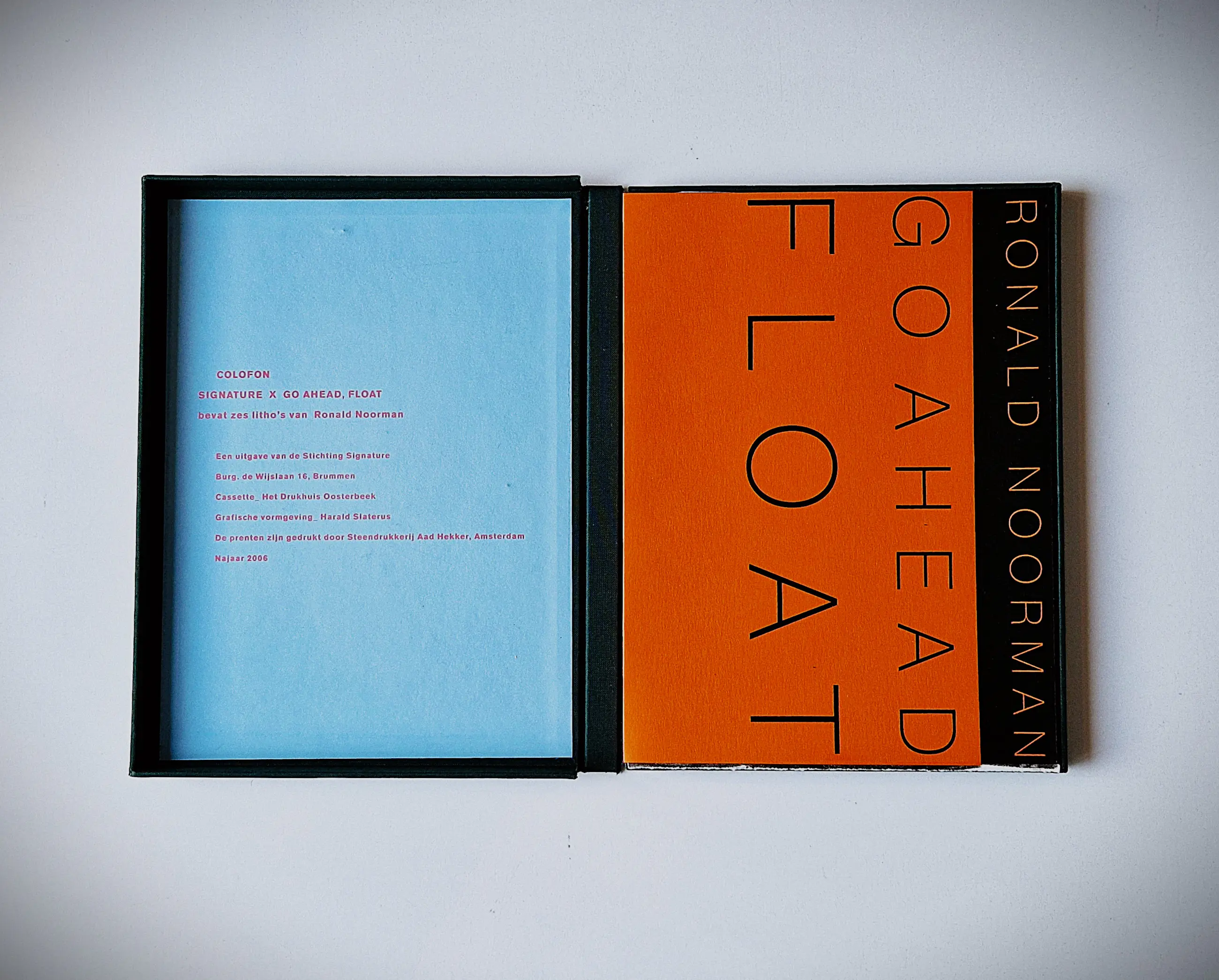 - Een magnifieke serie van in totaal zes (6) kleuren lithografien, gemaakt door de gelauwerde beeldend kunstenaar Ronald Noorman (1951 - 2018) en getiteld "Go ahead, Float". Deze fraaie cassette werd in 2006 in een voor-oplage van slechts 10 exemplaren uitgegeven door Stichting Signature te Brummen en bevat een handgeschreven kaartje waarop Ronald Noorman alle litho's beschrijft. Afmetingen litho's: 24 x 18 cm, allen hand-gesigneerd. Oplage 10/30.
