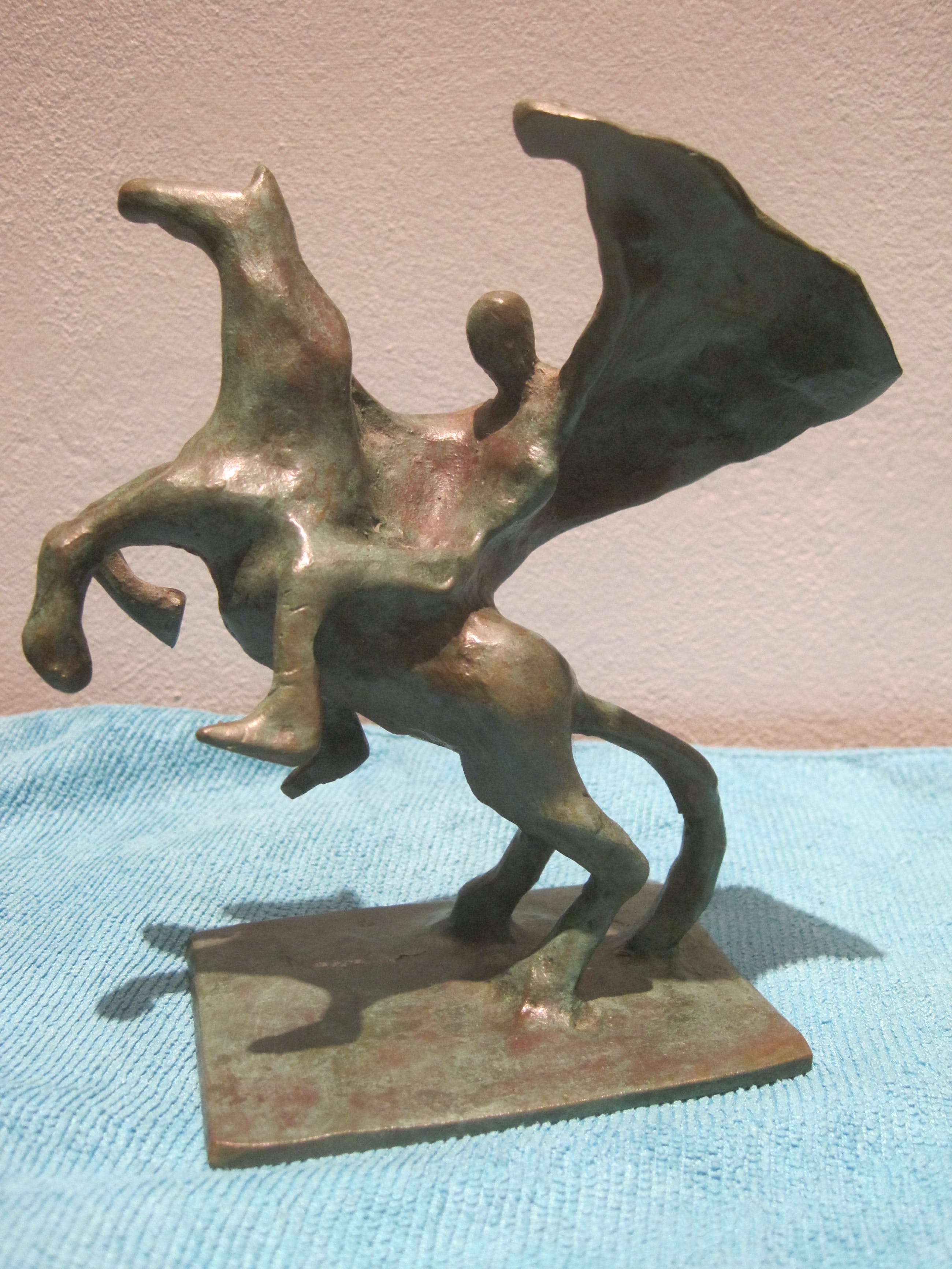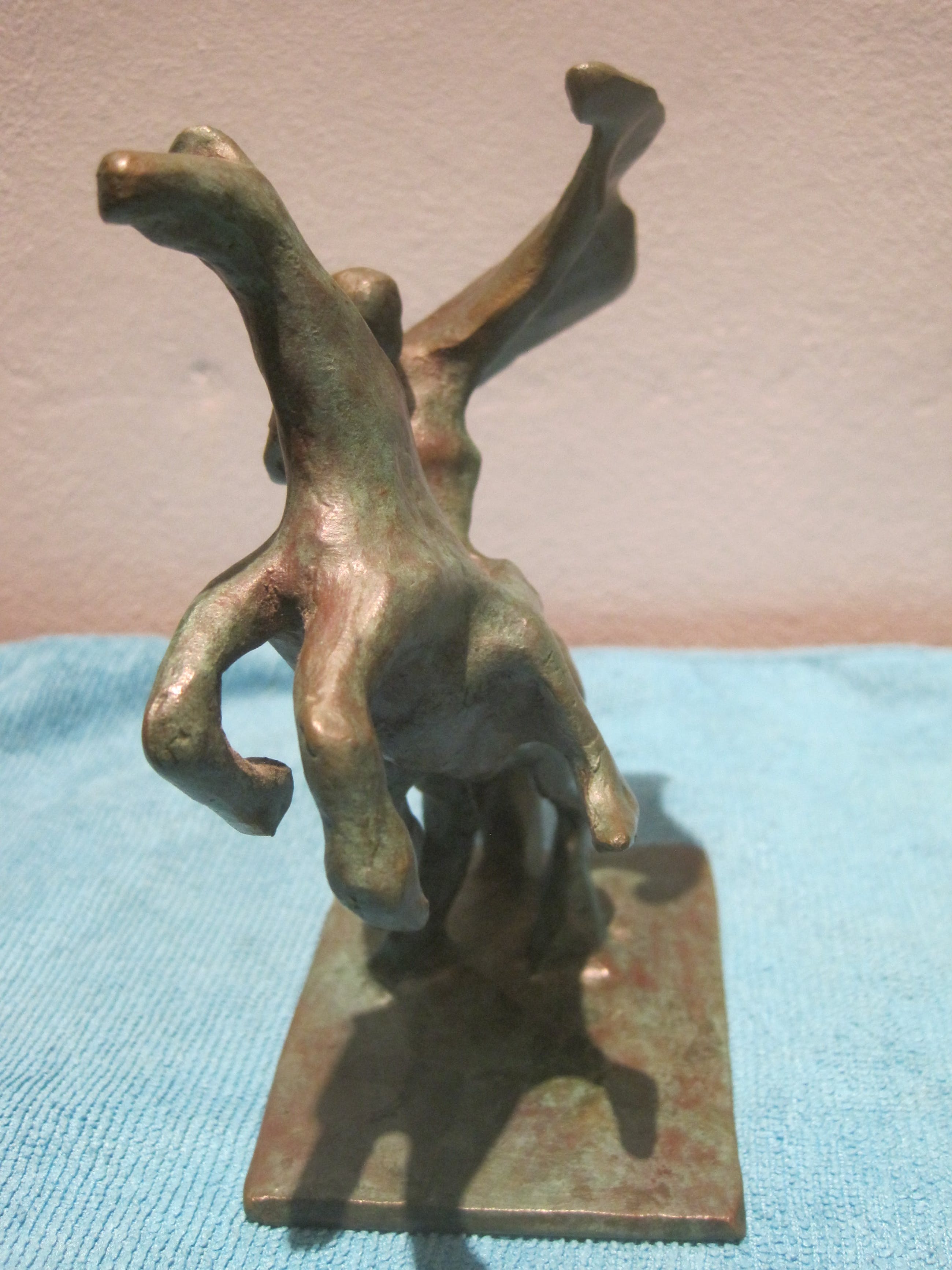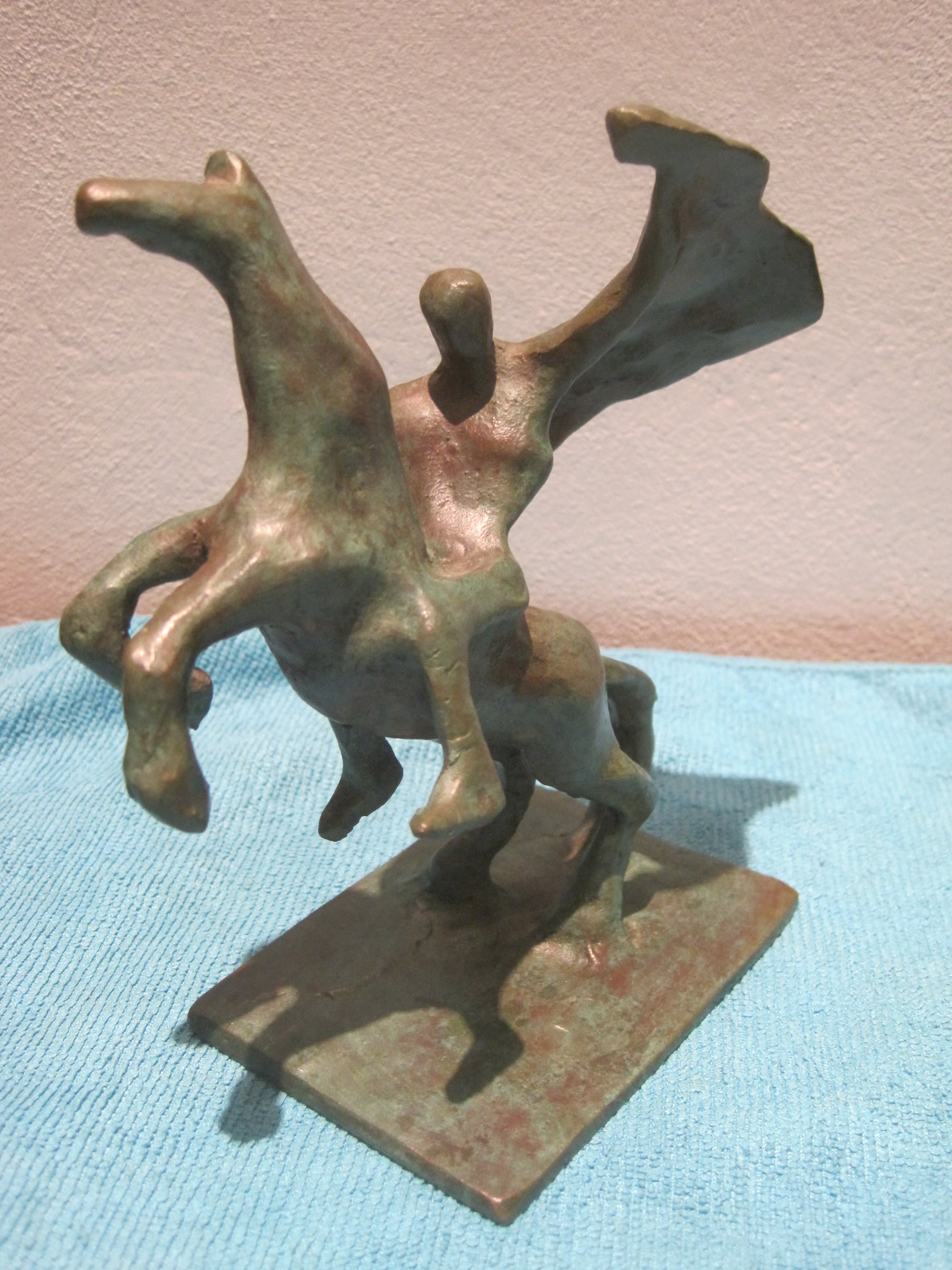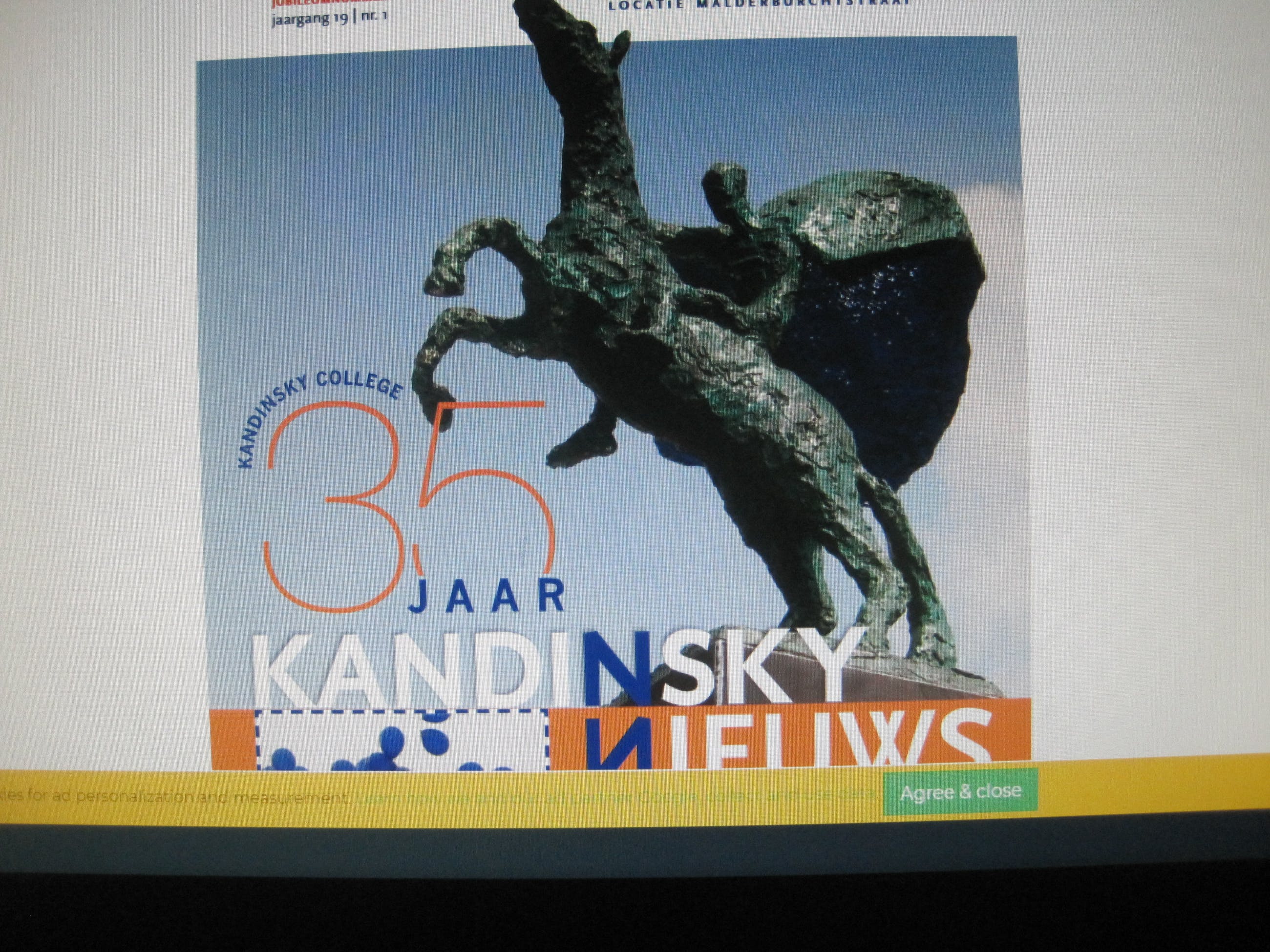 Dynamisch ogend massief bronzen beeldje door Ronald Tolman Dit beeldje is een atelier beeldje gemaakt door Ronald Tolman en is een verkleinde uitgave van het grote bronzen beeld op het plein voor het Kadinsky college te Nijmegen. Stichting De Blauwe Ruiter staat voor ongebreideld optimisme en voor geloof in een mooie toekomst voor alle leerlingen van het Kandinsky College. De naam van onze stichting is een verwijzing naar de naamgever van onze school, Wassily Kandinsky, een groot vernieuwer en een van de grondleggers van de abstracte schilderkunst. ‘Der Blaue Reiter’ was een vernieuwingsbeweging van gelijkgestemde kunstenaars, opgericht door o.a. Wassily Kandinsky. Wie het plein van onze school op loopt, kan het kunstwerk dat onze stichting symboliseert niet missen.( Bron Kadinsky college).
