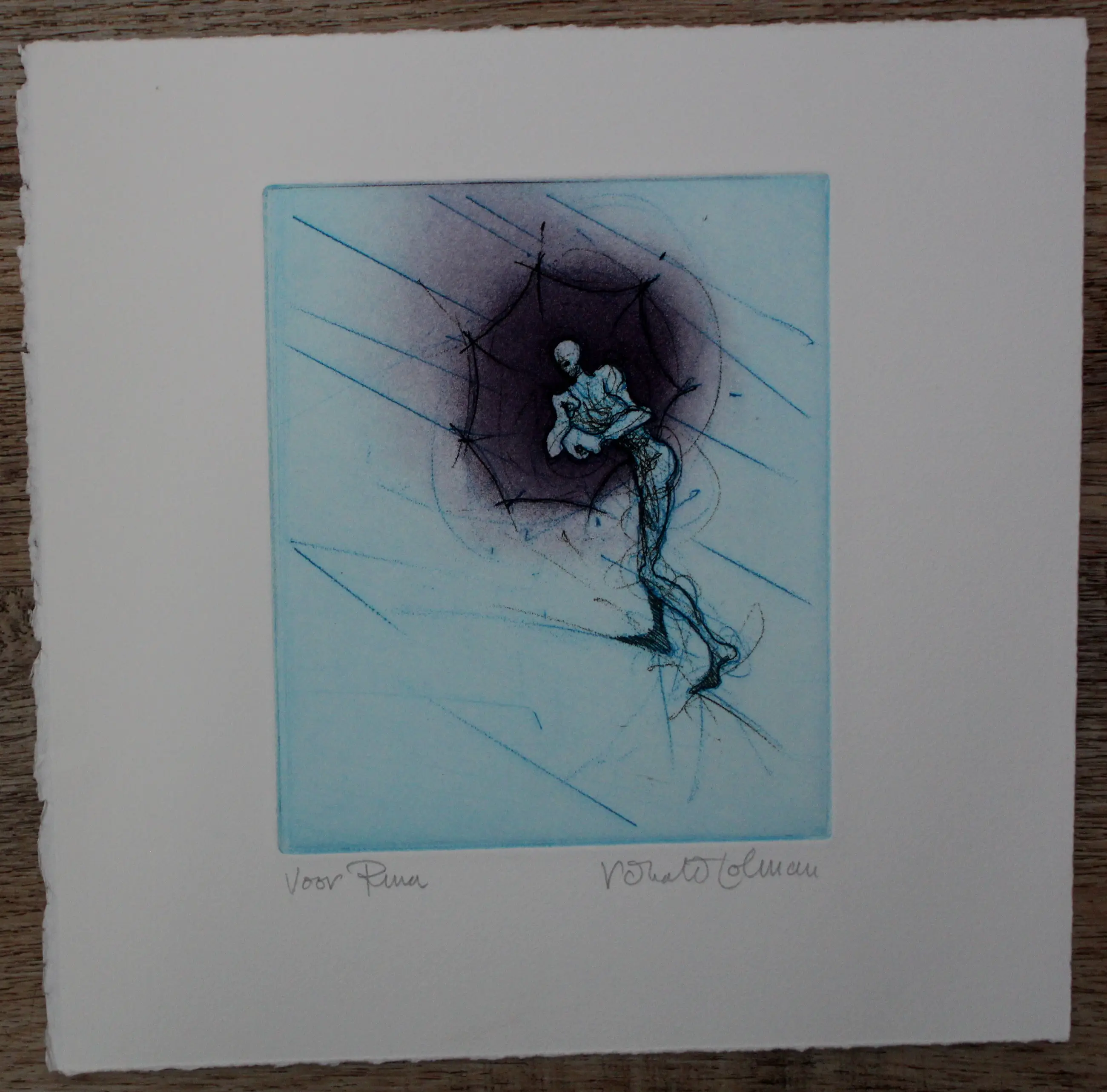Ets van Ronald Tolman. In opdracht: Voor Rina. Rina = Rina Berghuis. Zij is de partner van wijlen Piet Clement. Van alle bladen grafiek,die in de drukkerij op de Prinsengracht ontstonden, ontving zij meestal 1 exemplaar met de opdrach: " Voor Rina". Afmetingen blad: H25 x b25cm. Afmetingen voorstelling: H16 x b13.5cm. Het werk is rechts onderaan met potlood gesigneerd door de kunstenaar. De authenticiteit van het aangeboden werk wordt volledig gegarandeerd. Een certificaat van echtheid kan, op aanvraag, worden gemaild.