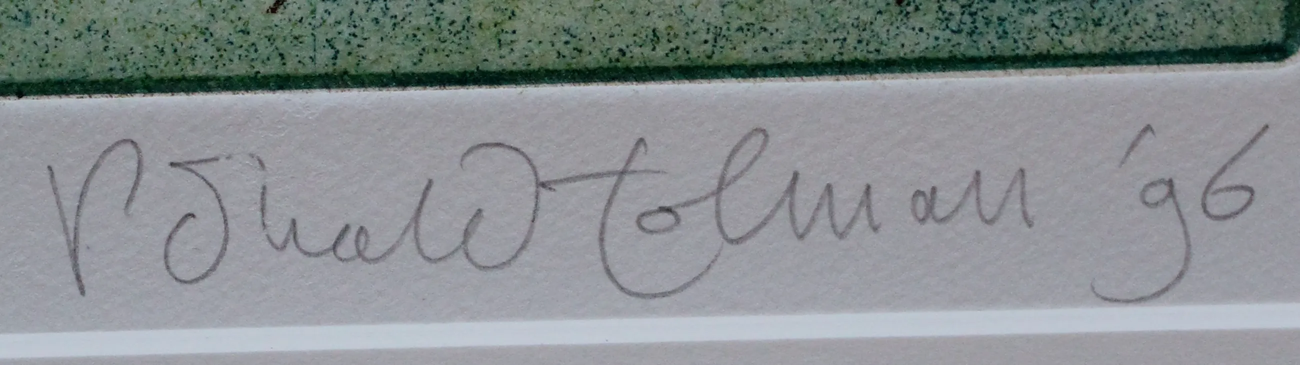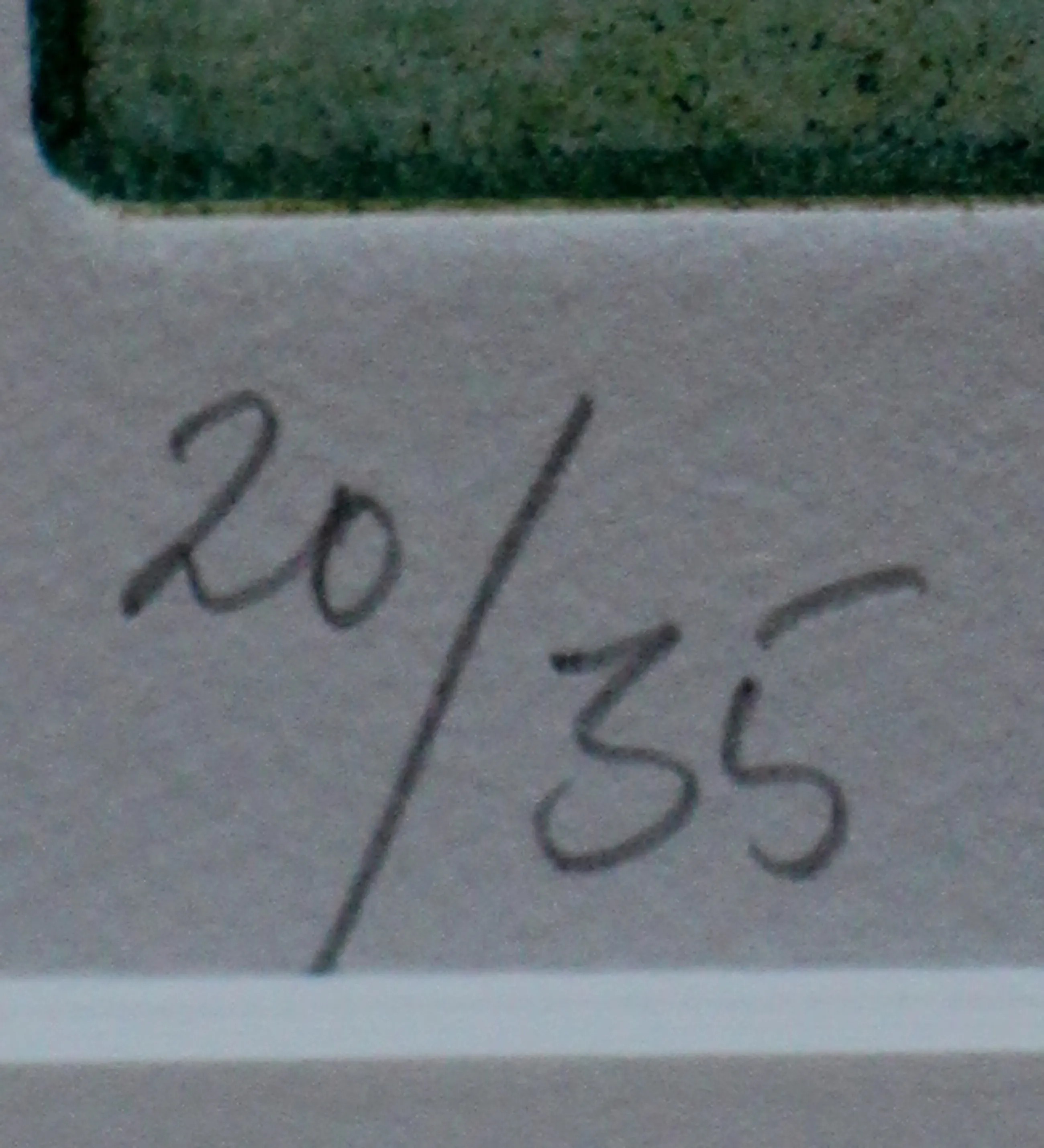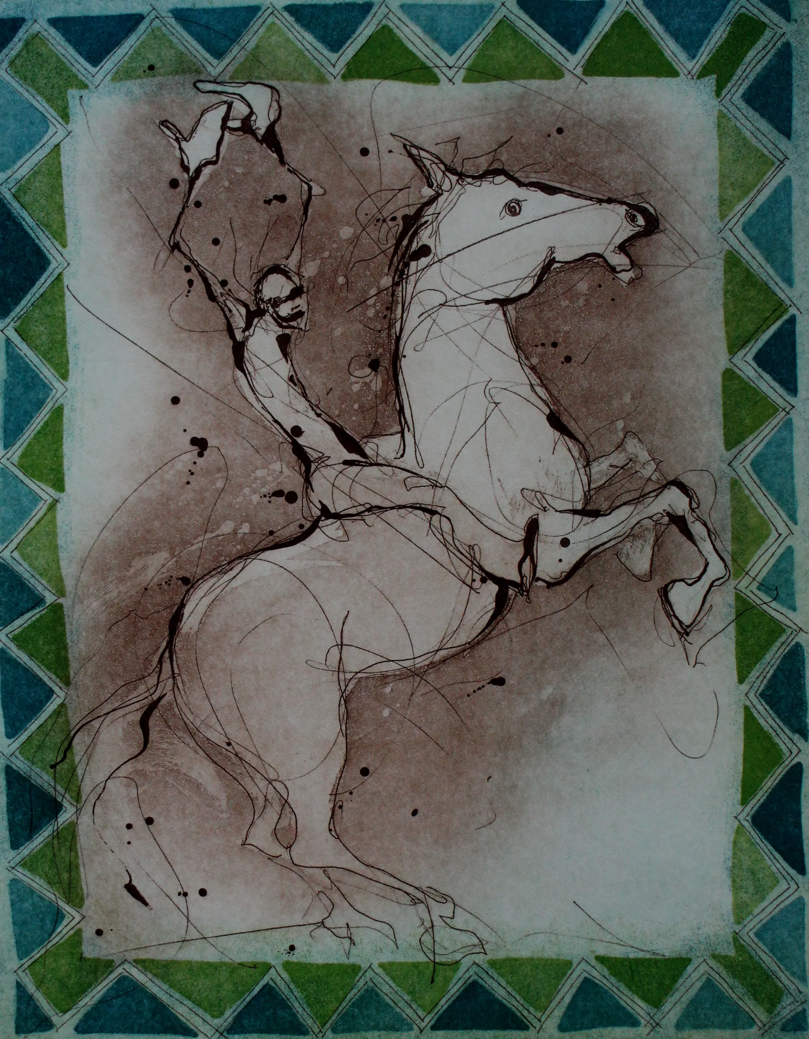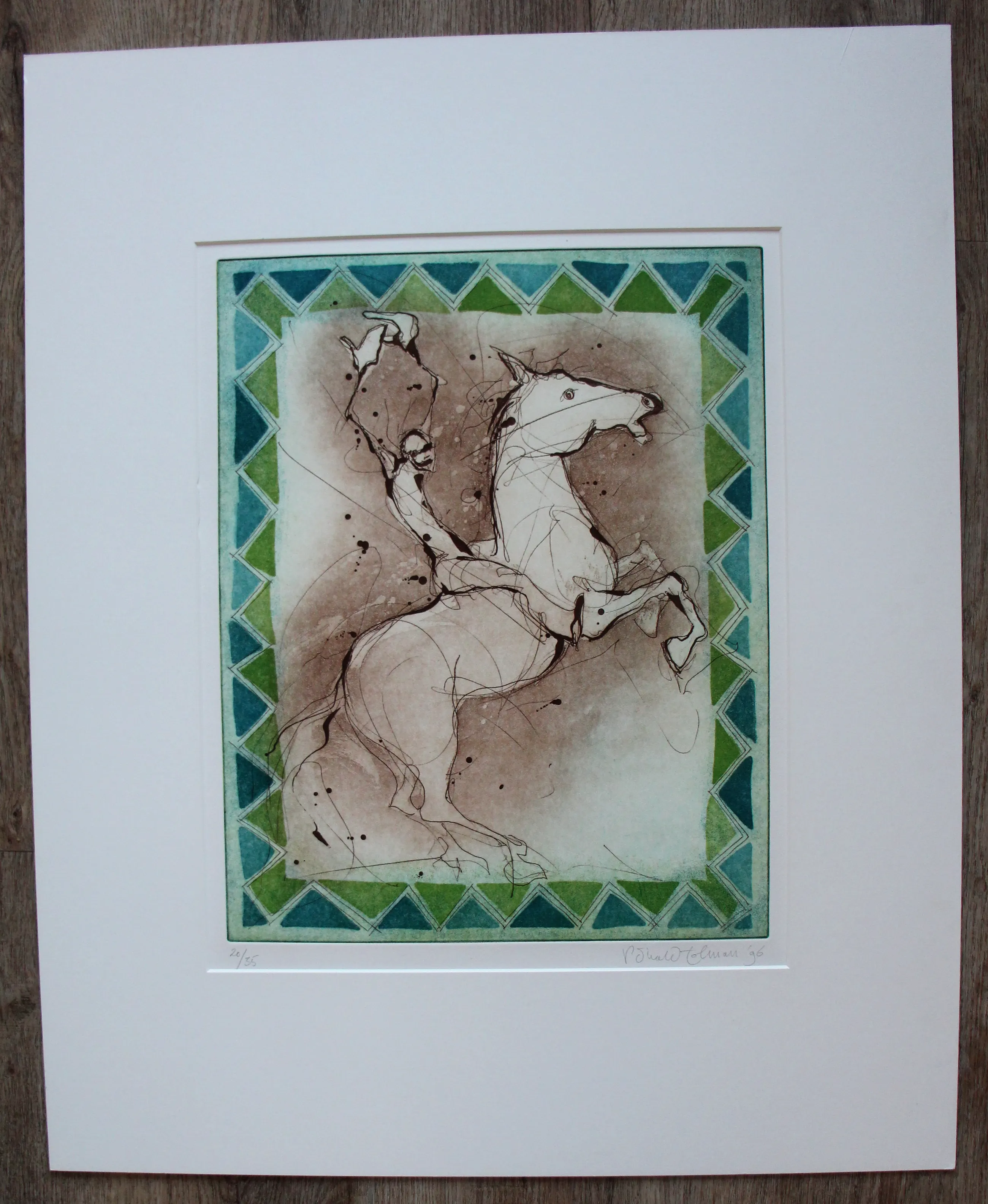 Ets van Ronald Tolman uit 1996. Titel: Man op een steigerend paard zwaaiend met witte vlaggen. Nummer: 20/35. Afmetingen incl passe-partout: H80 x b65cm. Afmetingen voorstelling: H47.5 x b37.5cm. Het werk is rechtsonder gesigneerd en gedateerd door de kunstenaar. De authenticiteit van het aangeboden werk wordt volledig gegarandeerd. Een certificaat van echtheid kan, op aanvraag, worden gemaild.