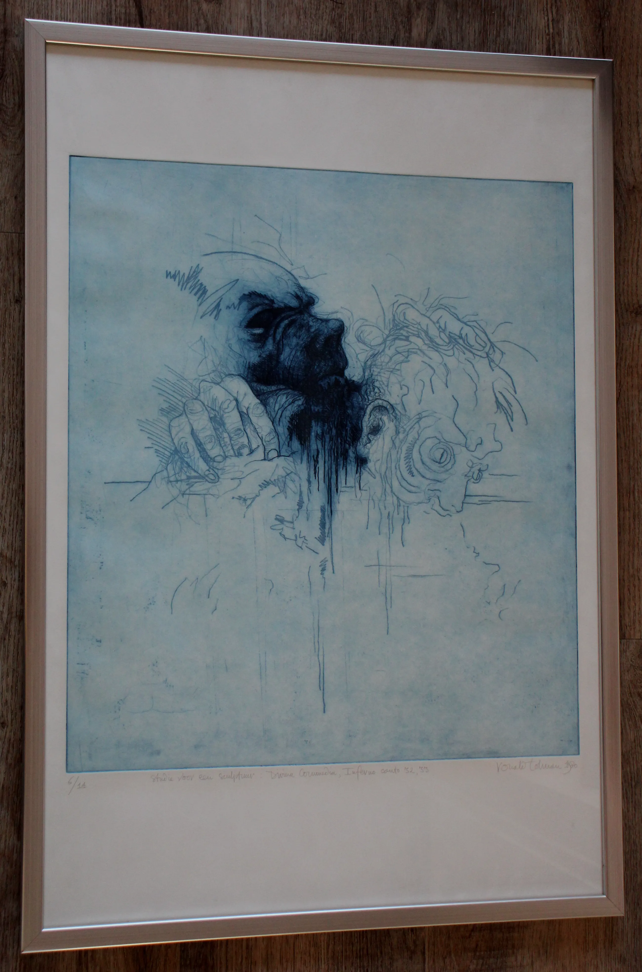 Ingelijste ets van Ronald Tolman uit 1980. Titel: Studie voor een sculptuur - Divinia commedia inferno. Nummer: 6/14. Afmetingen incl lijst: H81.5 x b56cm. Afmetingen voorstelling: H54 x b48cm. Het werk is rechtsonder gesigneerd en gedateerd door de kunstenaar. De authenticiteit van het aangeboden werk wordt volledig gegarandeerd. Een certificaat van echtheid kan, op aanvraag, worden gemaild.