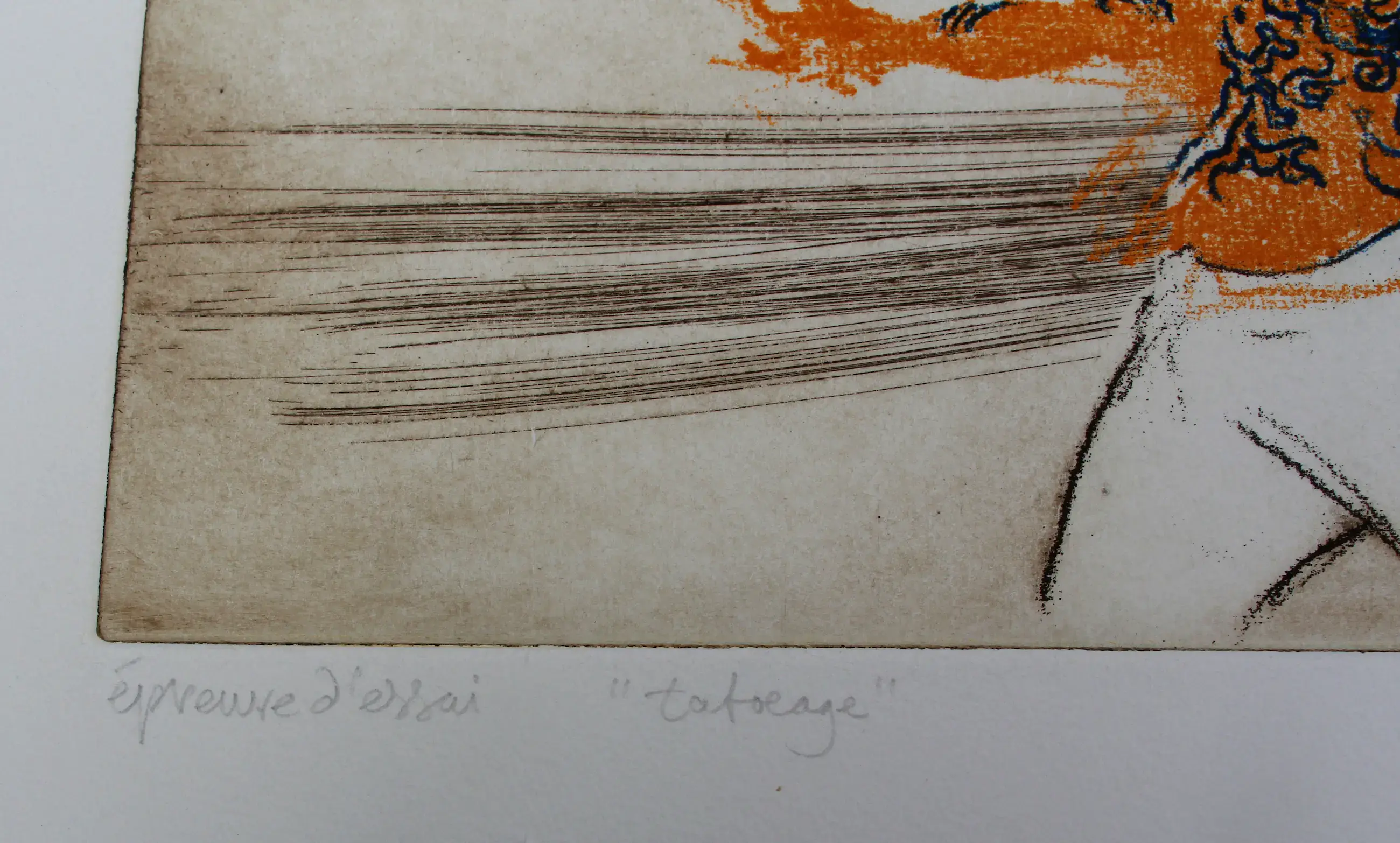 Ets van Ronald Tolman. Titel: Tatoeage. Oplage: Epreuve d'essai. Afmetingen blad: H65 x b50.5cm. Afmetingen voorstelling: H20 x b27 cm. Het werk is rechts onder, met potlood, gesigneerd door de kunstenaar. De authenticiteit van het aangeboden werk wordt volledig gegarandeerd. Een certificaat van echtheid kan, op aanvraag worden gemaild.