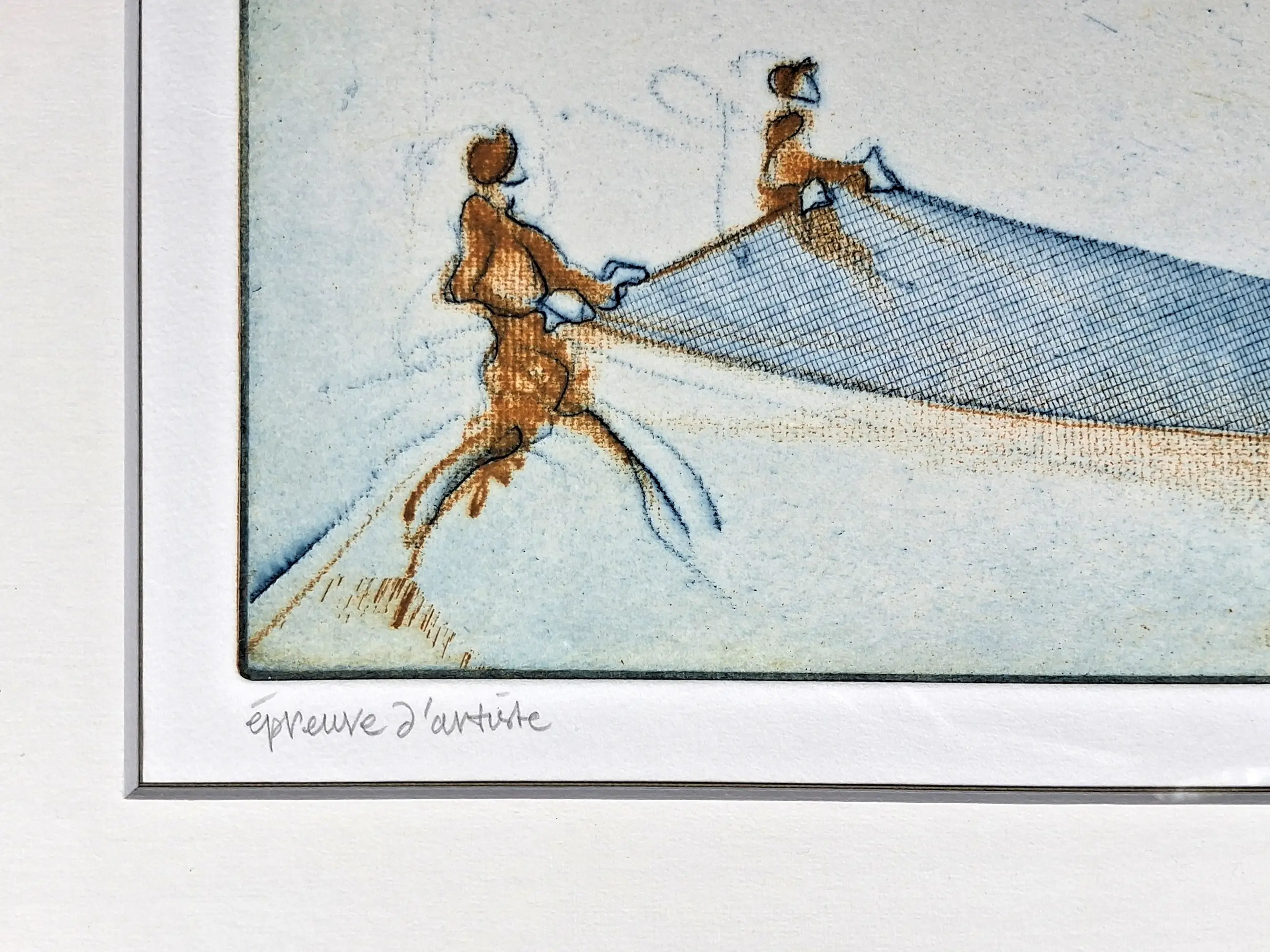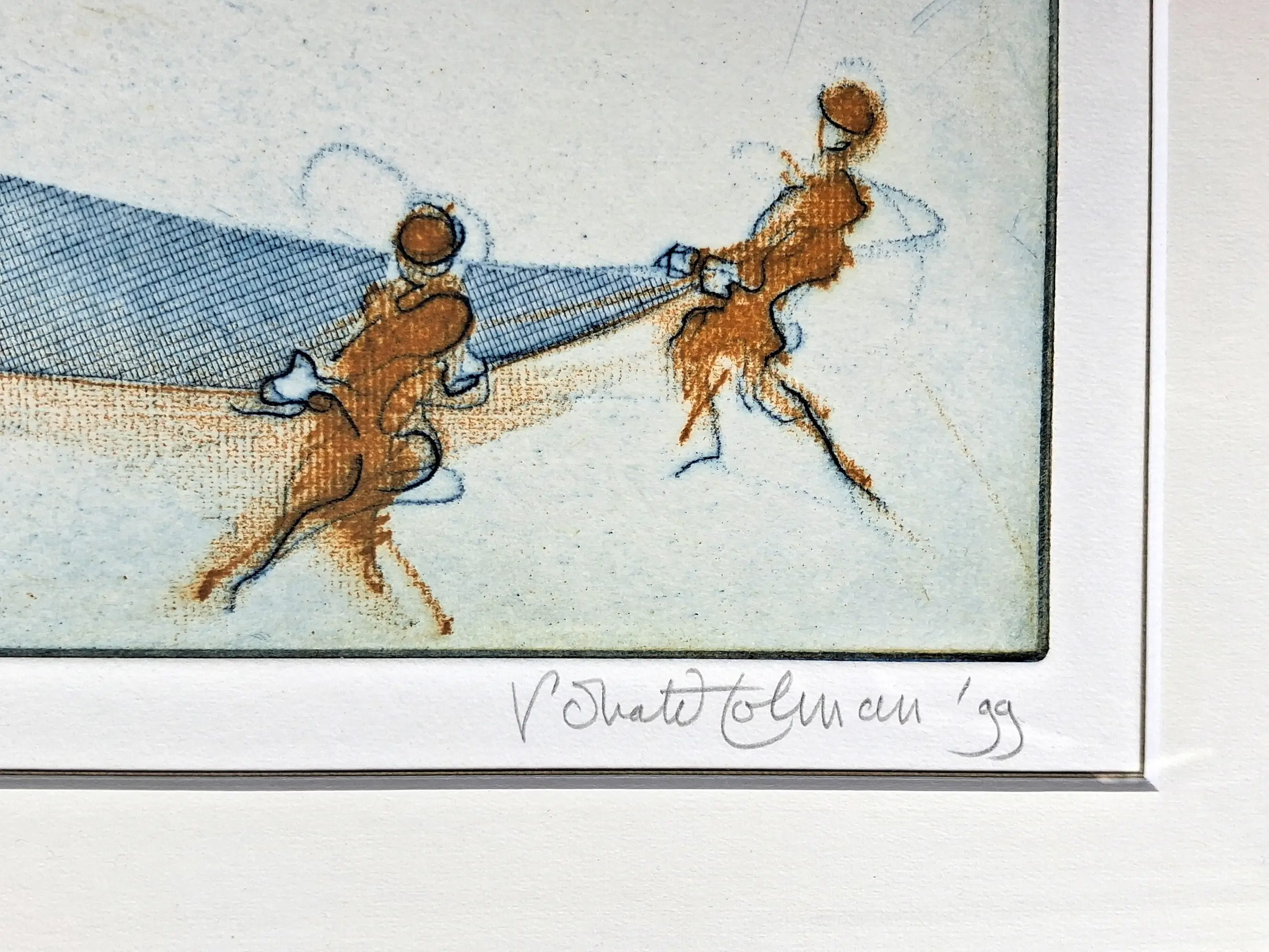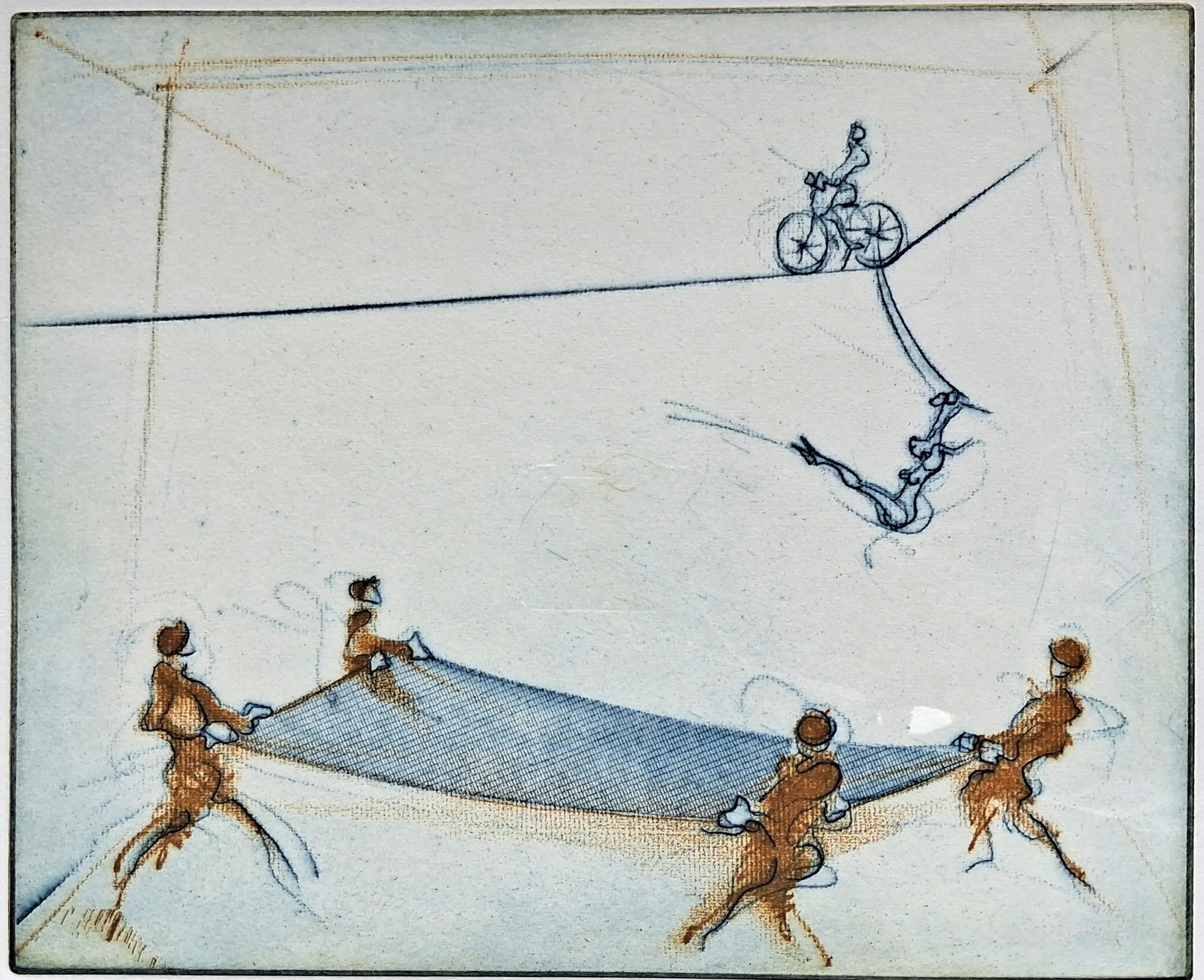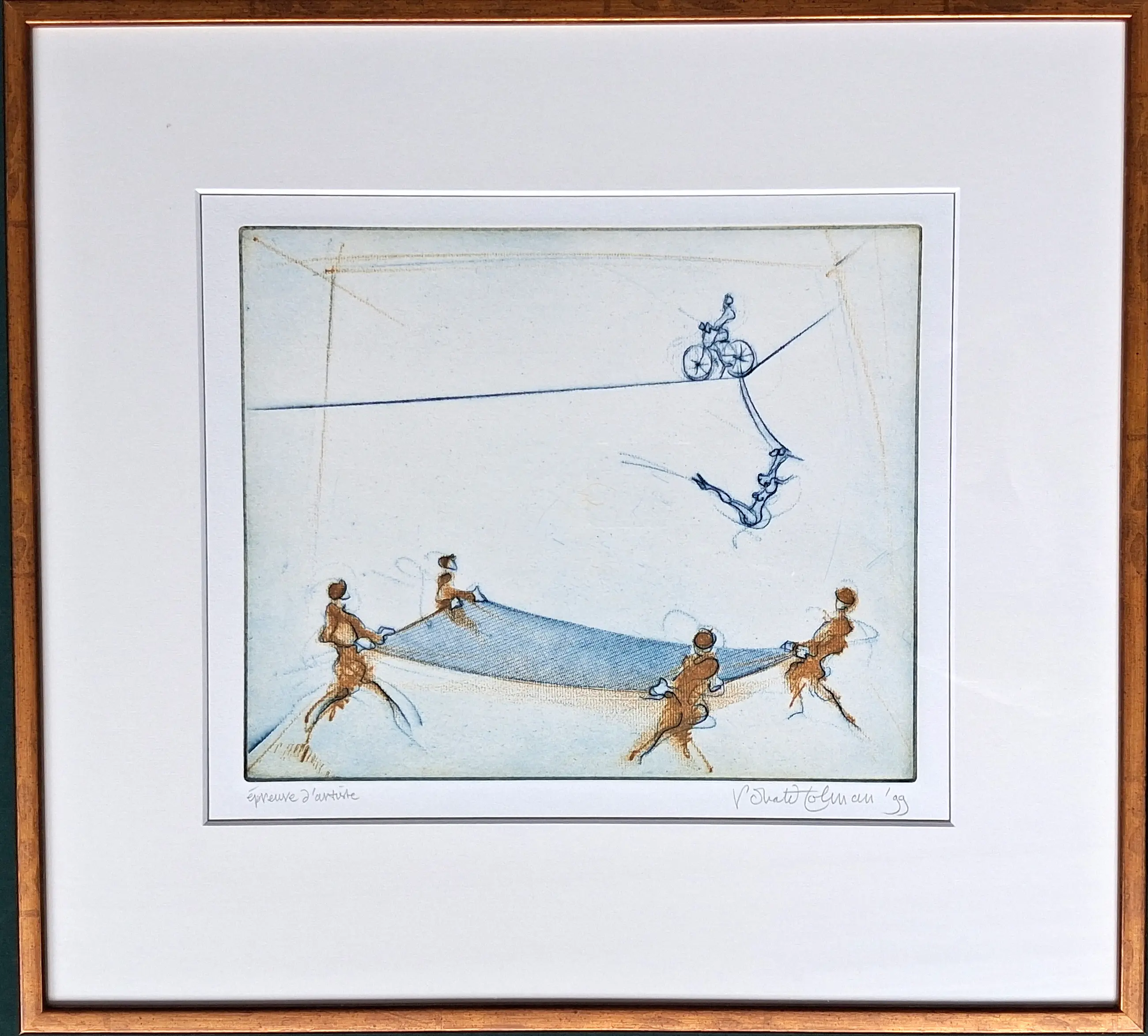 Ets/aquatint van Ronald Tolman, een van de etsen die hij maakte met als thema het circus. Met potlood door de maker gesigneerd, gedateerd en voorzien van annotatie epreuve d'artist. Ingelijst in bronskleurige houten lijst. Het geheel verkeert in nieuwstaat. Op de foto's kunnen reflecties zichtbaar zijn.