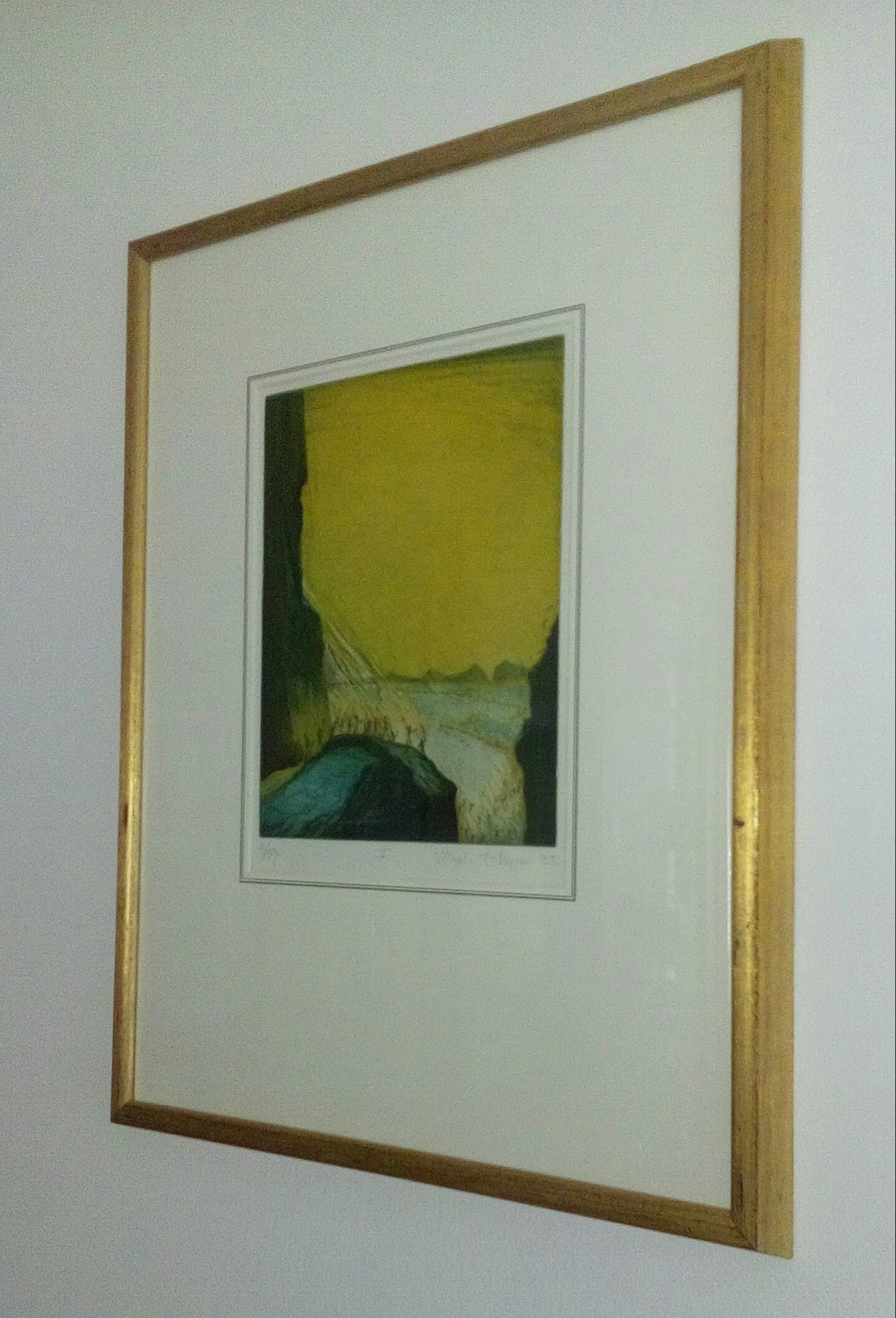 Afmetingen: 30 x 24 cm. Smaakvol ingelijst in goudkleurige houten lijst van 51 x 64 cm.