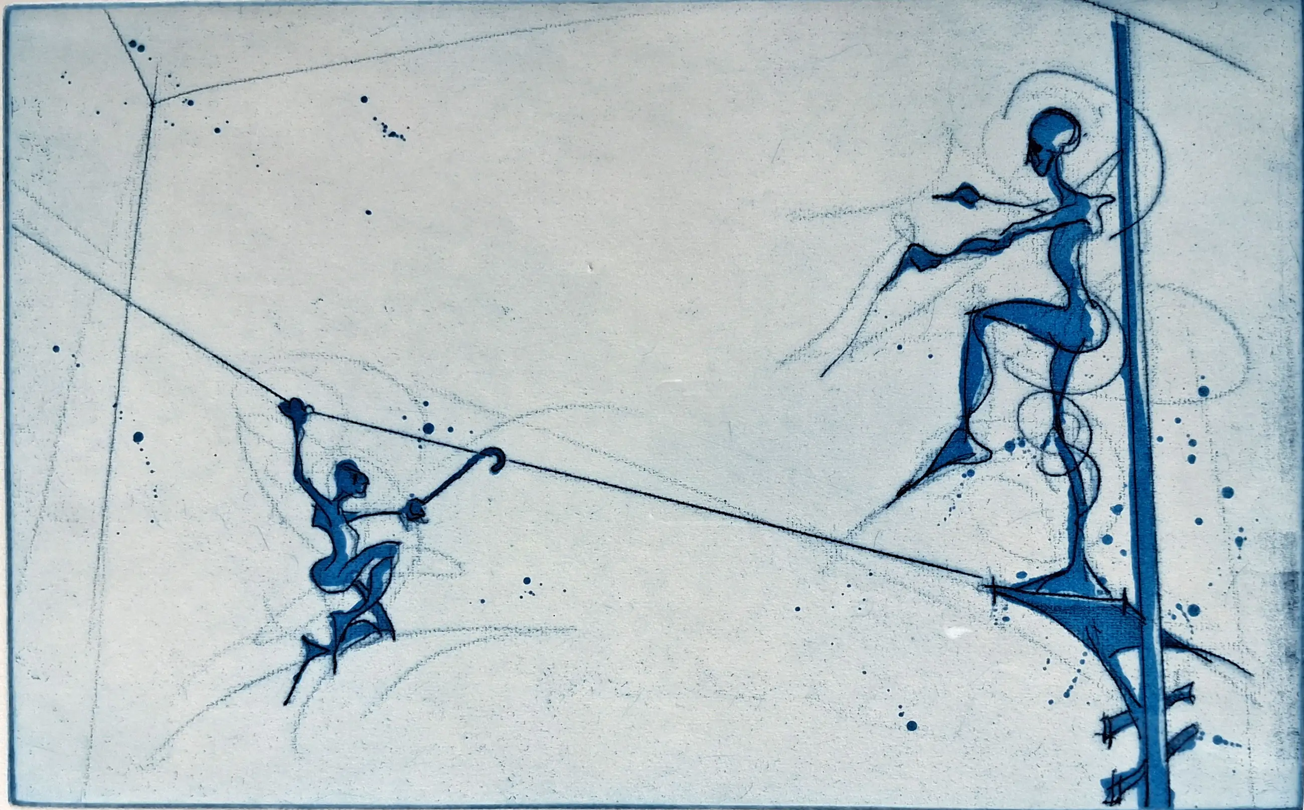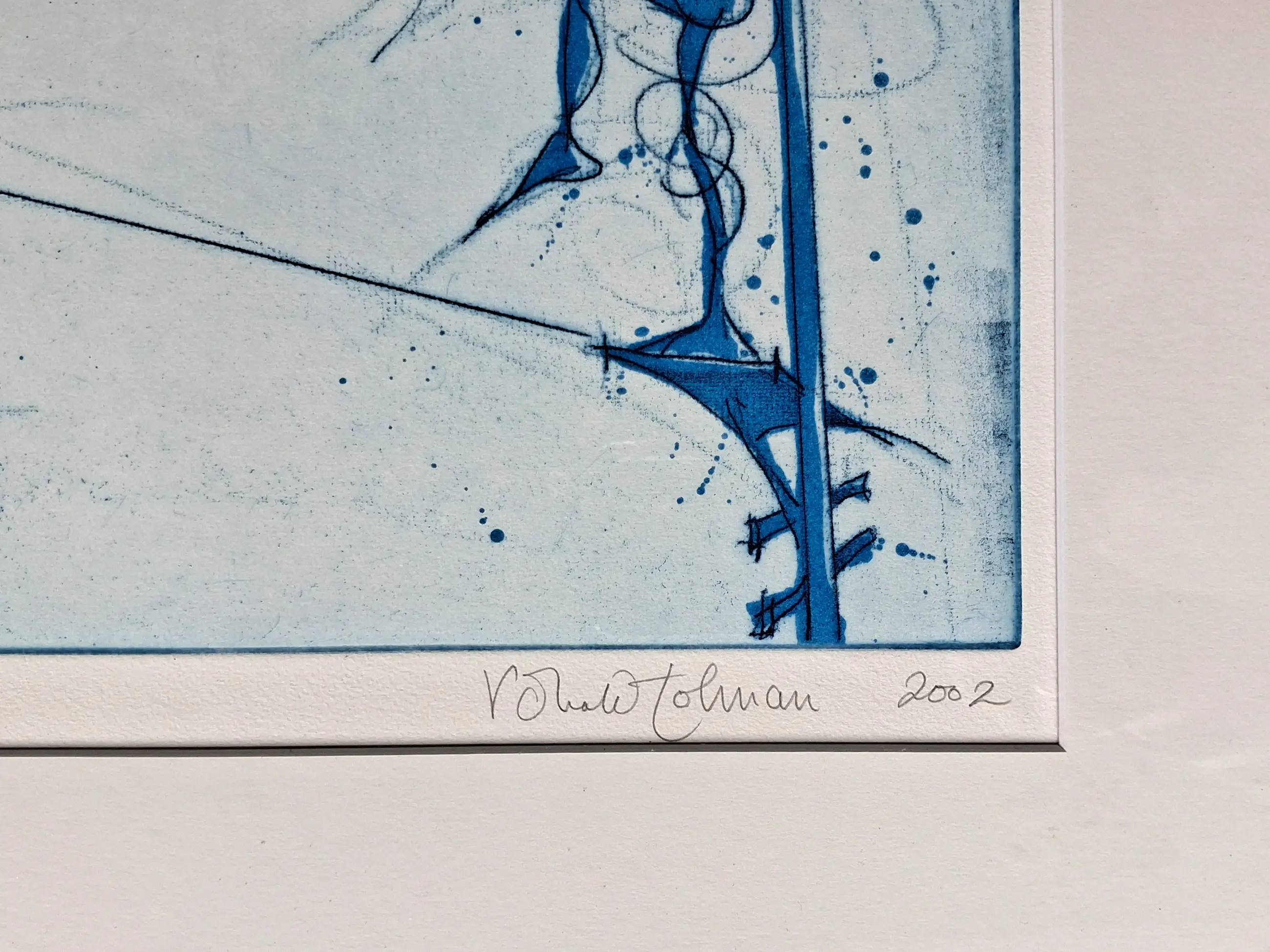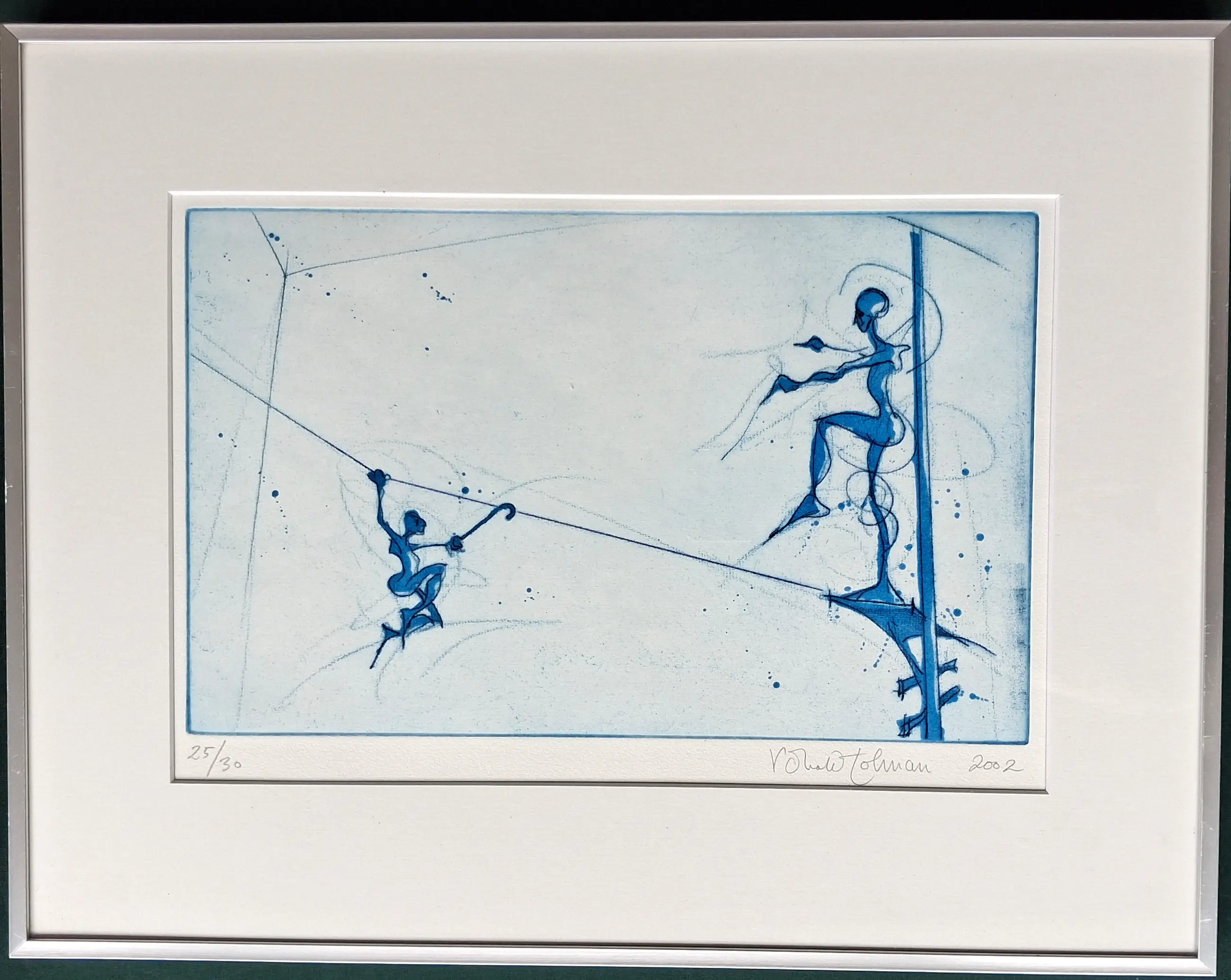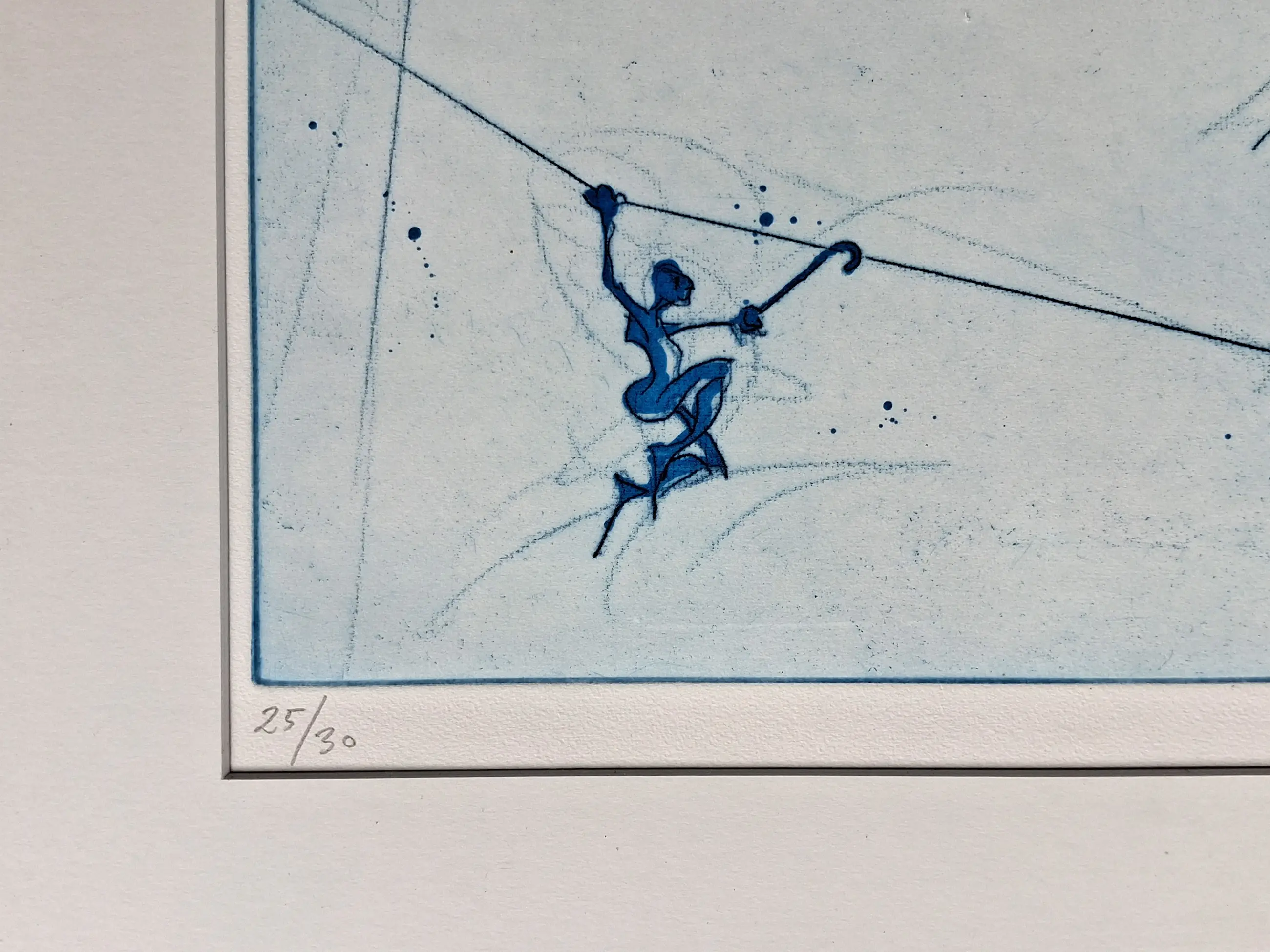 Ets/aquatint van Ronald Tolman, een van de etsen die hij maakte met als thema het circus. Met potlood door de maker gesigneerd, gedateerd en genummerd. Ingelijst in aluminium lijst. Het geheel verkeert in nieuwstaat.