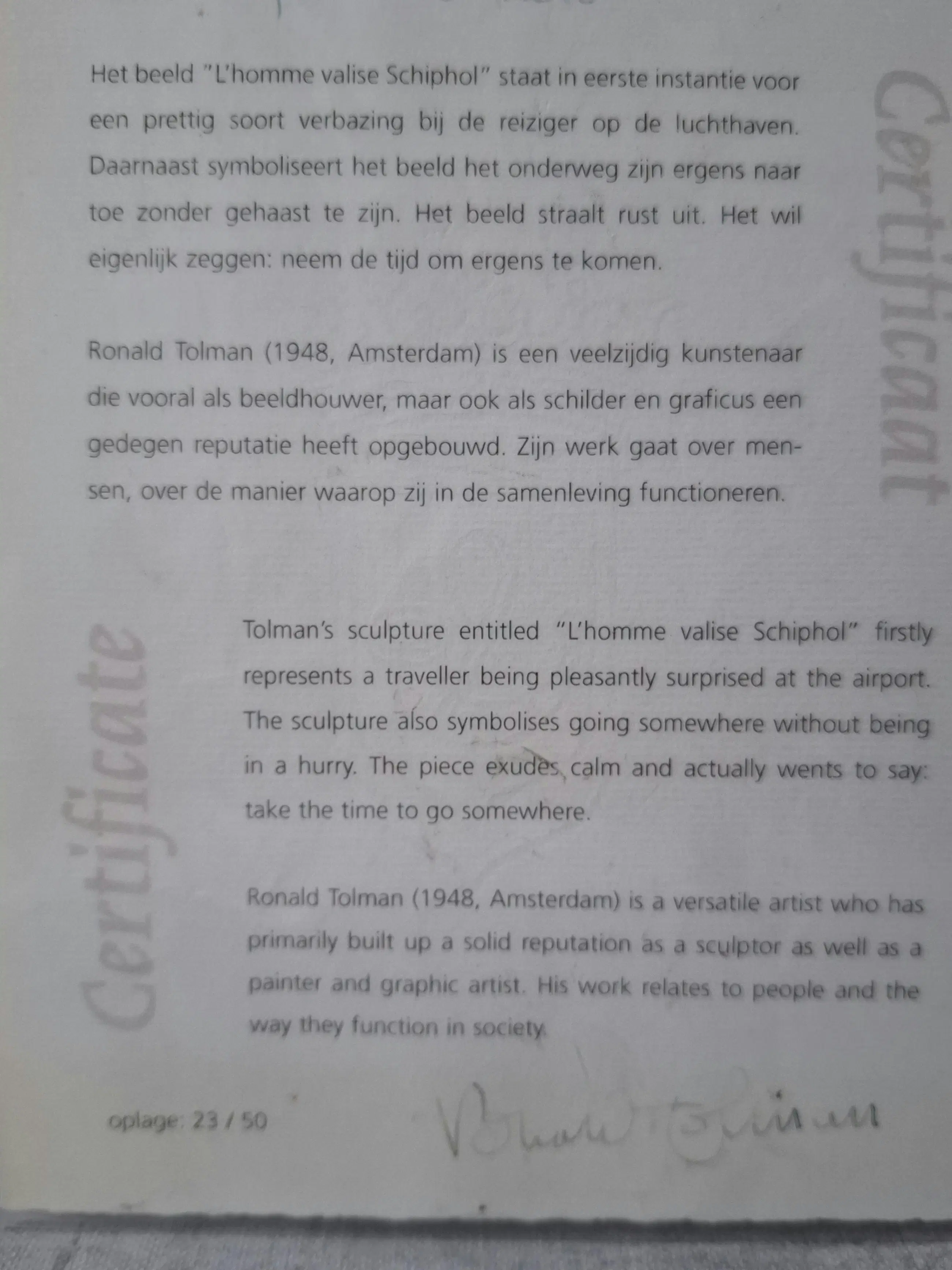 L`homme valise Schiphol van Ronald Tolman Oplage van 50 stuks dit is nummer 23. Het werk is gesigneerd. Incl Certificaat ( ingeseald )