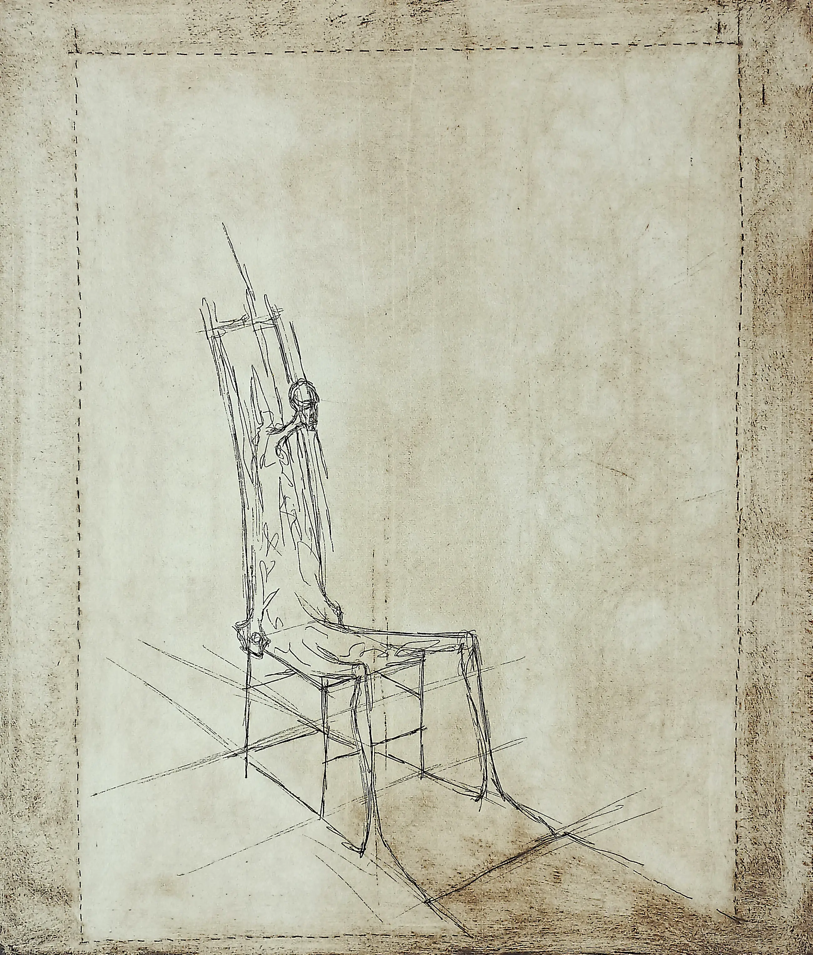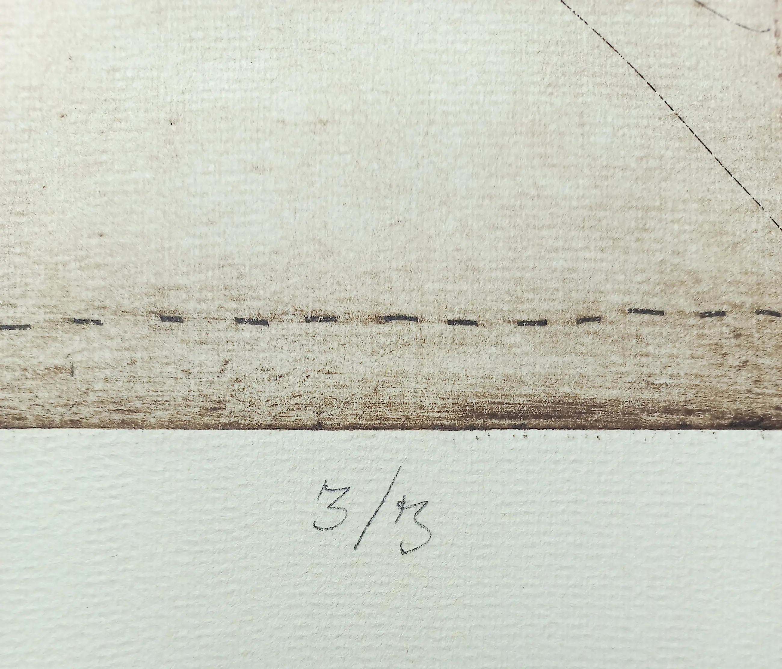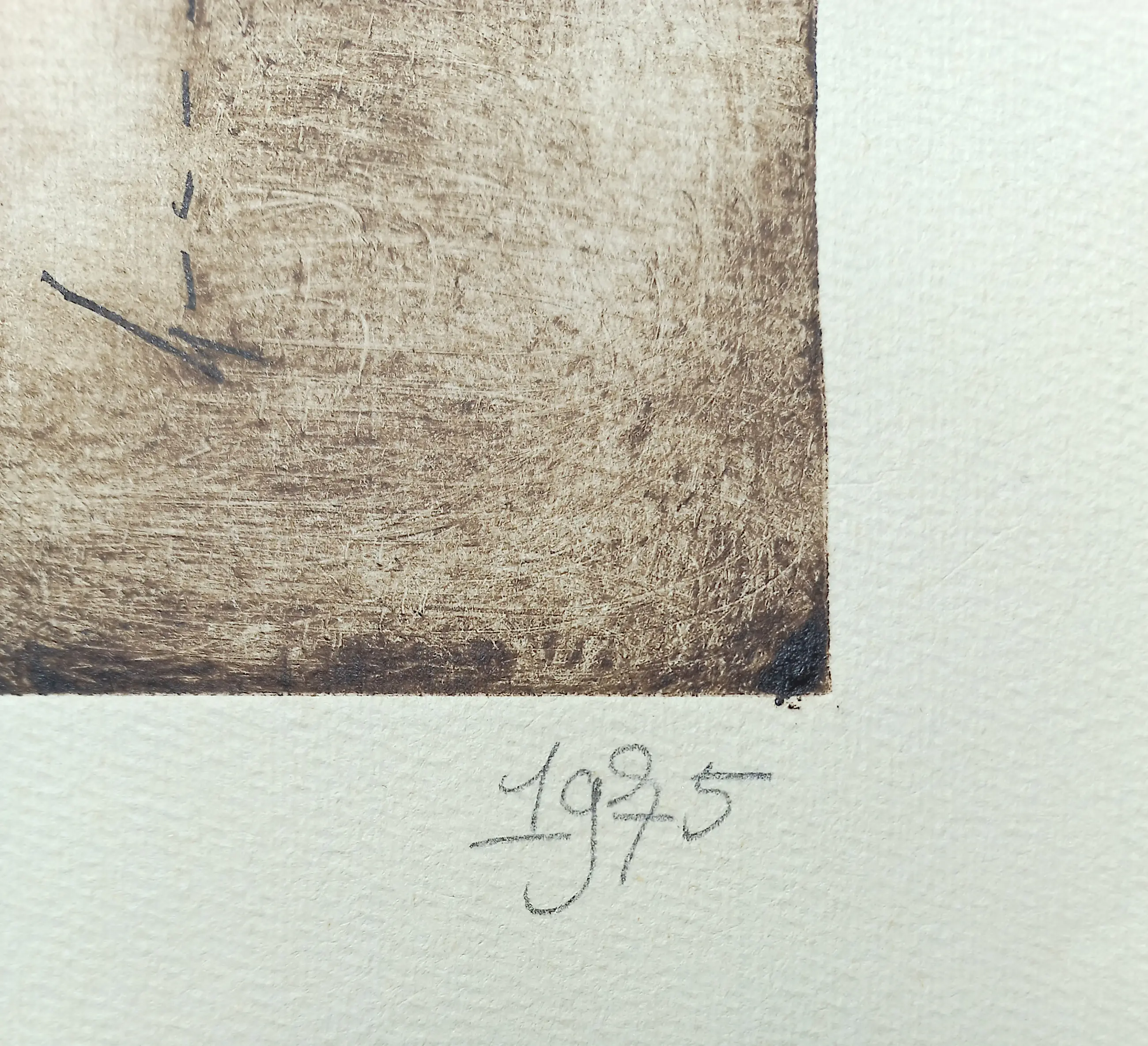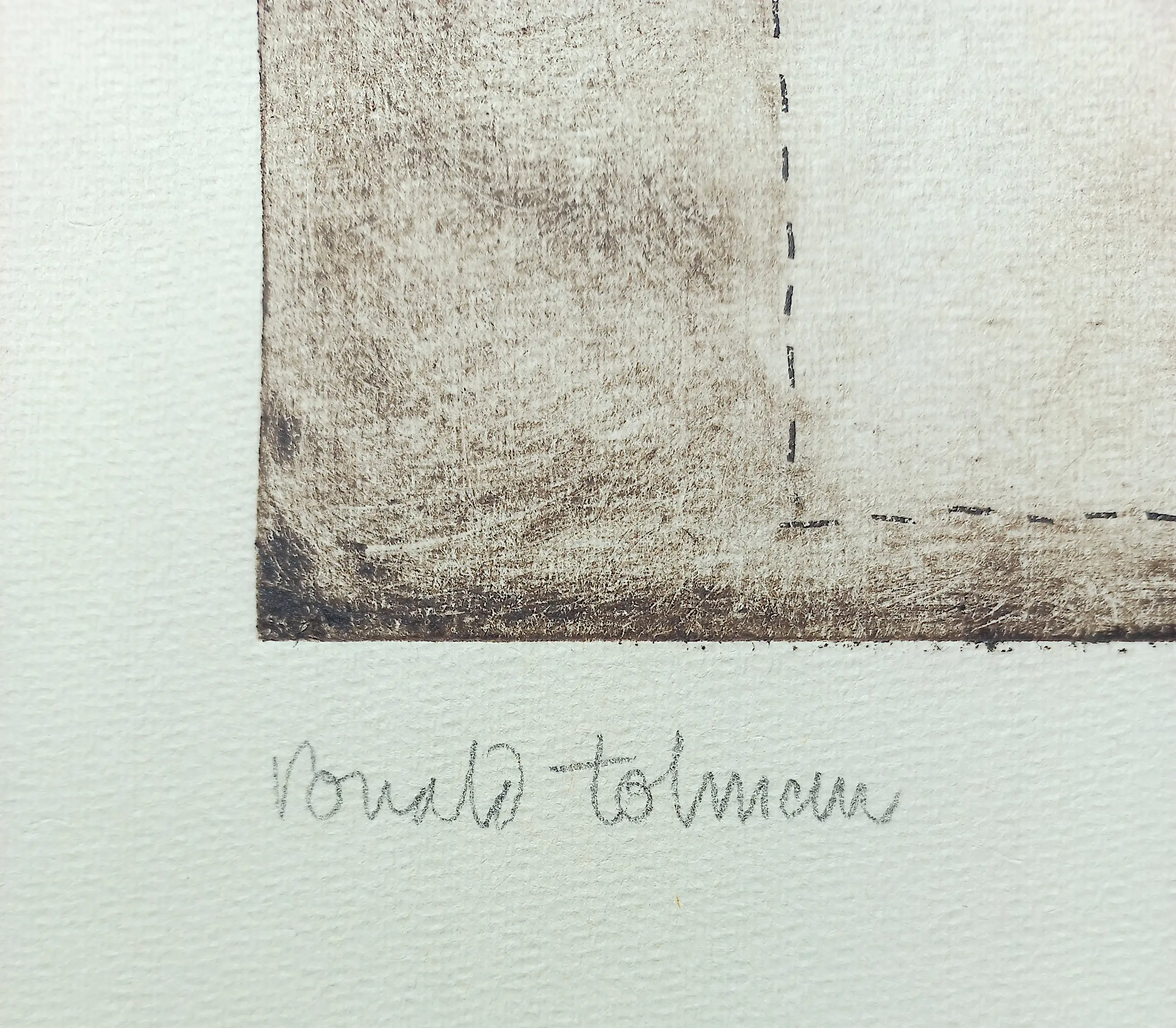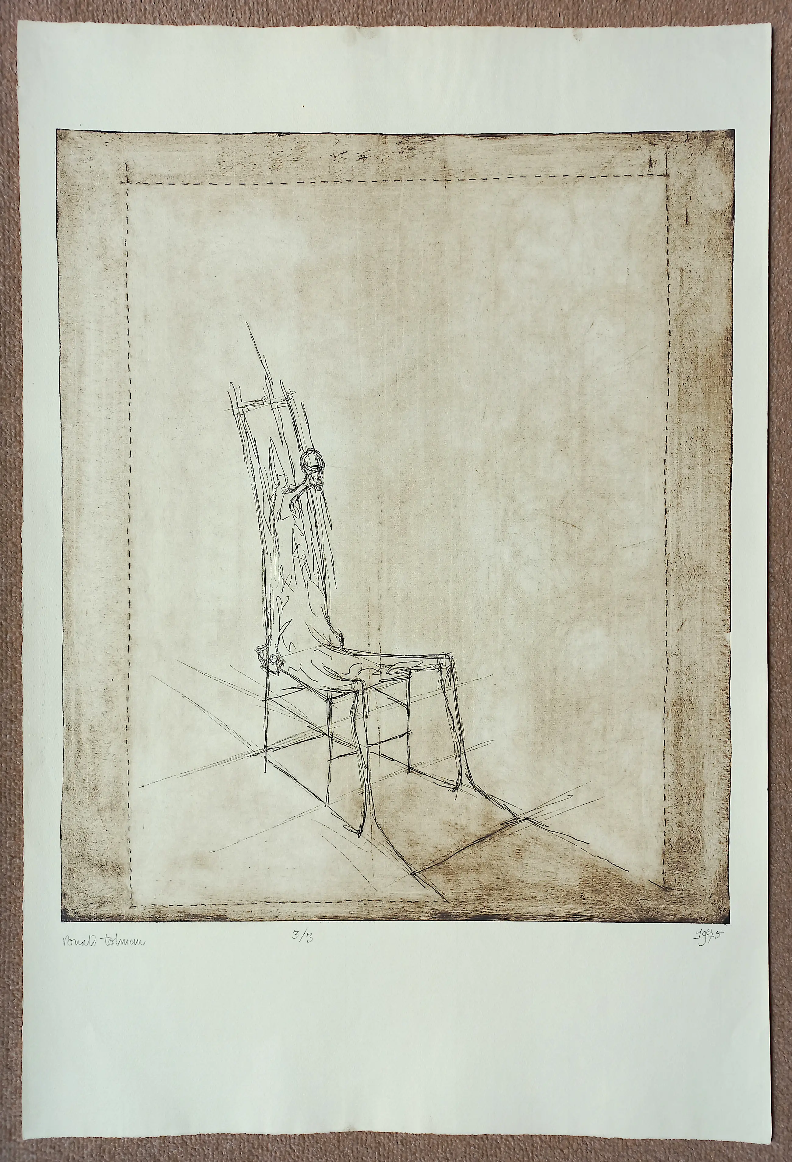 Groot, karakteristiek werk van Ronald Tolman, waarin zijn bewondering voor Giacometti heel duidelijk naar voren komt. Aquatint ets op crèmekleurig papier, met potlood gesigneerd, gedateerd (1975) en genummerd (3/3). In zeer goede conditie.