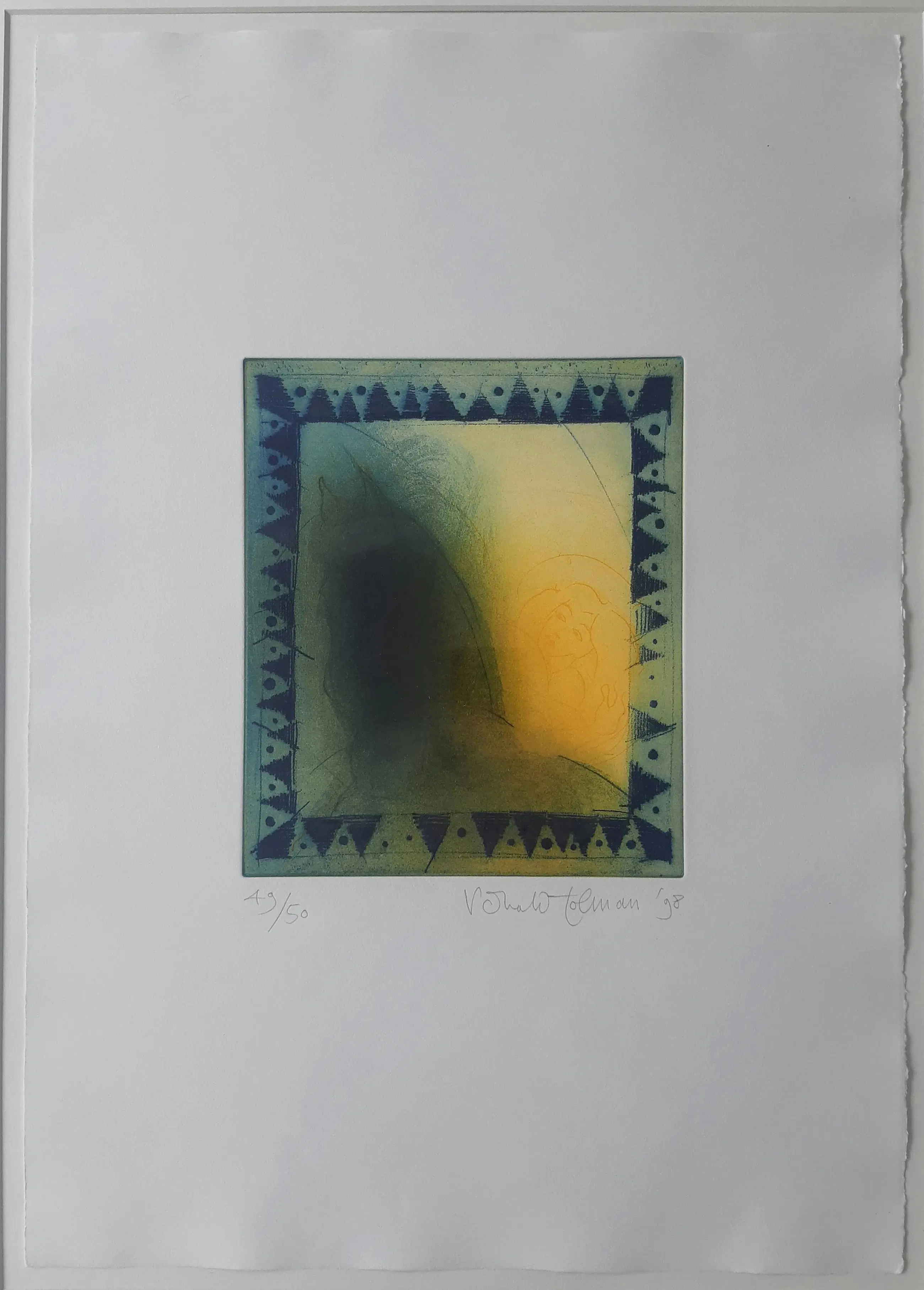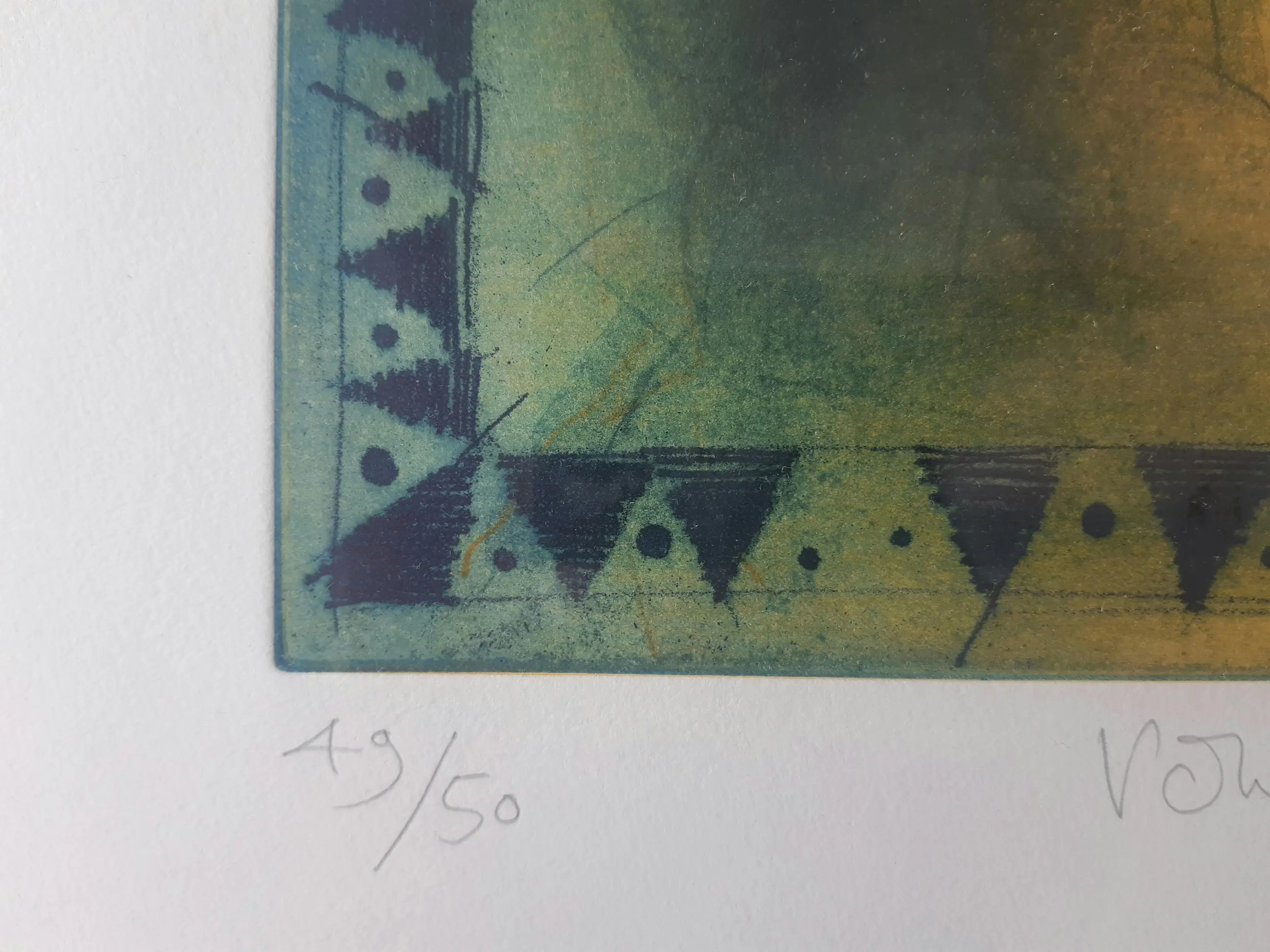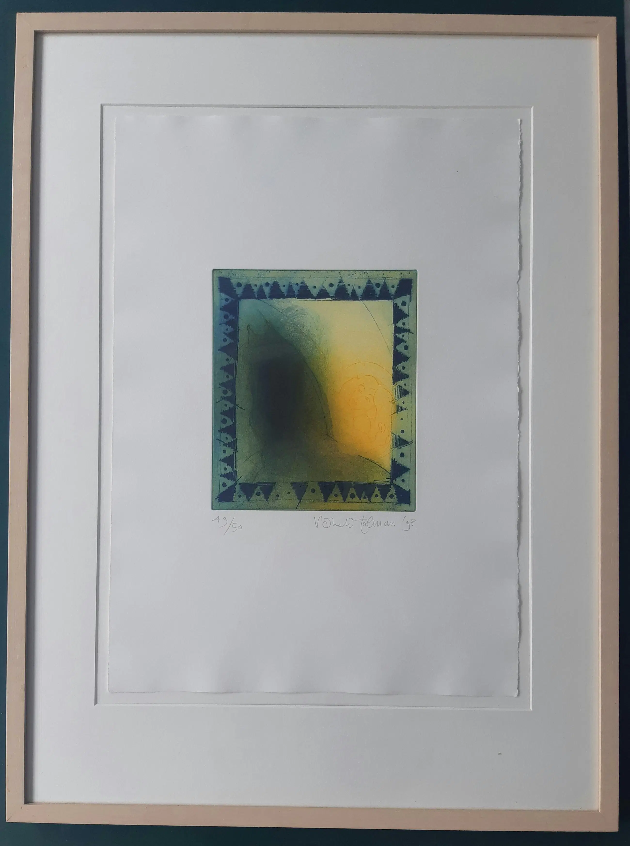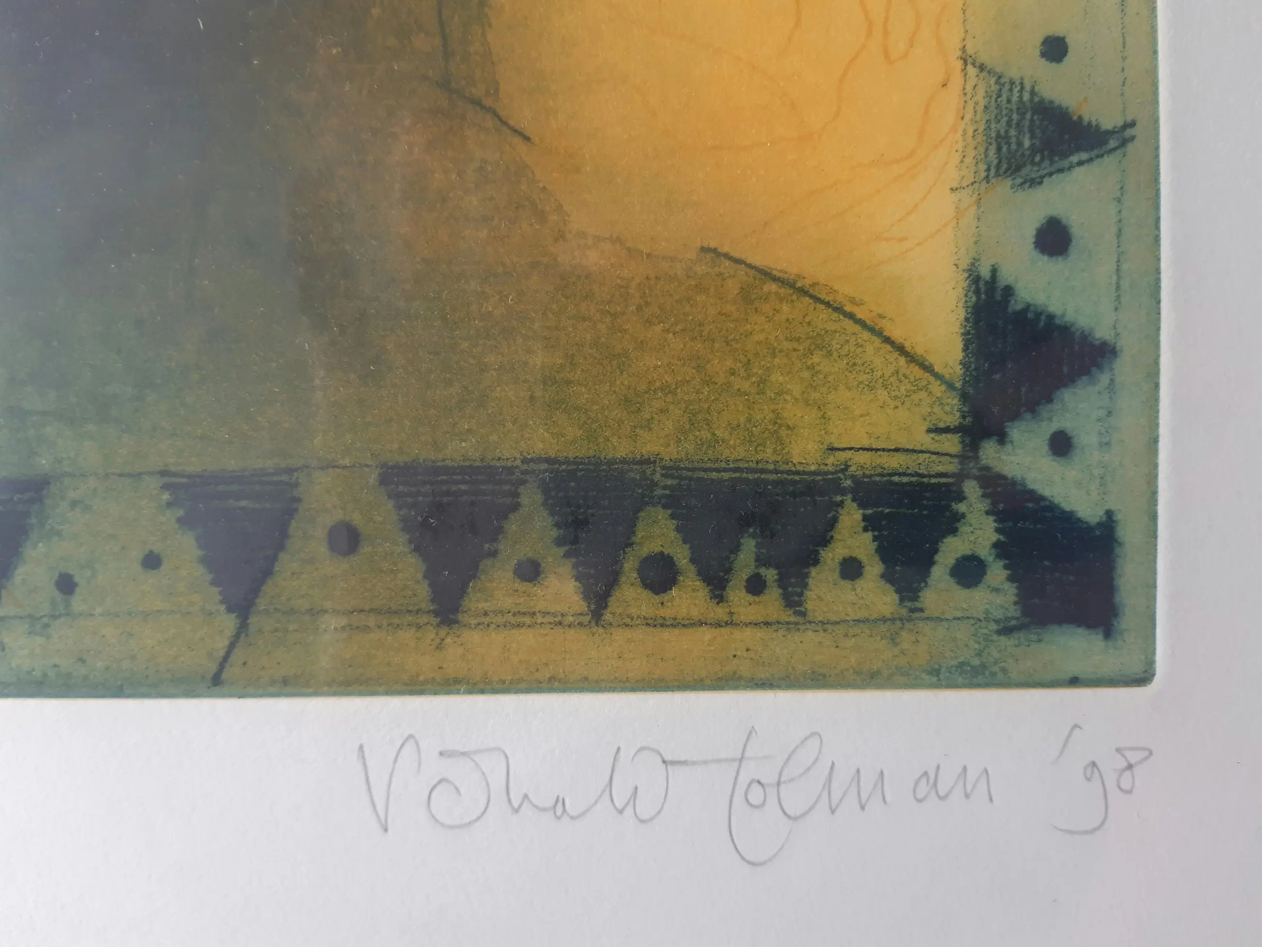 Titelloze ets van Ronald Tolman, met potlood door de maker gesigneerd, gedateerd en genummerd. Ingelijst in fraaie houten lijst. Het geheel verkeert in nieuwstaat. Op de foto's kunnen reflecties zichbaar zijn. De ets kan zonder kosten worden opgehaald in Utrecht of Breda.