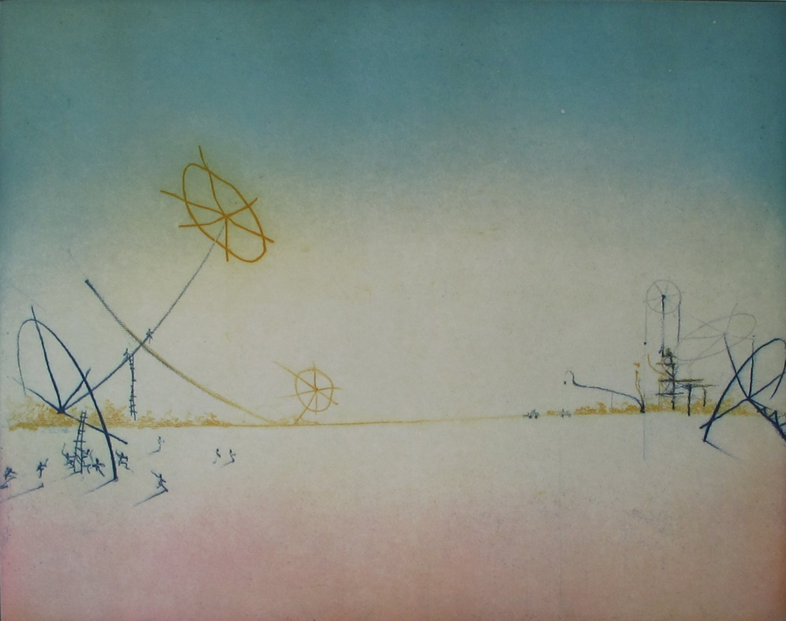Ets van Ronald Tolman uit de horizonmachine-serie, handgesigneerd en voorzien van een passepartout. De beeldmaat van het werk is 49-38,5 cm. De buitenmaat van het passepartout is 70-60 cm. Beide verkeren in een uitstekend conditie. Graag ophalen.