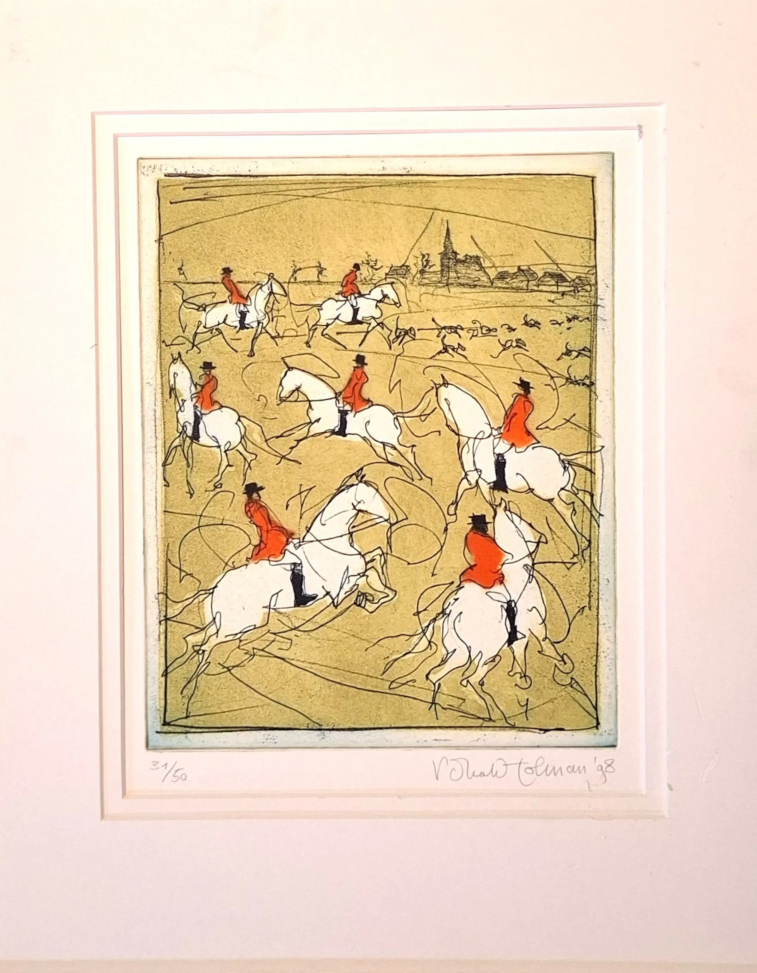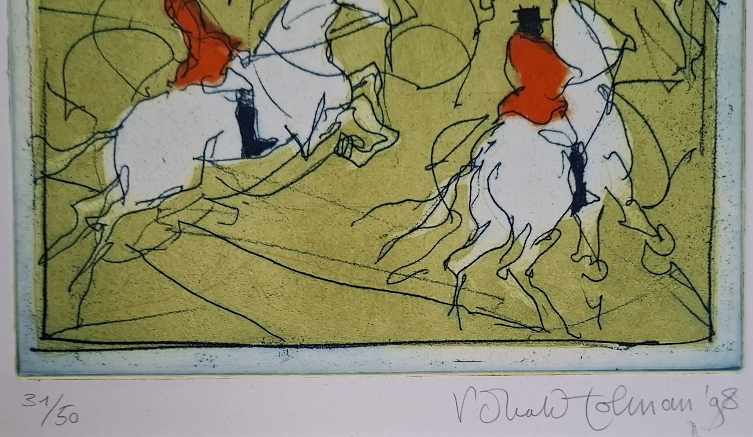 Uniek jachttafereel van Ronald Tolman. Ets oplage 31/50 Jaar 1998 De prent heeft een mooie grijze houten lijst. De prent wordt verzonden zonder glas.