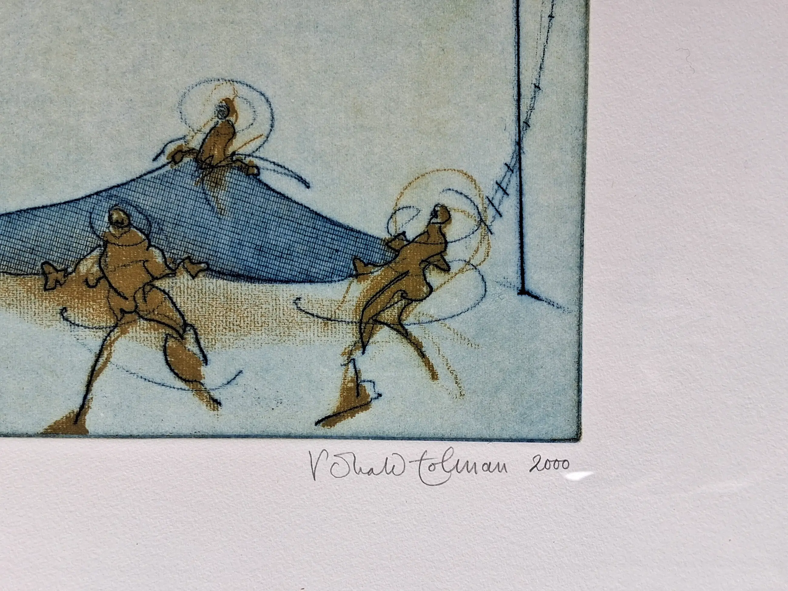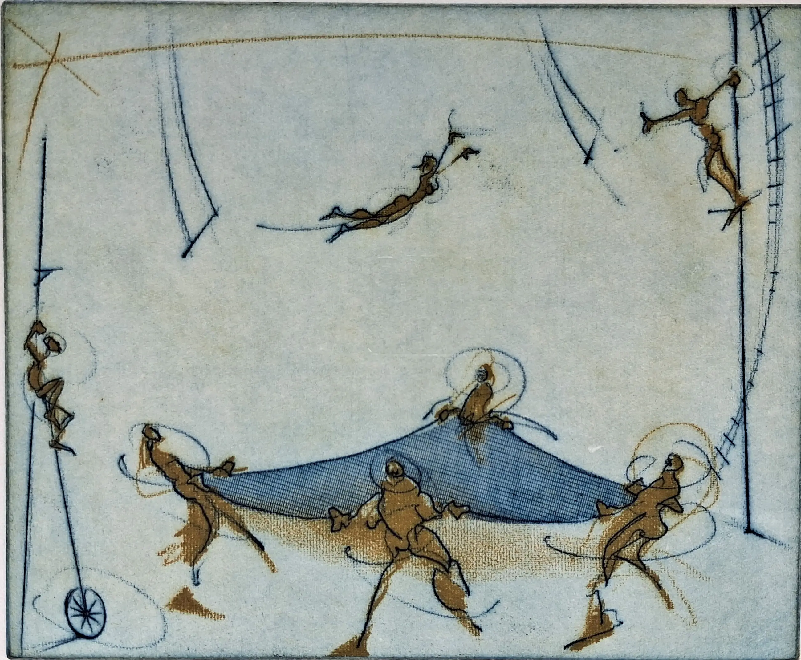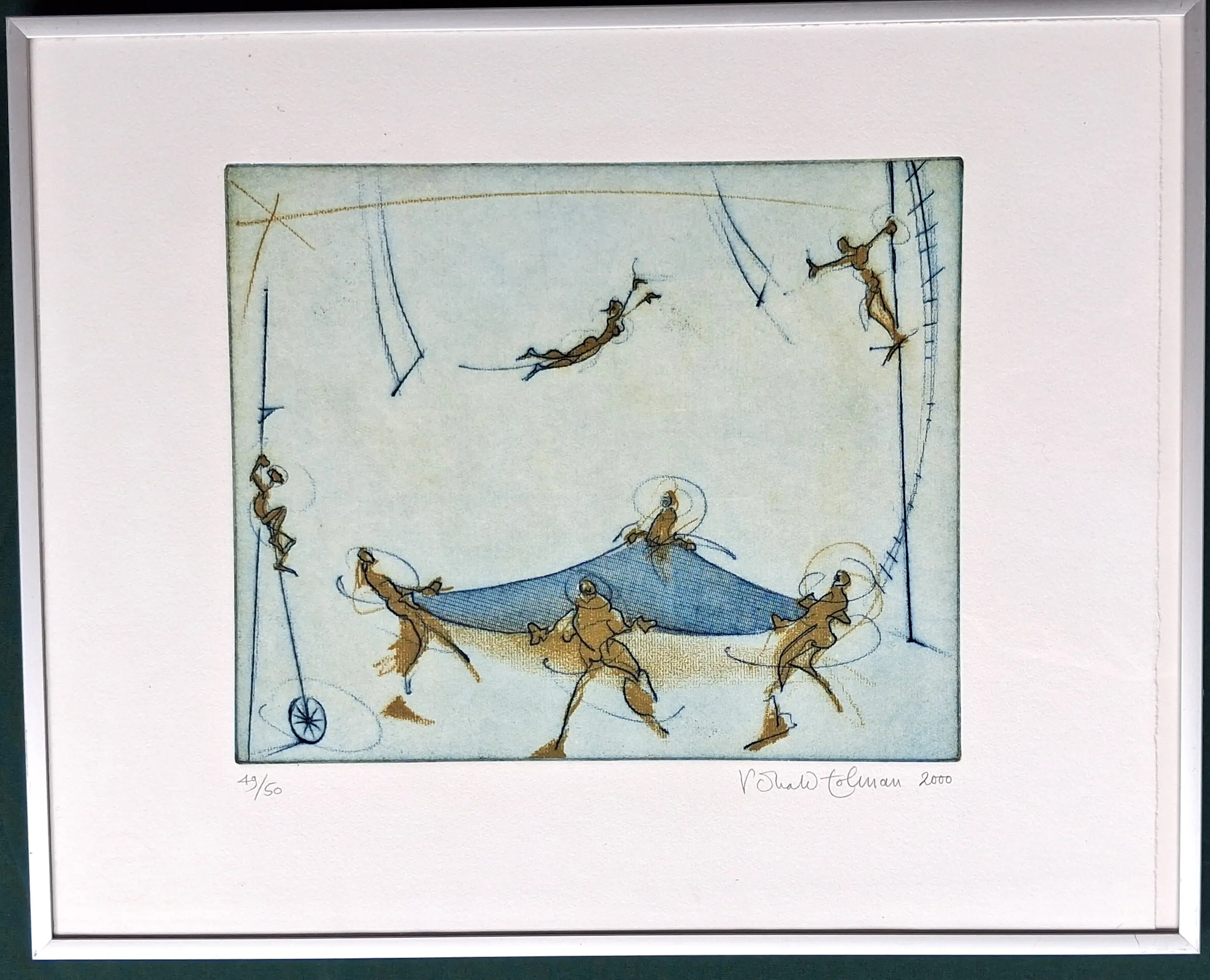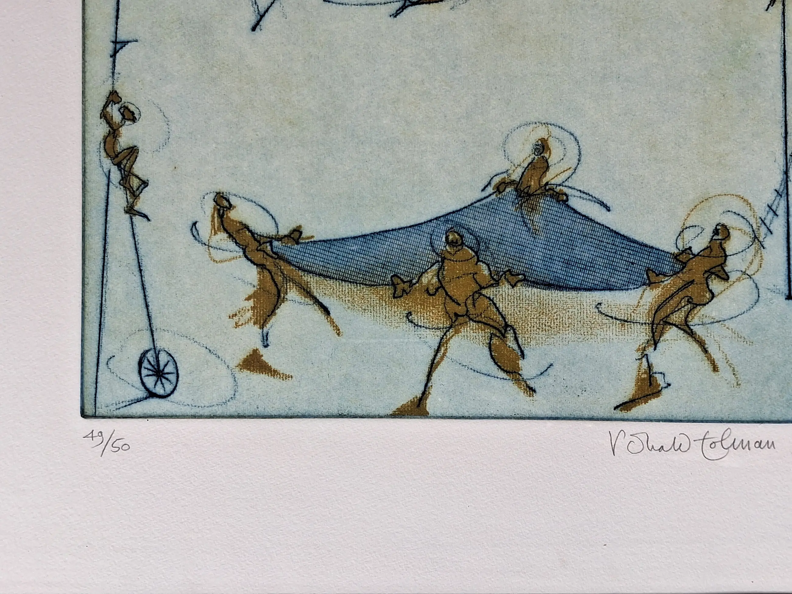 Ets/aquatint van Ronald Tolman, een van de etsen die hij maakte met als thema het circus. Met potlood door de maker gesigneerd, gedateerd en genummerd. Ingelijst in aluminium lijst. Het geheel verkeert in nieuwstaat.