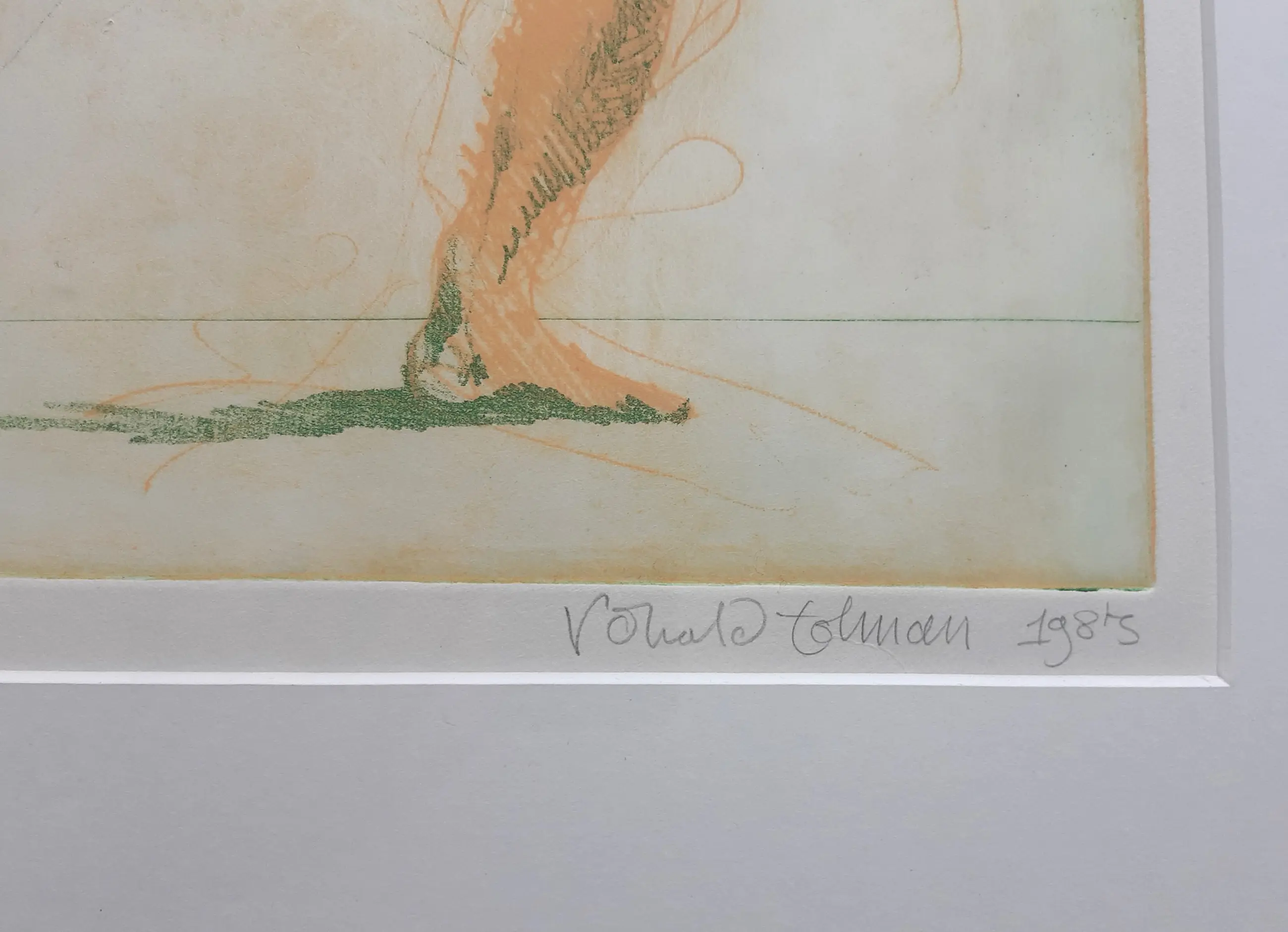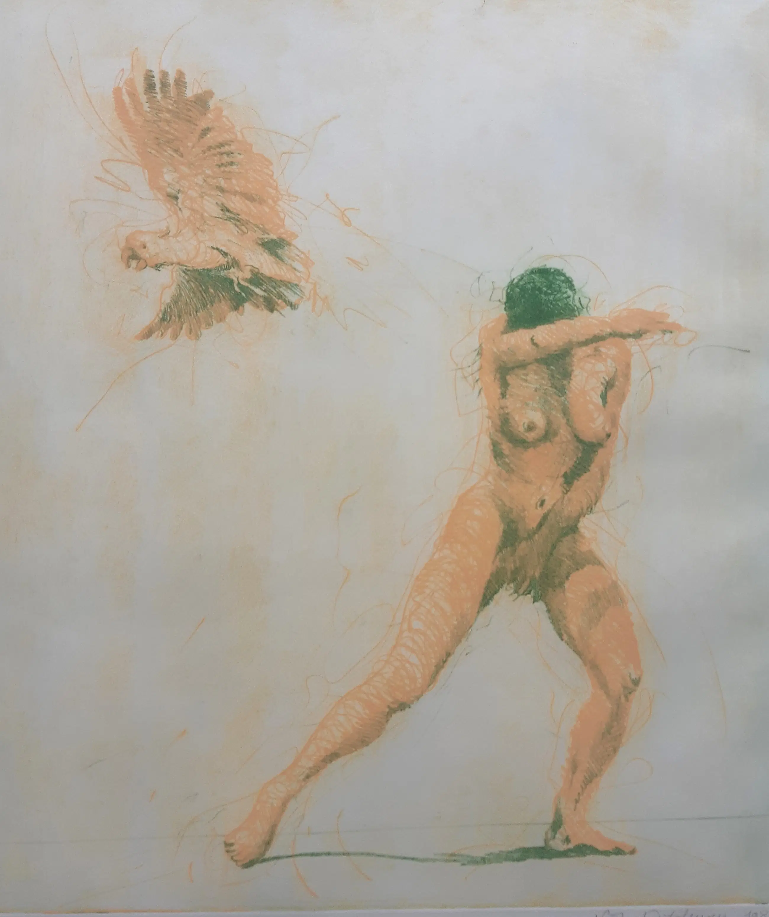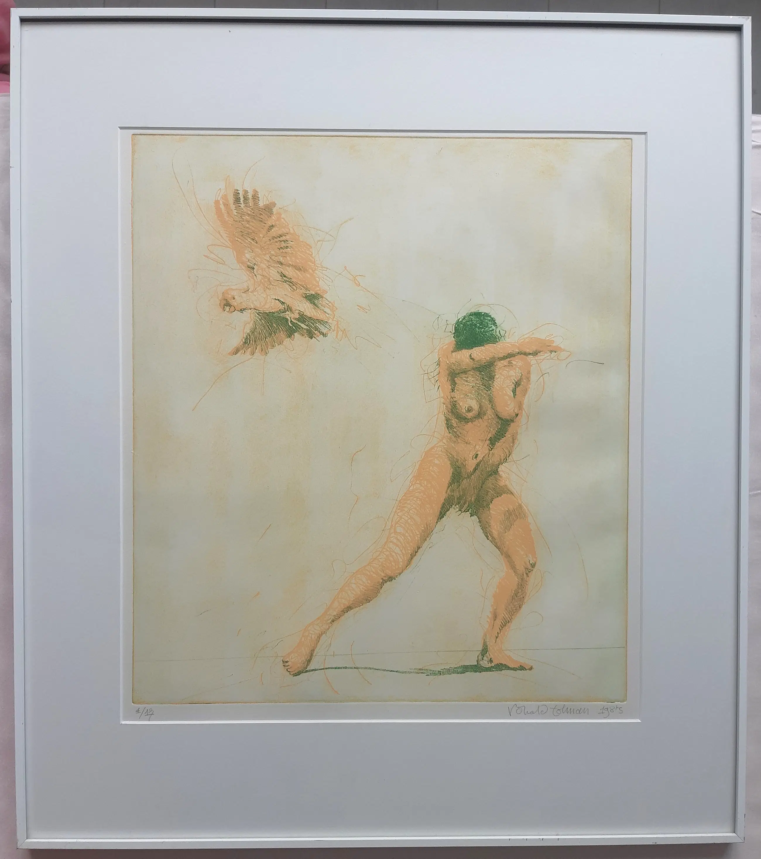 Grote intrigerende ets van Ronald Tolman, volgens etiket op achterzijde getitel Leda (met papegaai?). Met potlood gesigneerd, gedateerd en genummerd. Ingelijst in witte aluminium lijst. De conditie van de ets is uitstekend, de lijst heeft lichte gebruikssporen (zie foto).