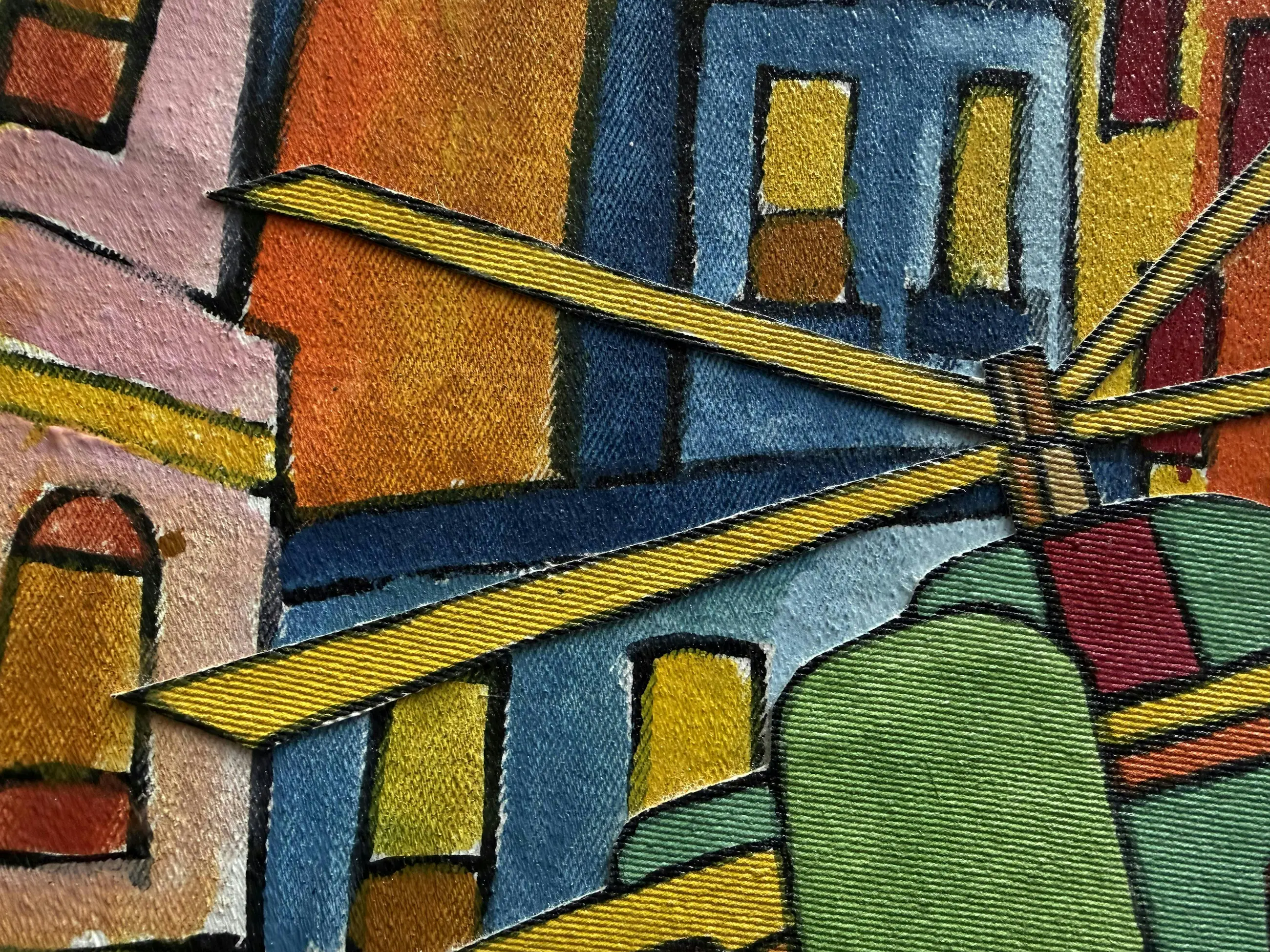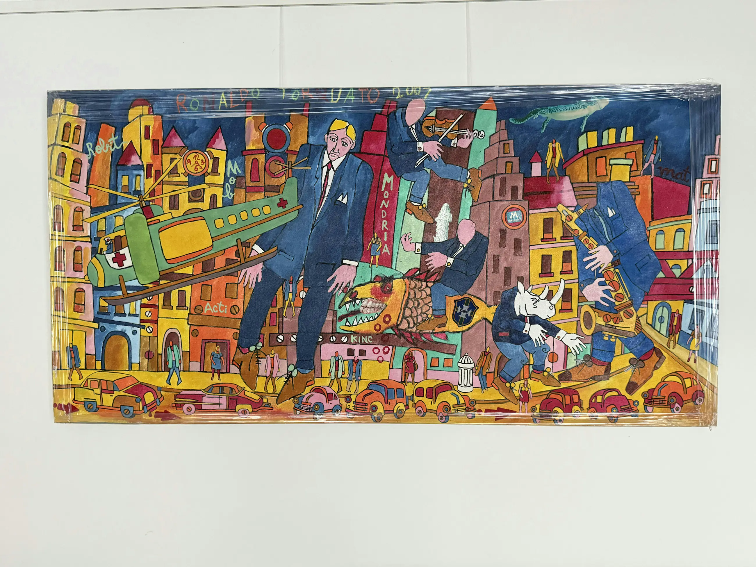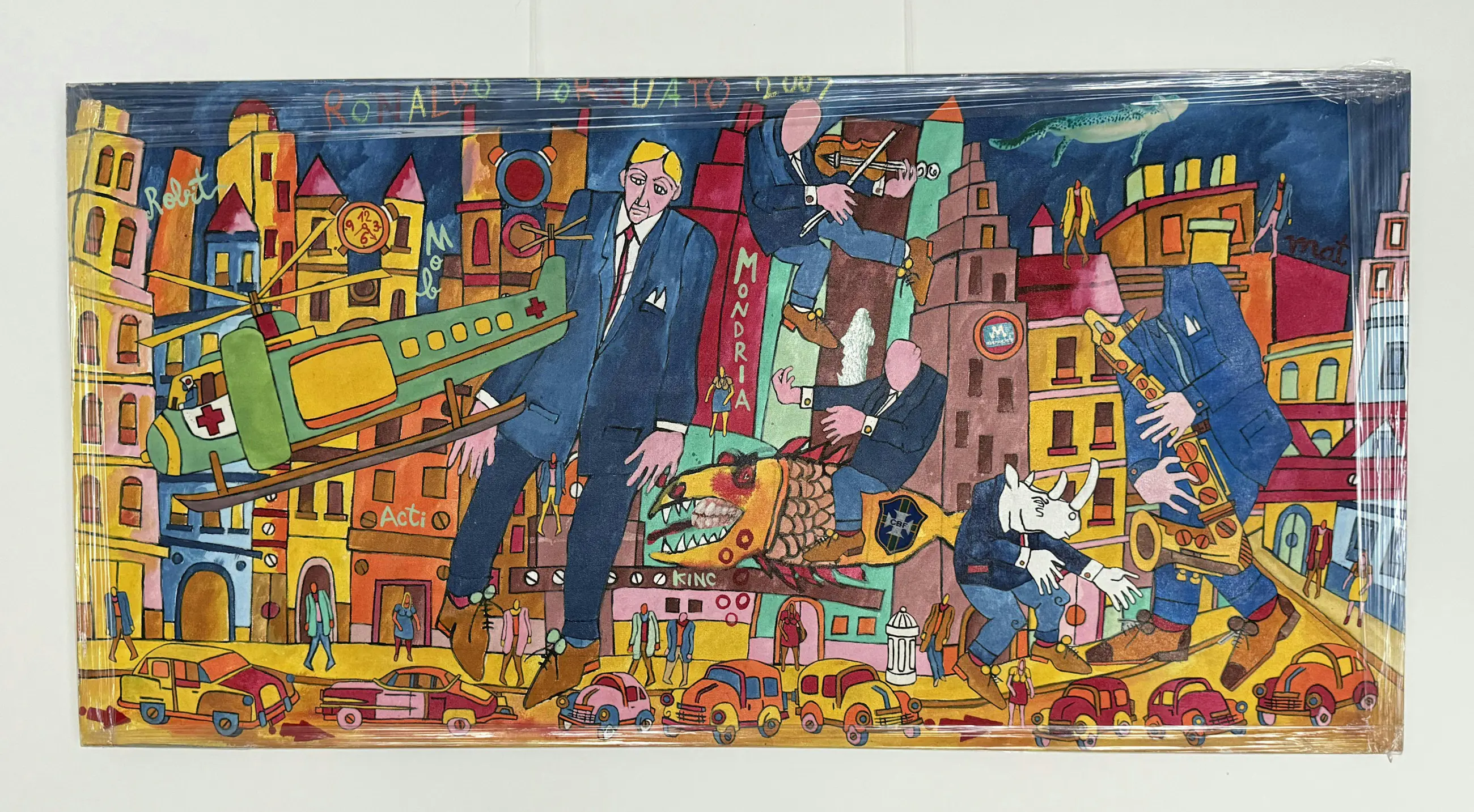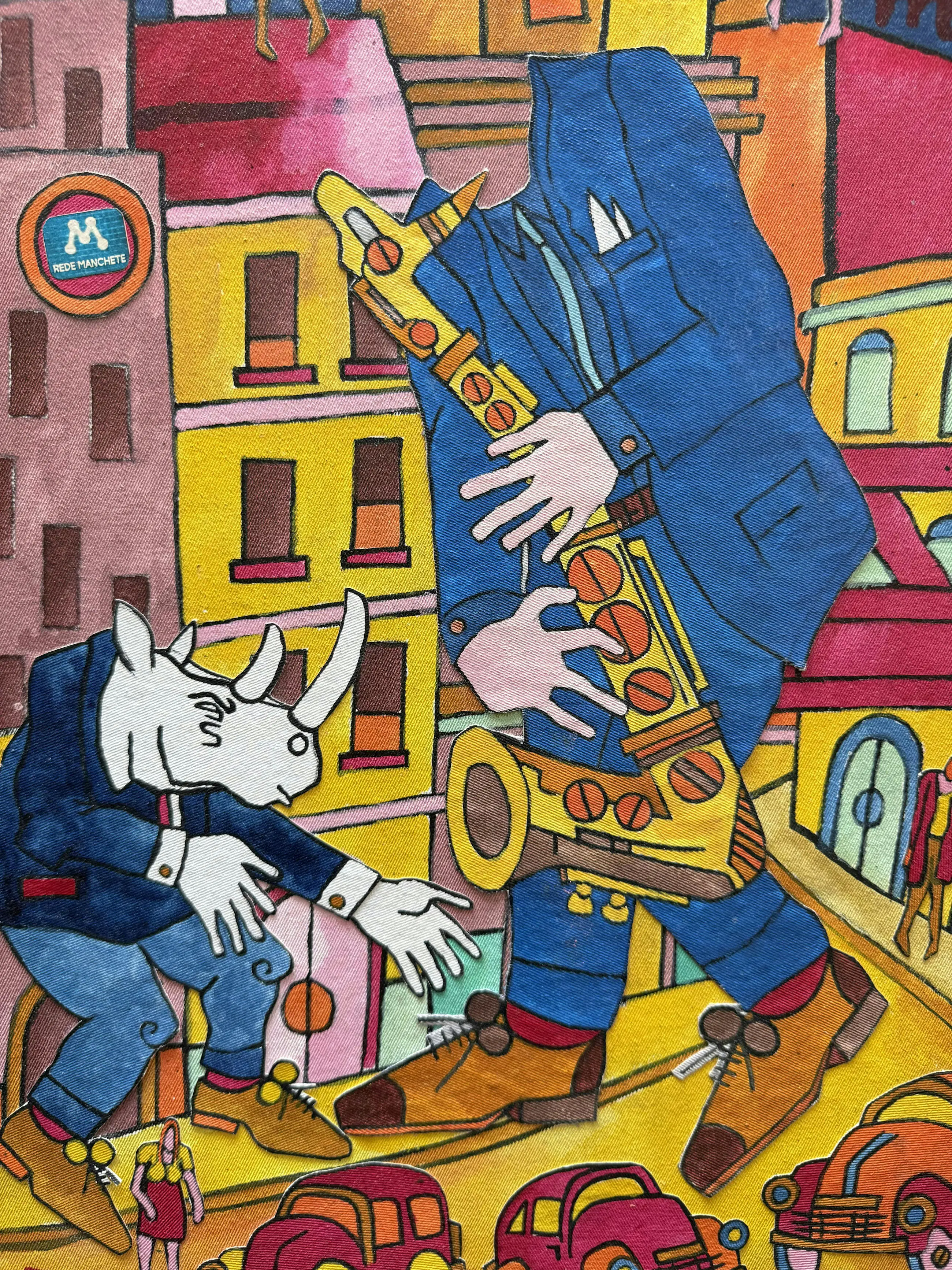Schilderij met gemengde techniek: op doek geschilderde objecten zijn, samen met enkele andere kleine objecten, op het doek bevestigd. Ronaldo Torquato (1957) is een Braziliaanse kunstenaar, geboren in Rio de Janeiro. Hij staat bekend om zijn figuratief-abstracte beeldtaal. Zijn schilderijen richten zich vaak op stedelijke en menselijke thema's.