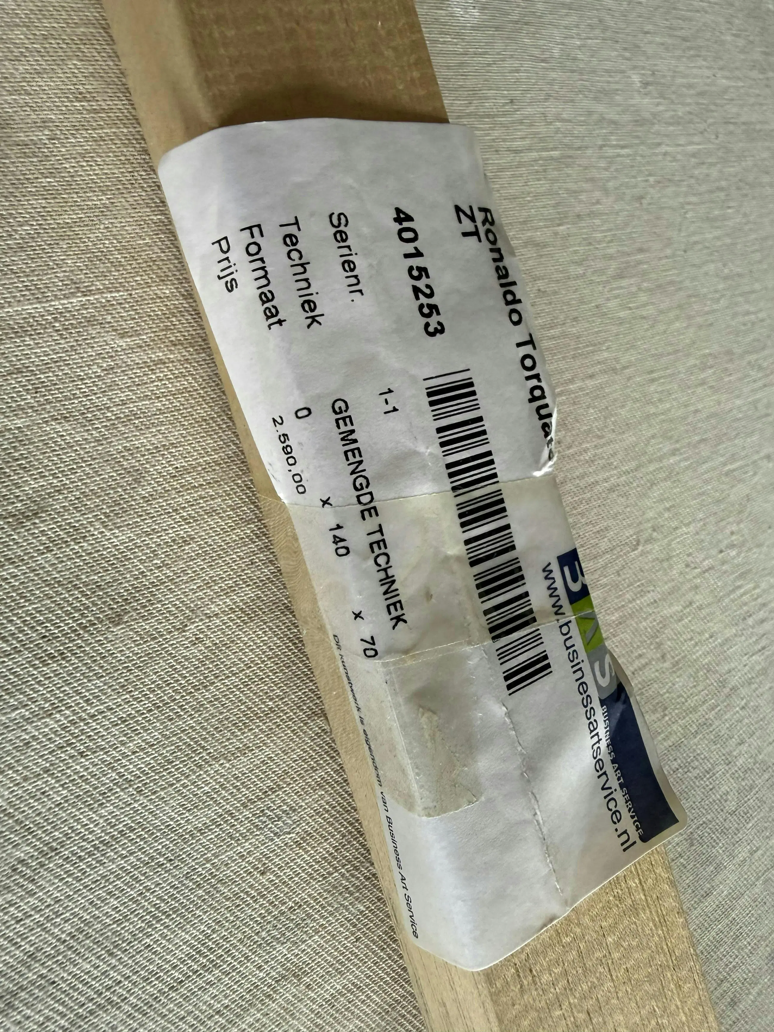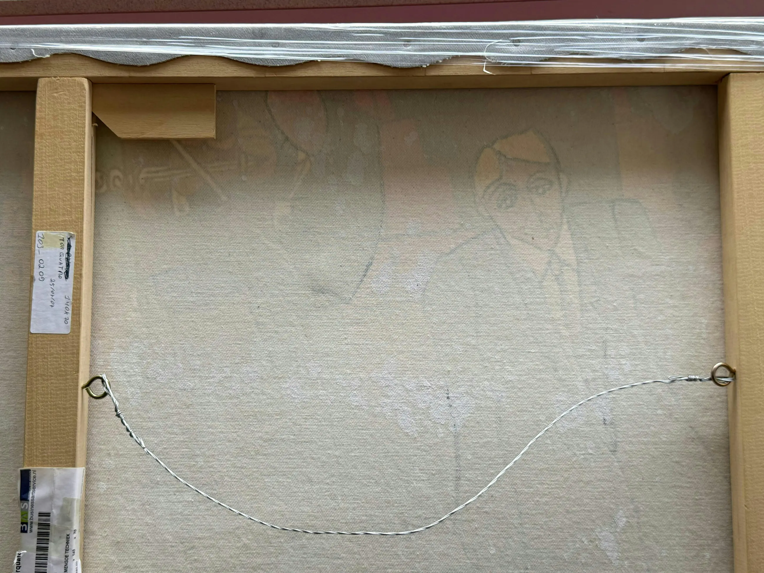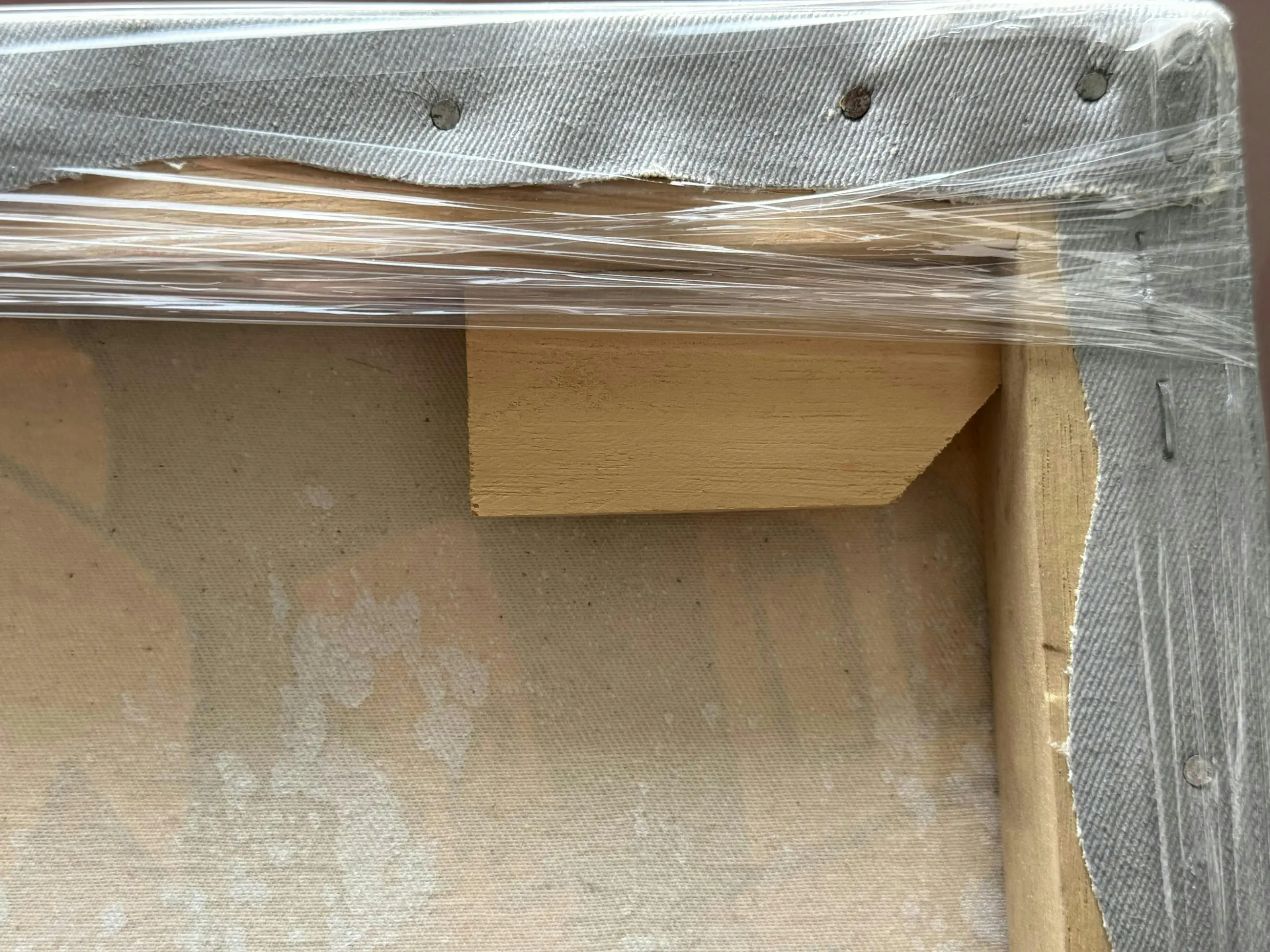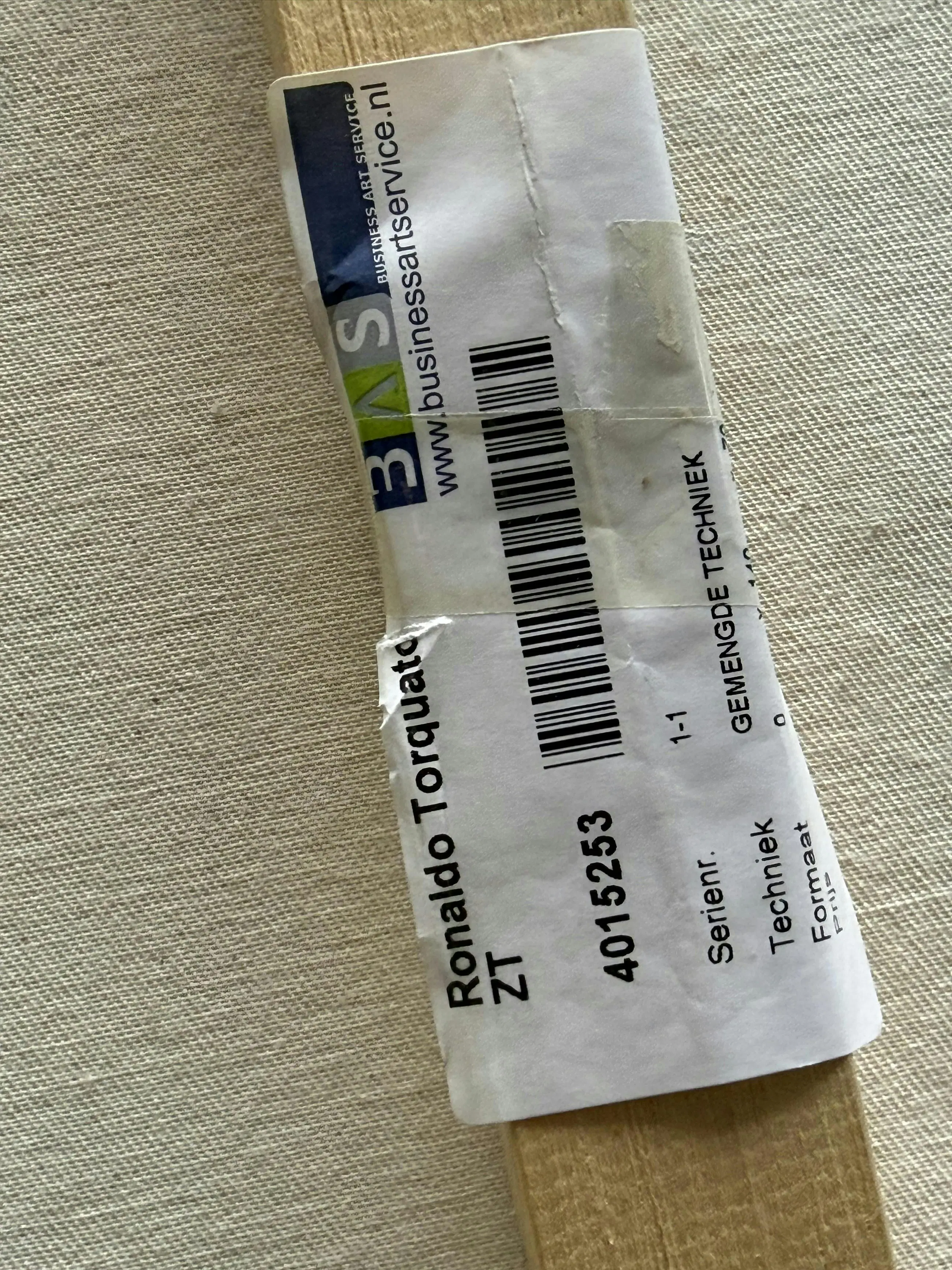Groot doek, dus liefst ophalen. Eventueel thuisgebracht of verzonden in overleg. De plastic rand om het schilderij zat eromheen toen ik het kocht. Na herinrichting in huis bleek het doek helaas te groot voor de bedoelde wand, dus bewust deze bescherming laten zitten.