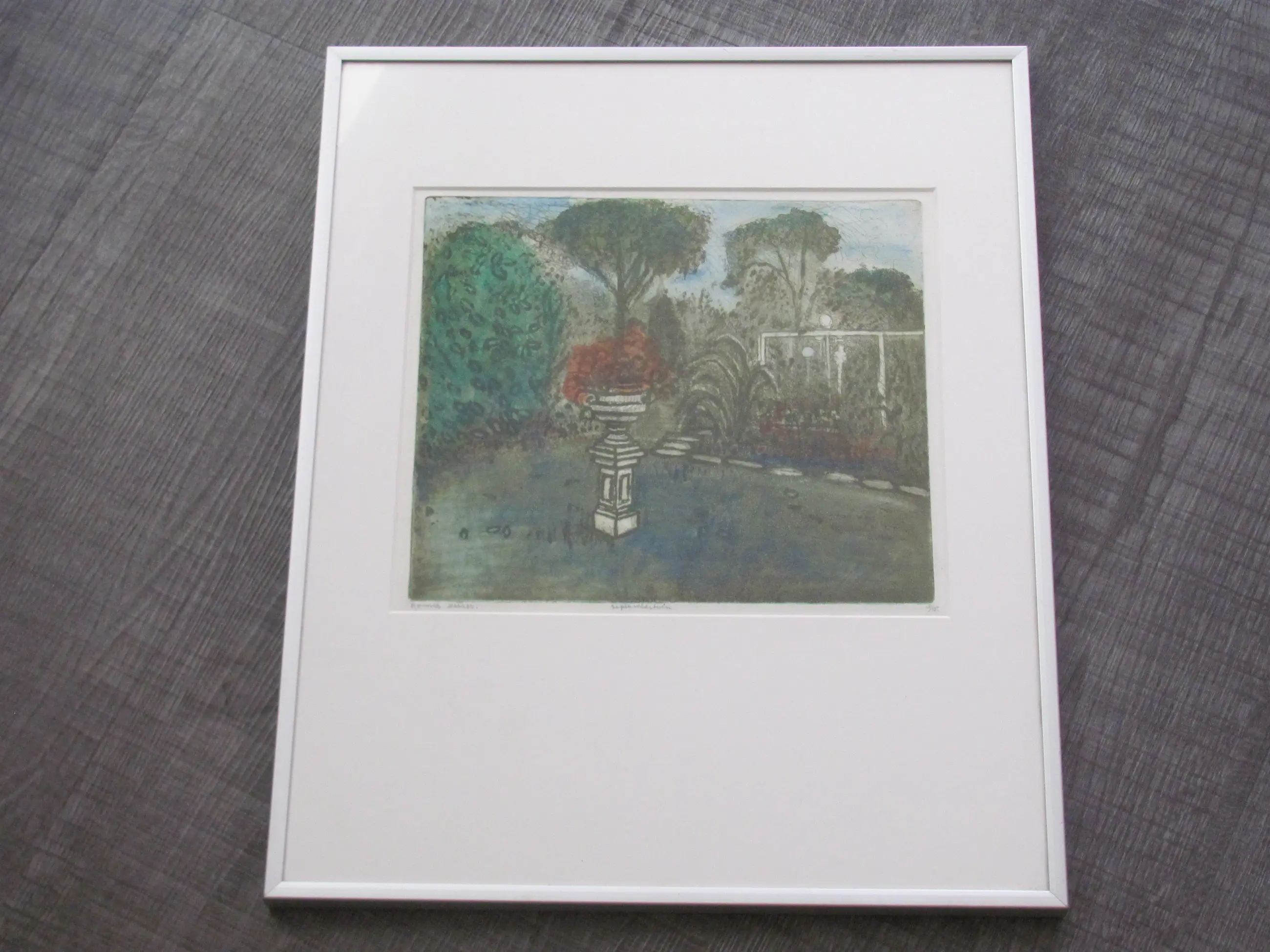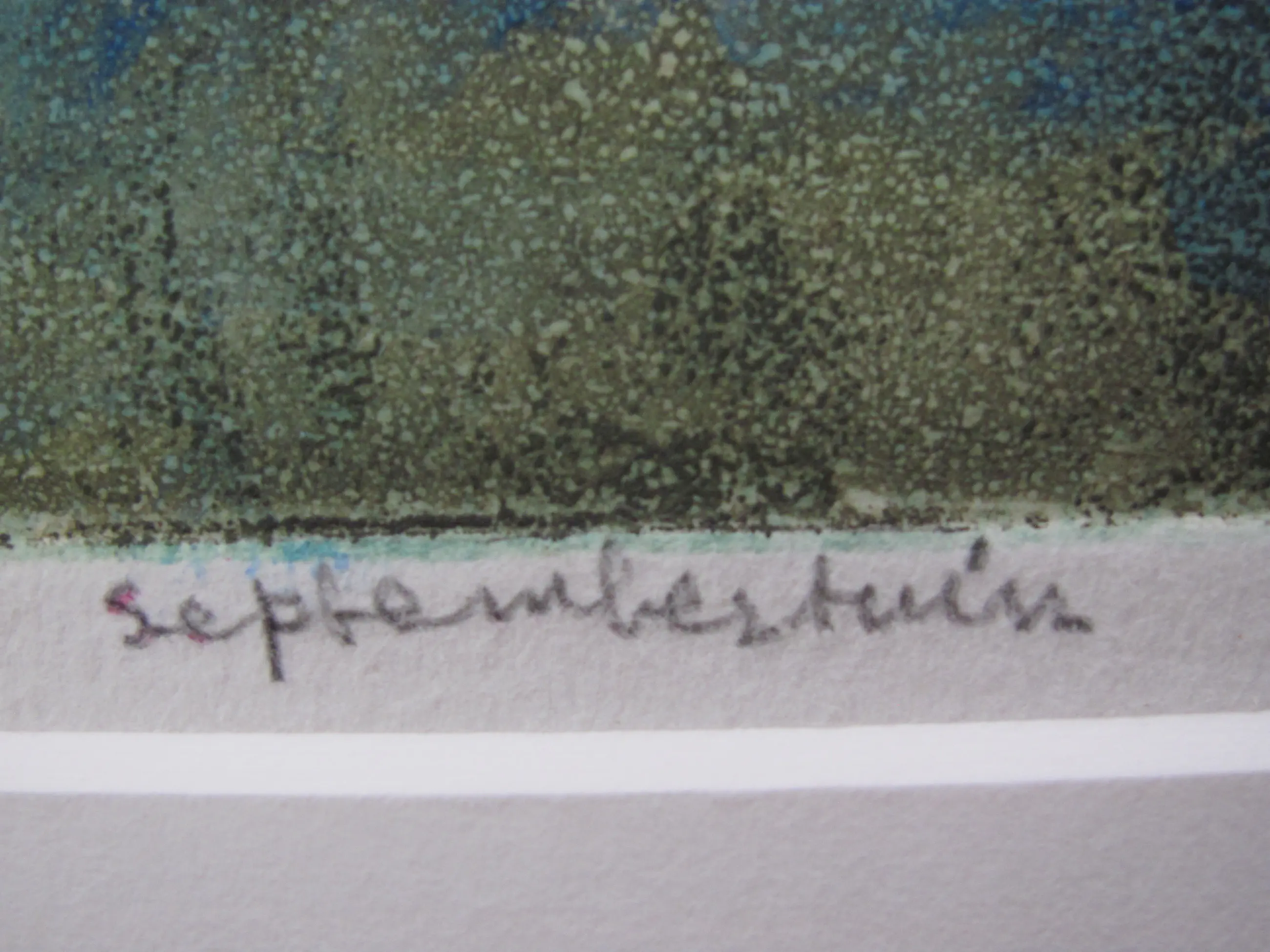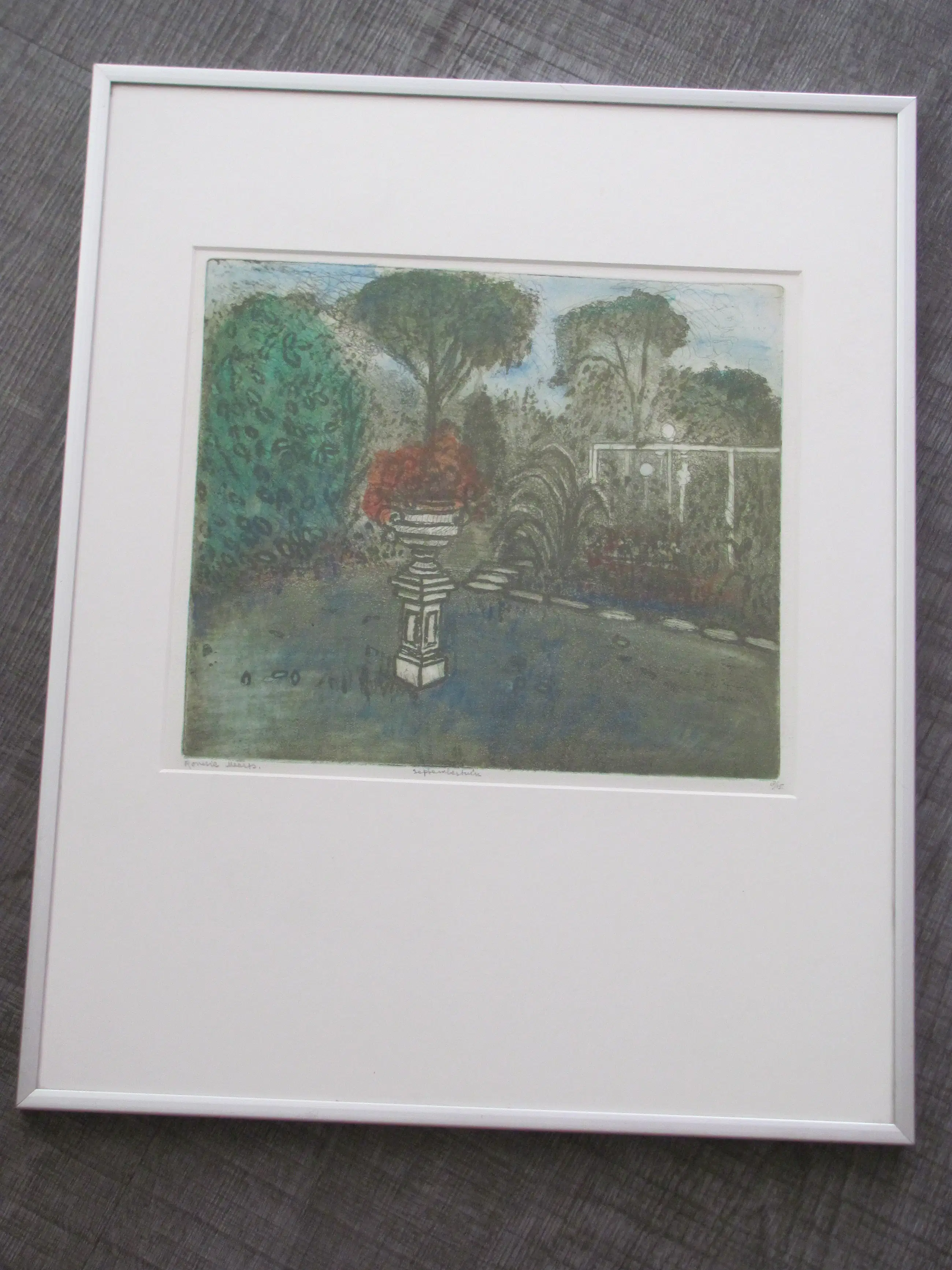 Zeefdruk. Linksonder met potlood gesigneerd: Ronnie Meerts. Midden-onder getiteld: septembertuin Rechtsonder genummerd: 8/15.