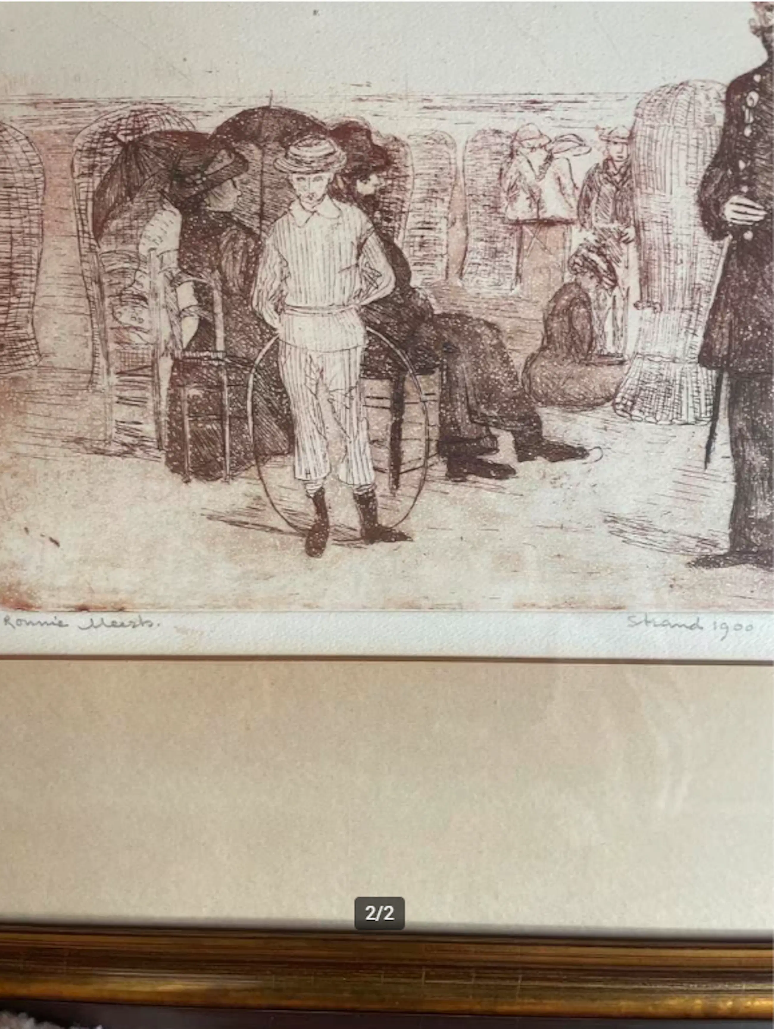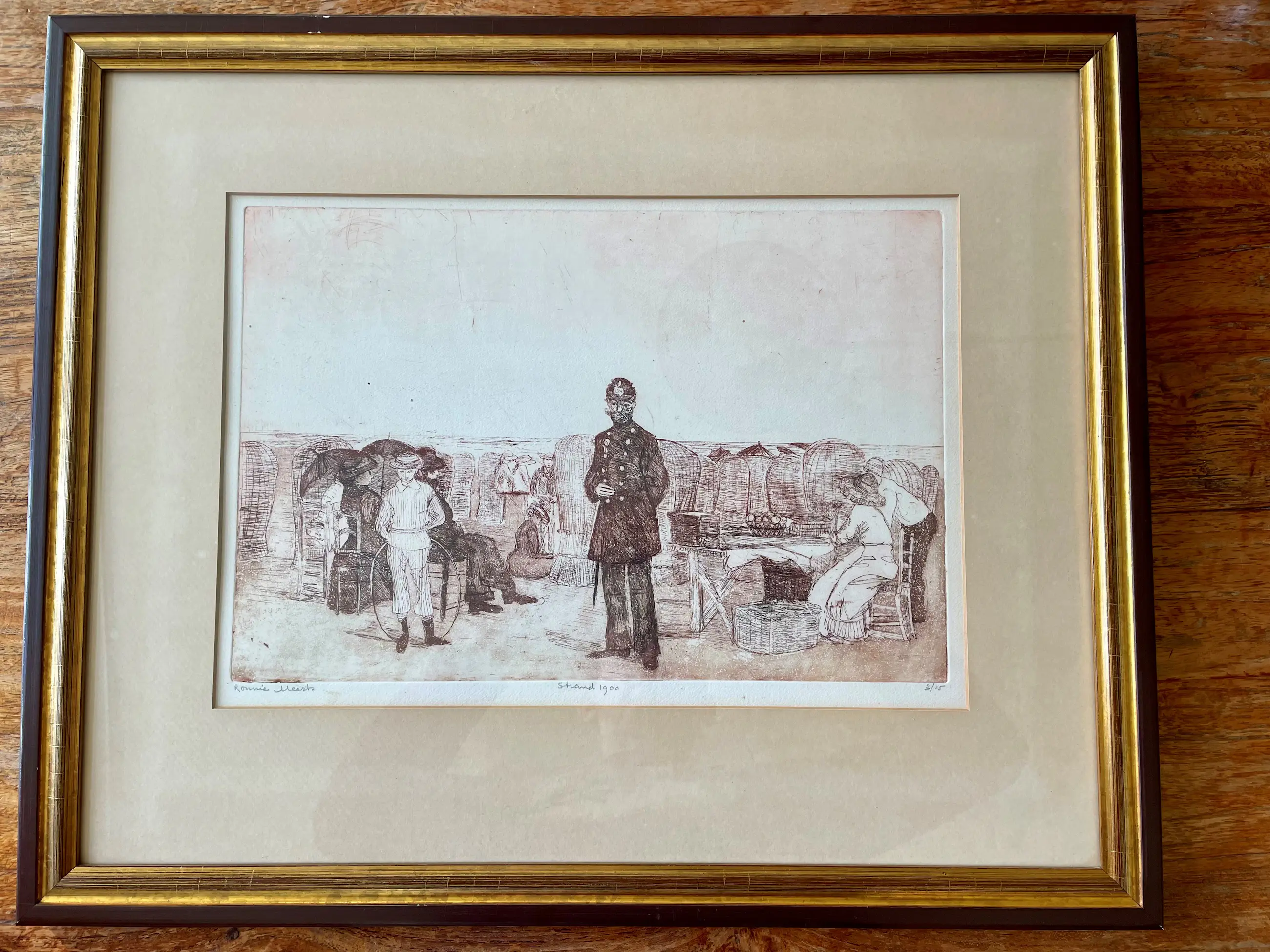 Ets van Rommie Meerts, getiteld 'Strand 1900'. De ets is ingelijst en toont een tafereel op het strand met figuren in klederdracht. Gesigneerd en gedateerd. De genoemde afmetingen zijn bij benadering/ wordt zsm bijgewerkt45
