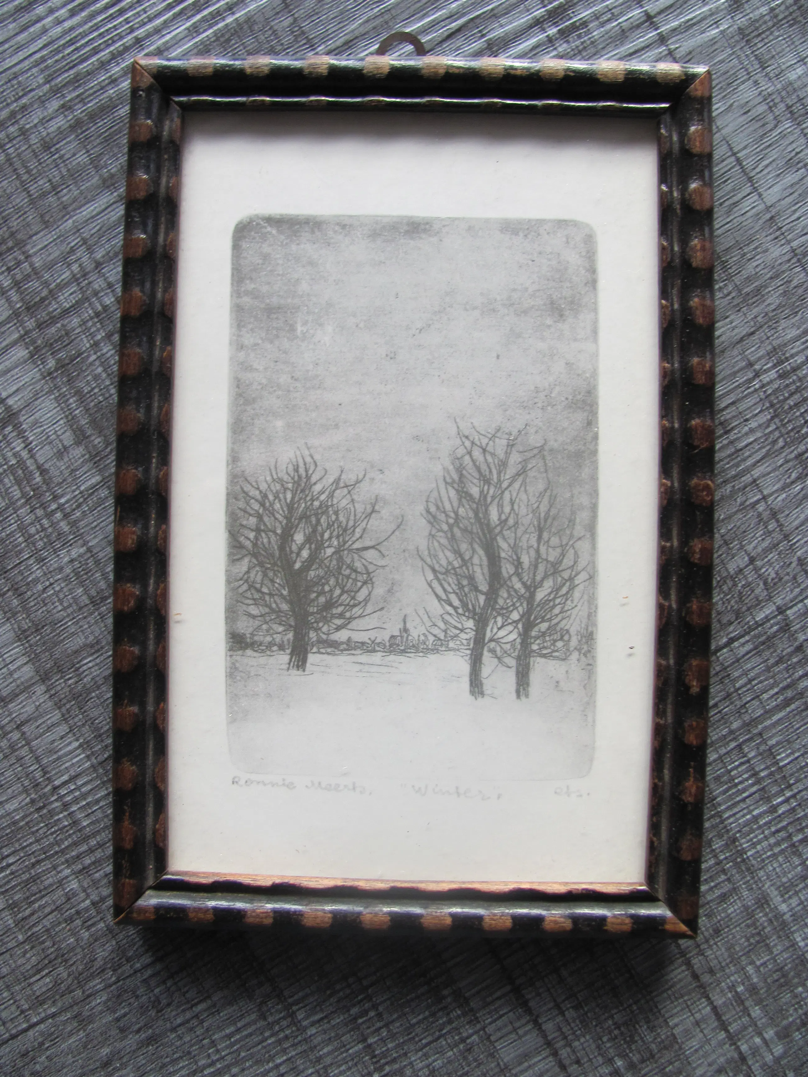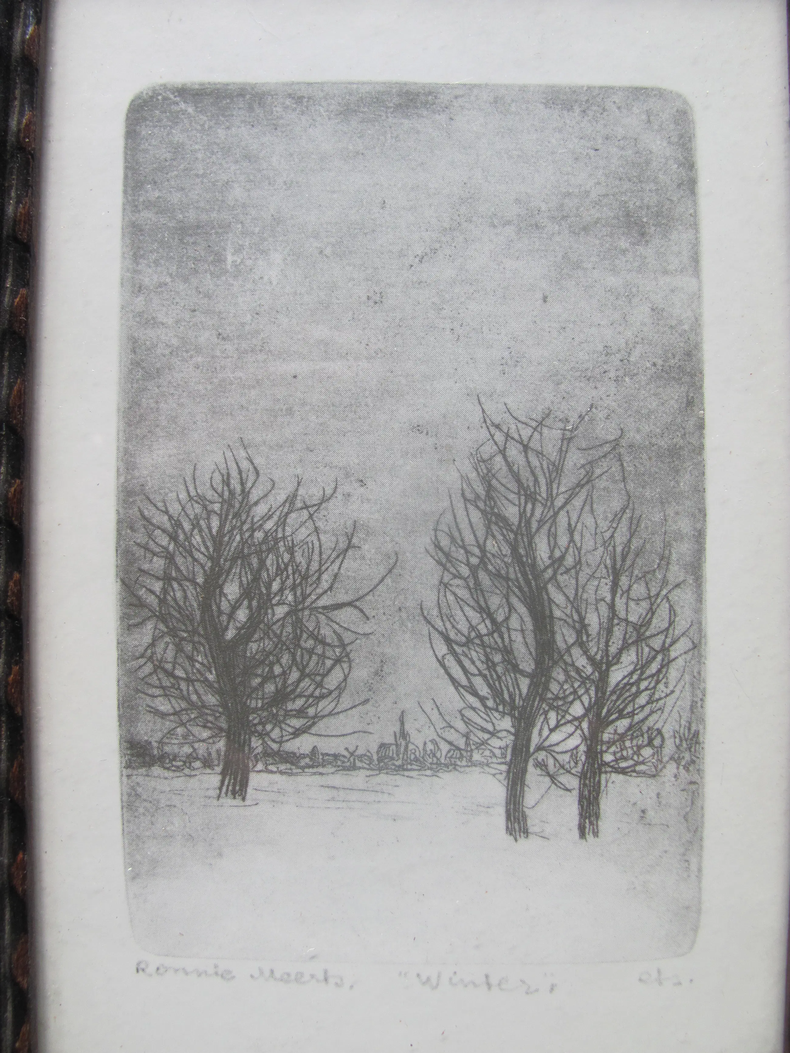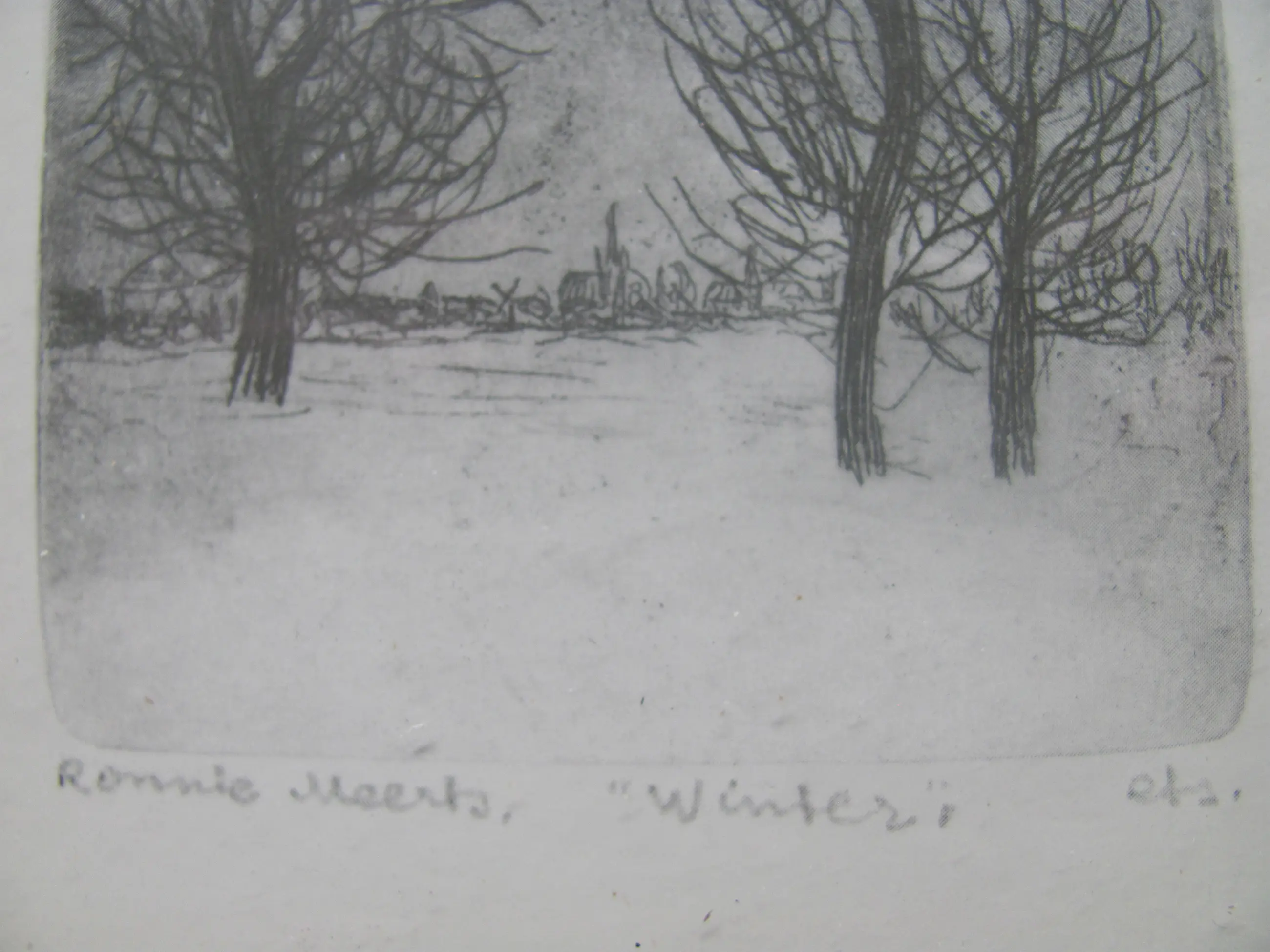 Ets van Ronnie Meerts. Linksonder gesigneerd (ronnie Meerts) Midden onder getiteld ("winter") Rechtsonder vermelding "ets".