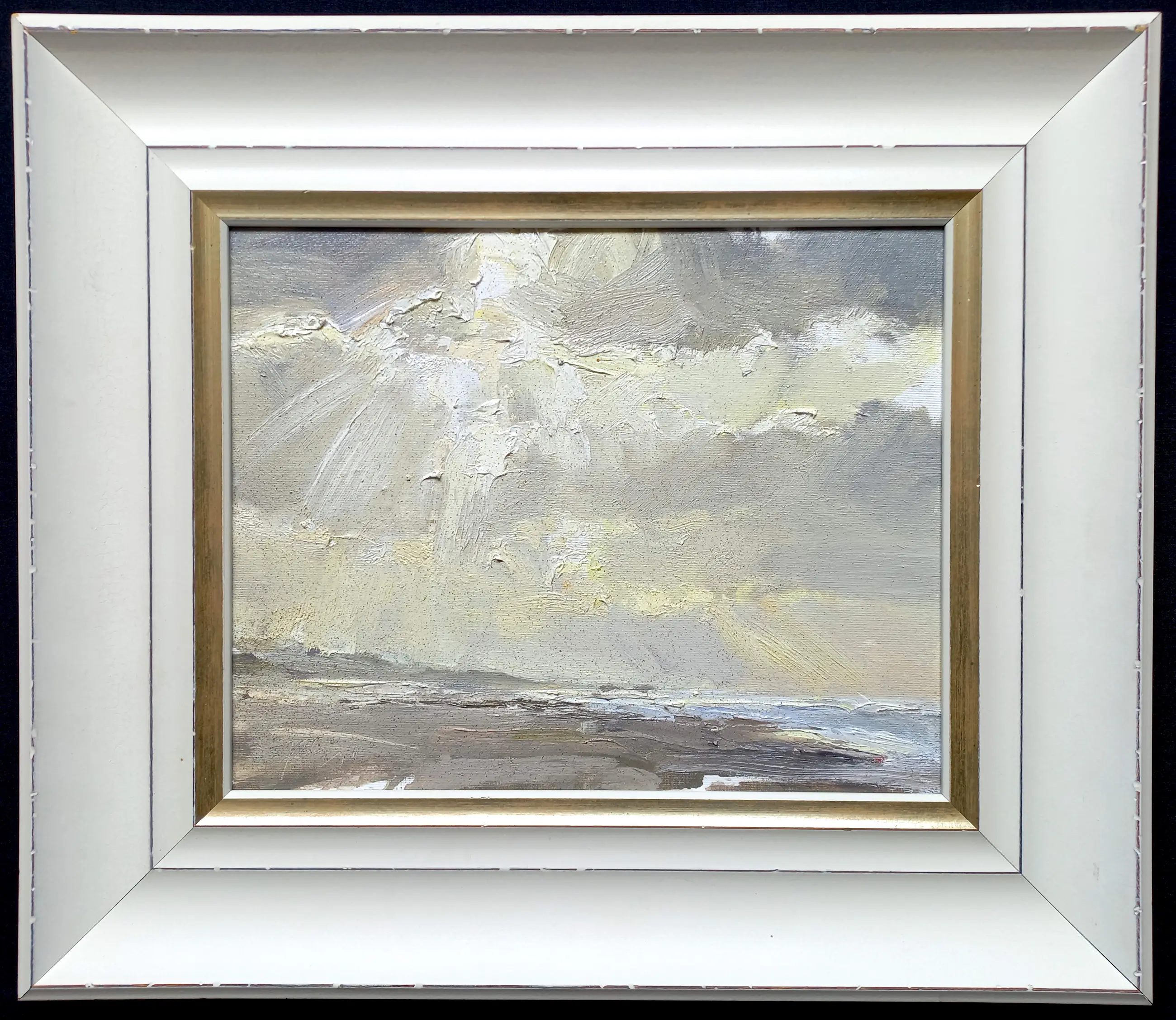 Prachtig, ‘plein air’ geschilderd strandgezicht van Roos Schuring. Olieverf op canvasboard, achterop gesigneerd, zeer smaakvol ingelijst. In uitstekende conditie. Het werk is zo ‘plein air’ geschilderd dat de zandkorrels onderdeel worden van het tafereel. Galerieprijs: 850-975 euro, zie Roos Schuring’s website of die van Galerie Bonnard.