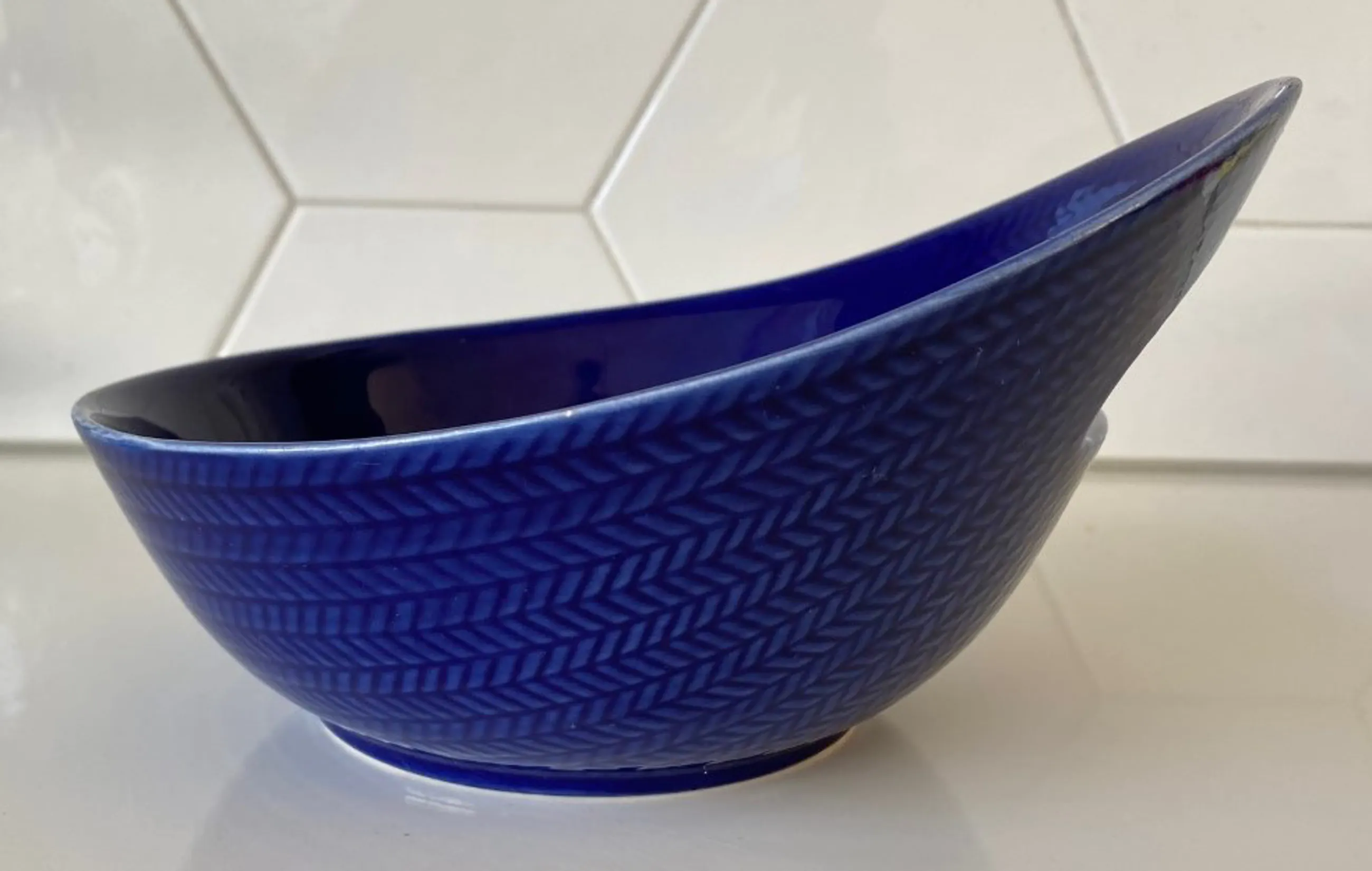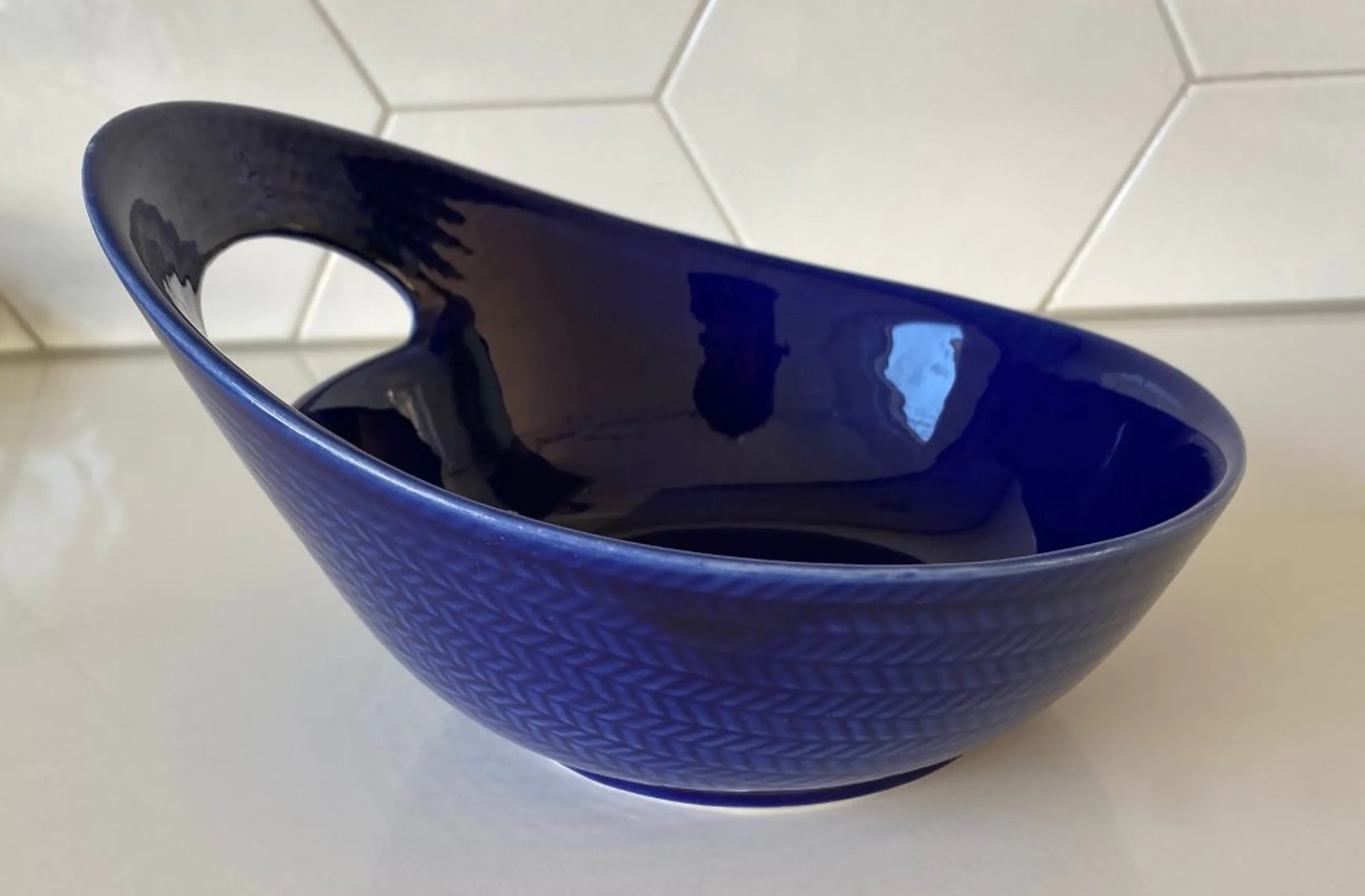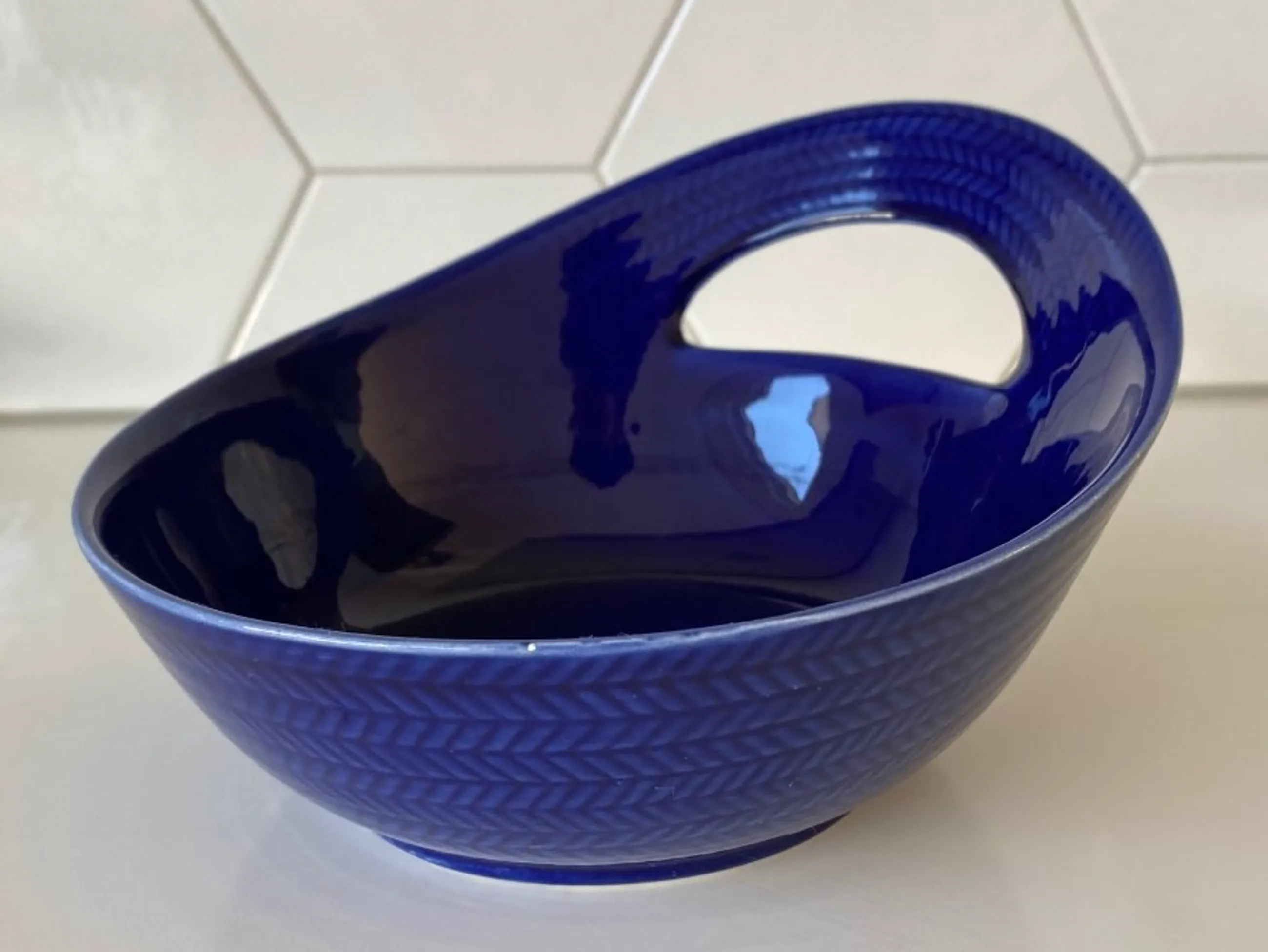 Blauwe schaal met handvat, servies Blå Eld (Blauw Vuur) ontworpen door Hertha Bengtson voor Rorstrand in 1951 en in productie geweest tot 1971. Deze schaal is in zeer goede gebruikte conditie en heeft twee zeer minimale fleebites op de rand. Gemerkt aan de onderzijde.