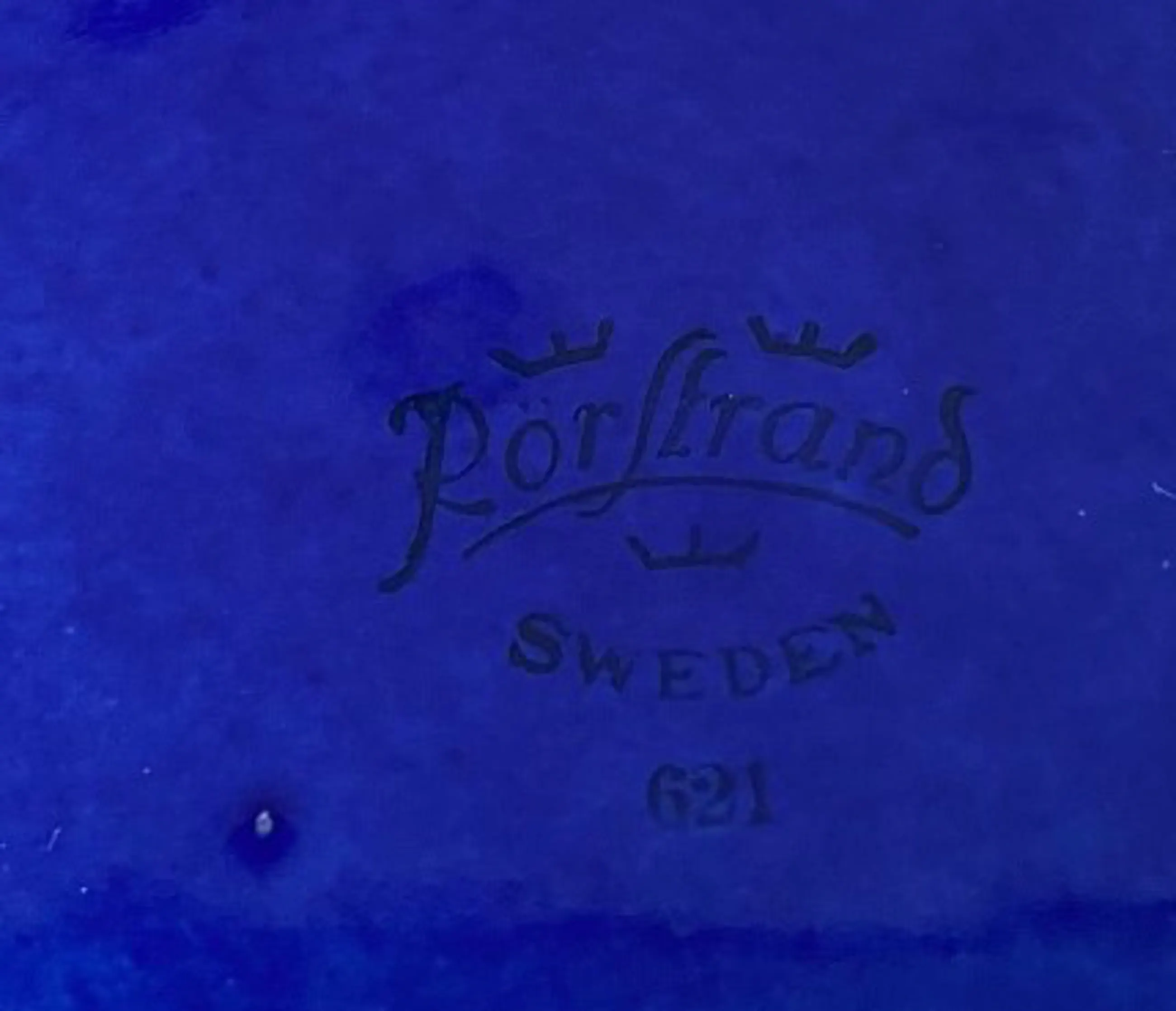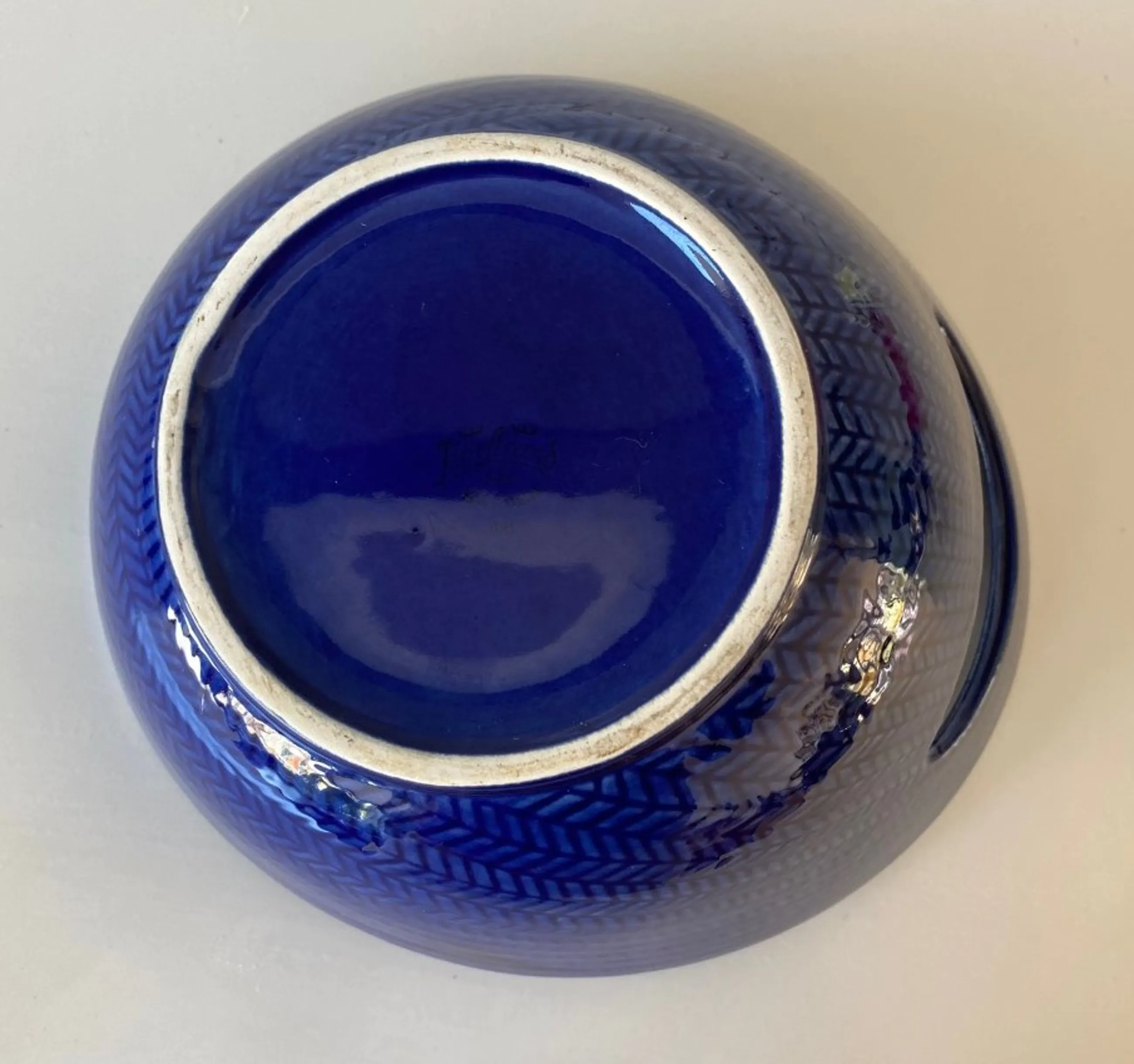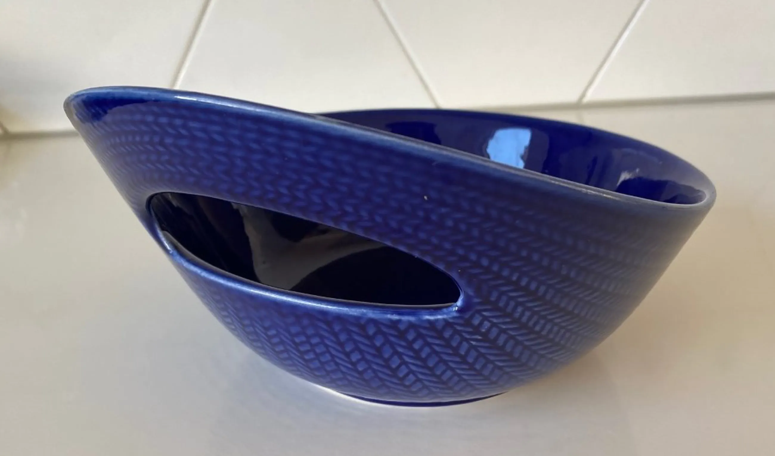 Blauwe schaal met handvat, servies Blå Eld (Blauw Vuur) ontworpen door Hertha Bengtson voor Rorstrand in 1951 en in productie geweest tot 1971. Deze schaal is in zeer goede gebruikte conditie en heeft twee zeer minimale fleebites op de rand. Gemerkt aan de onderzijde.