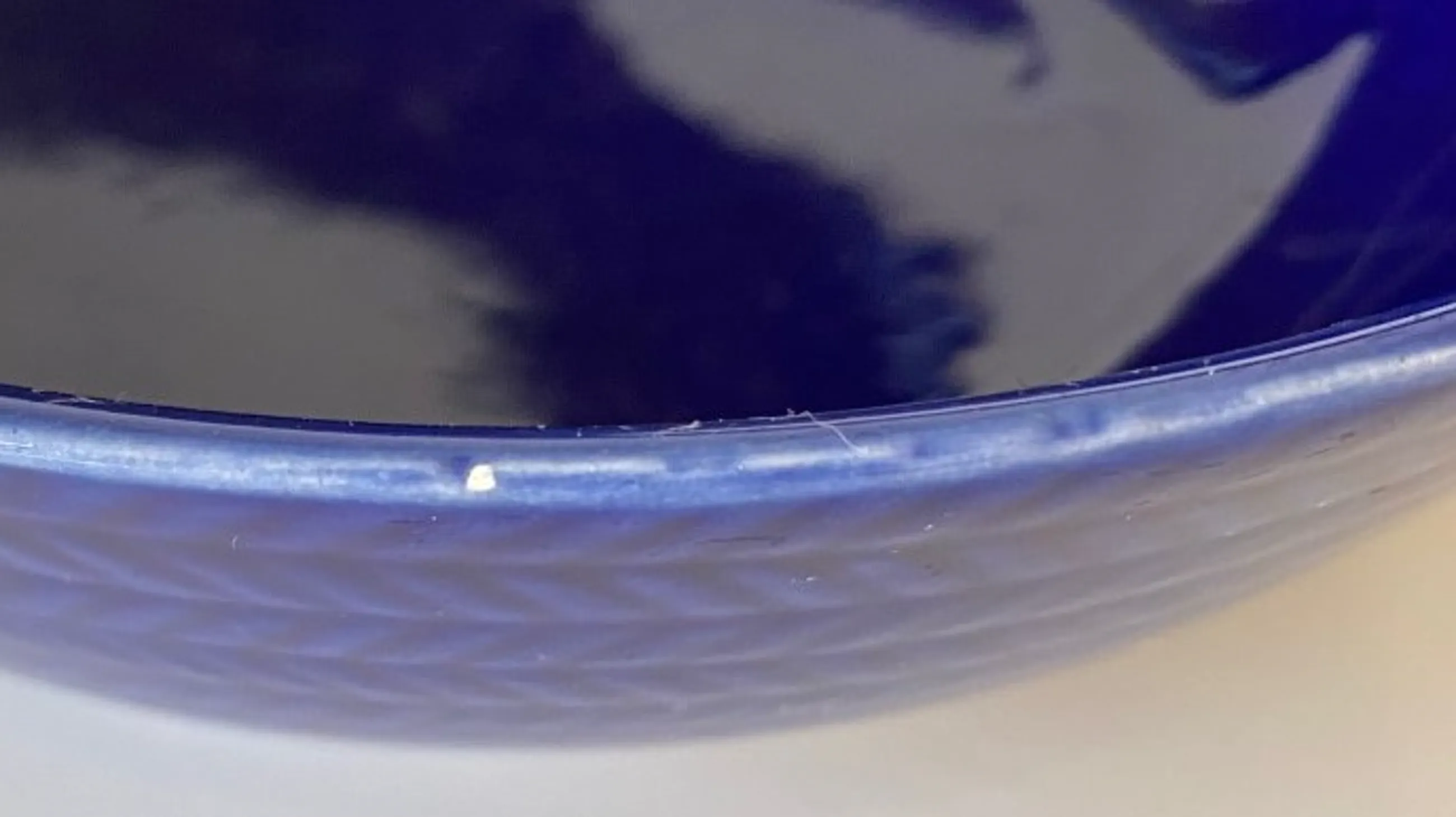 De schaal heeft twee zeer minimale stootplekjes (fleebites) op de rand.