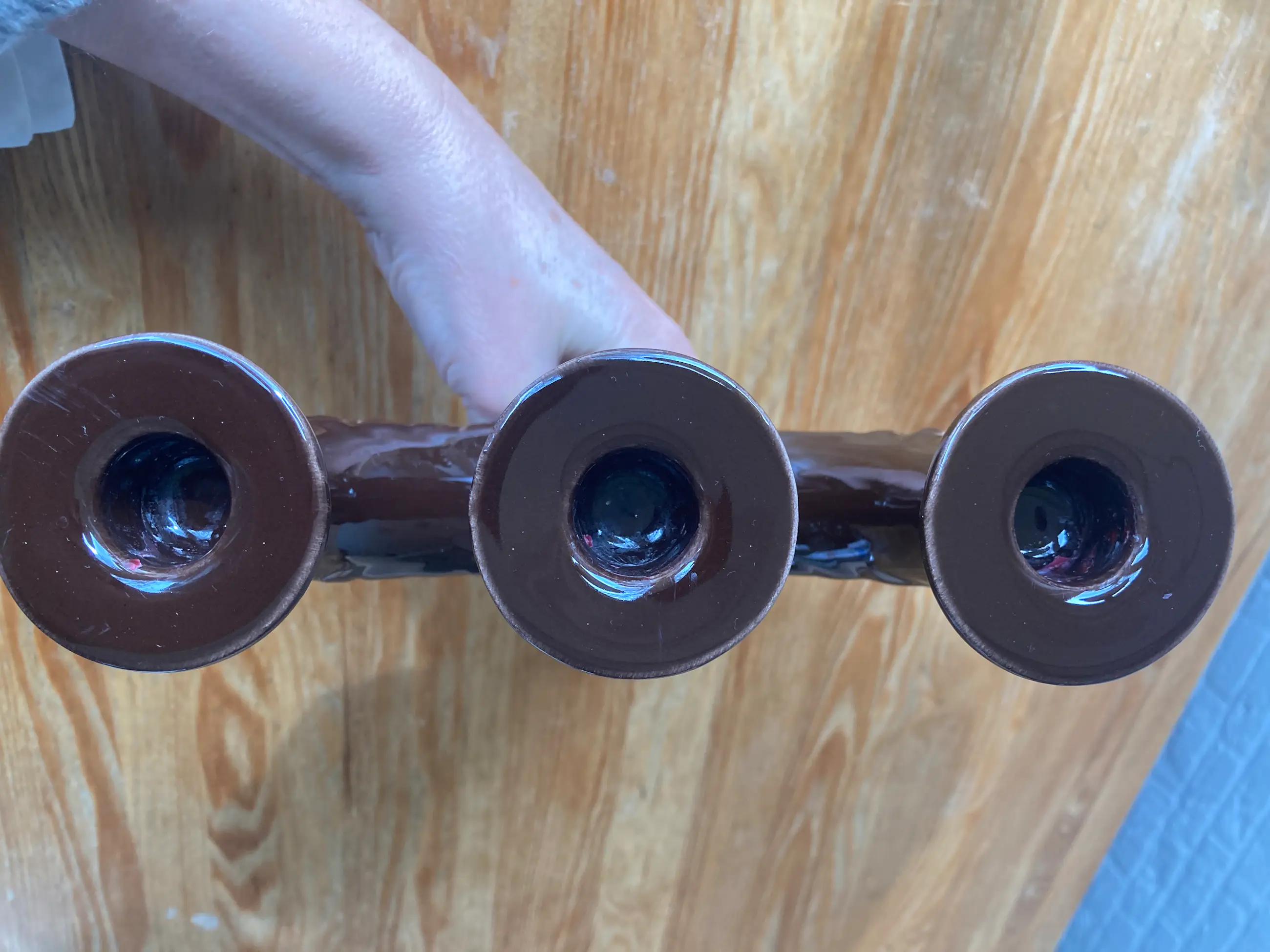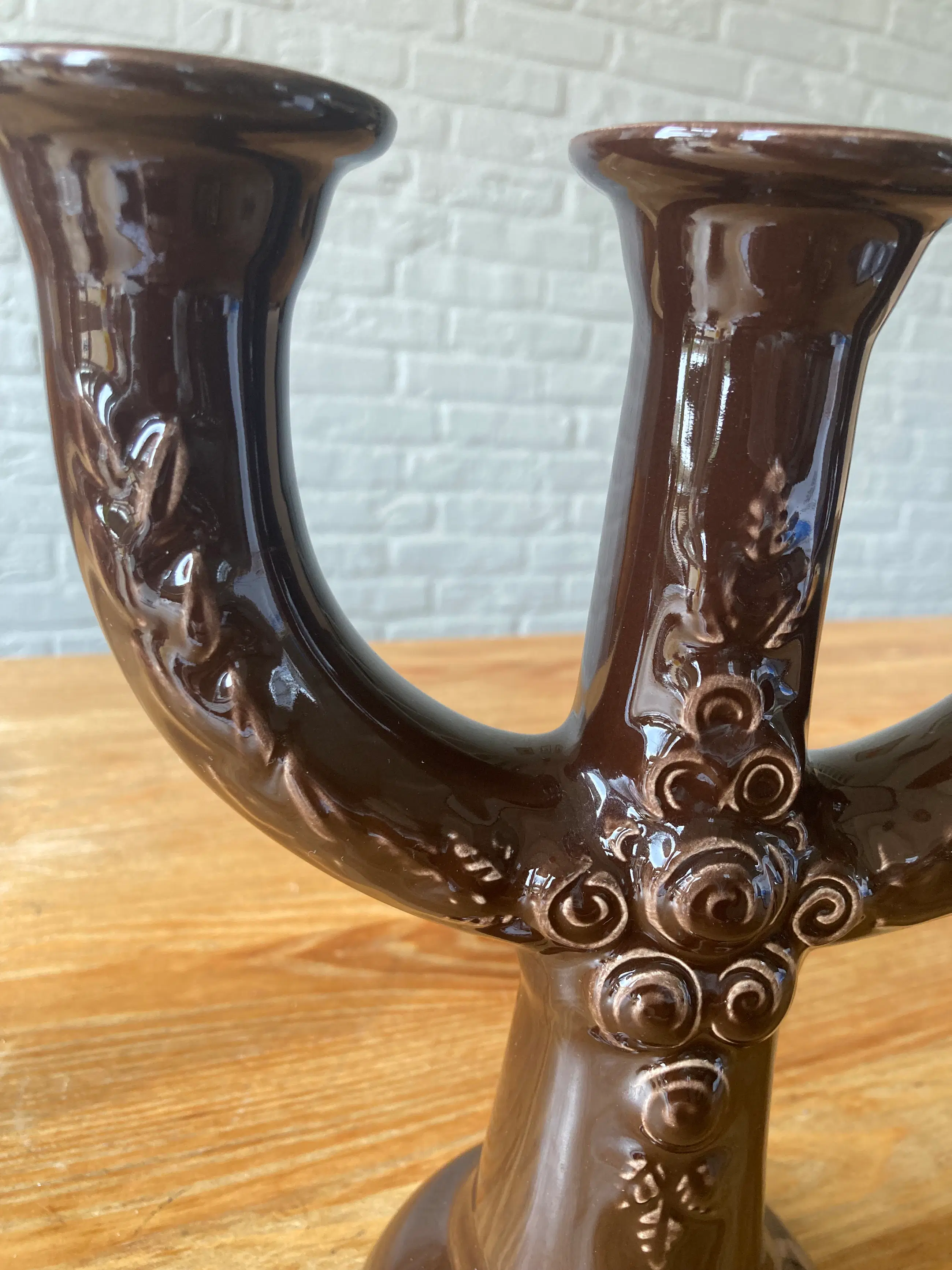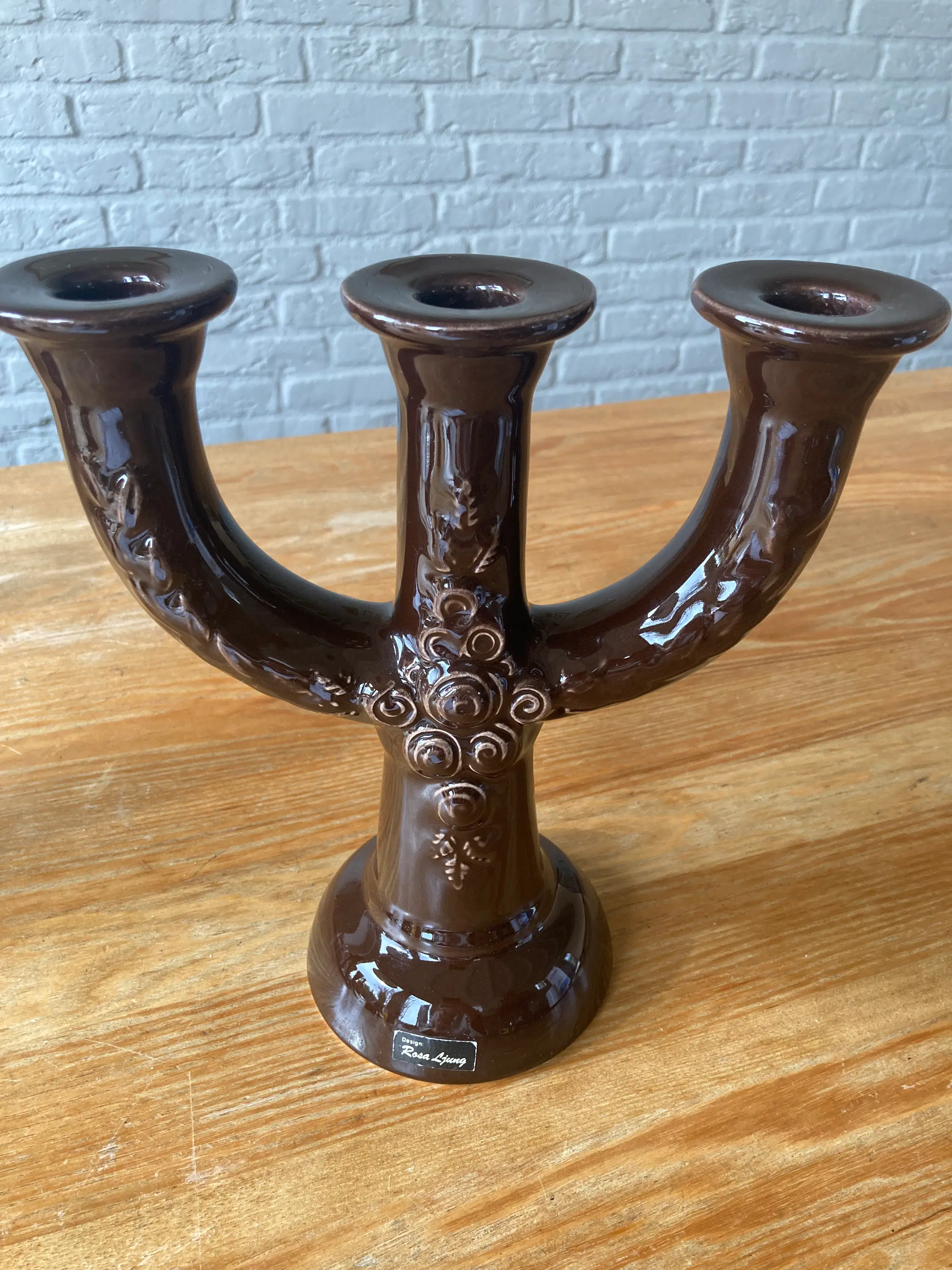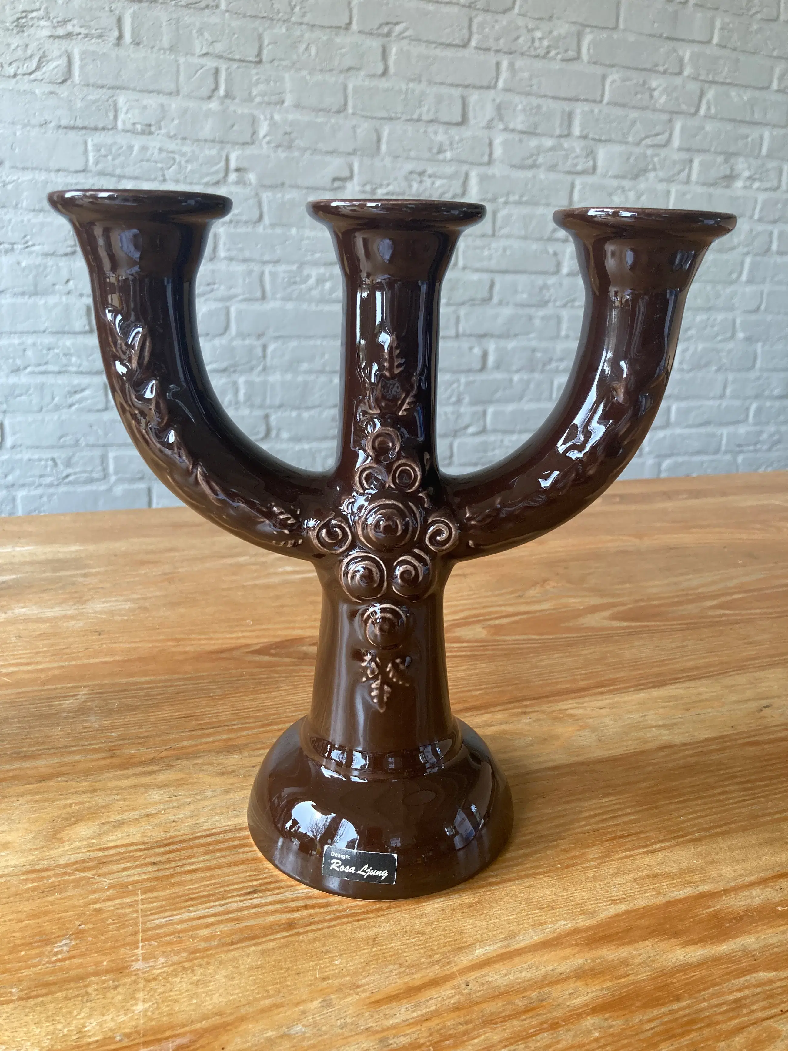 Rosa Ljung, Zweden grote keramische kandelaar, Vintage Scandinavische, bruine 3-arm kandelaar. Met mooie versieringen, Scandi Folk Art