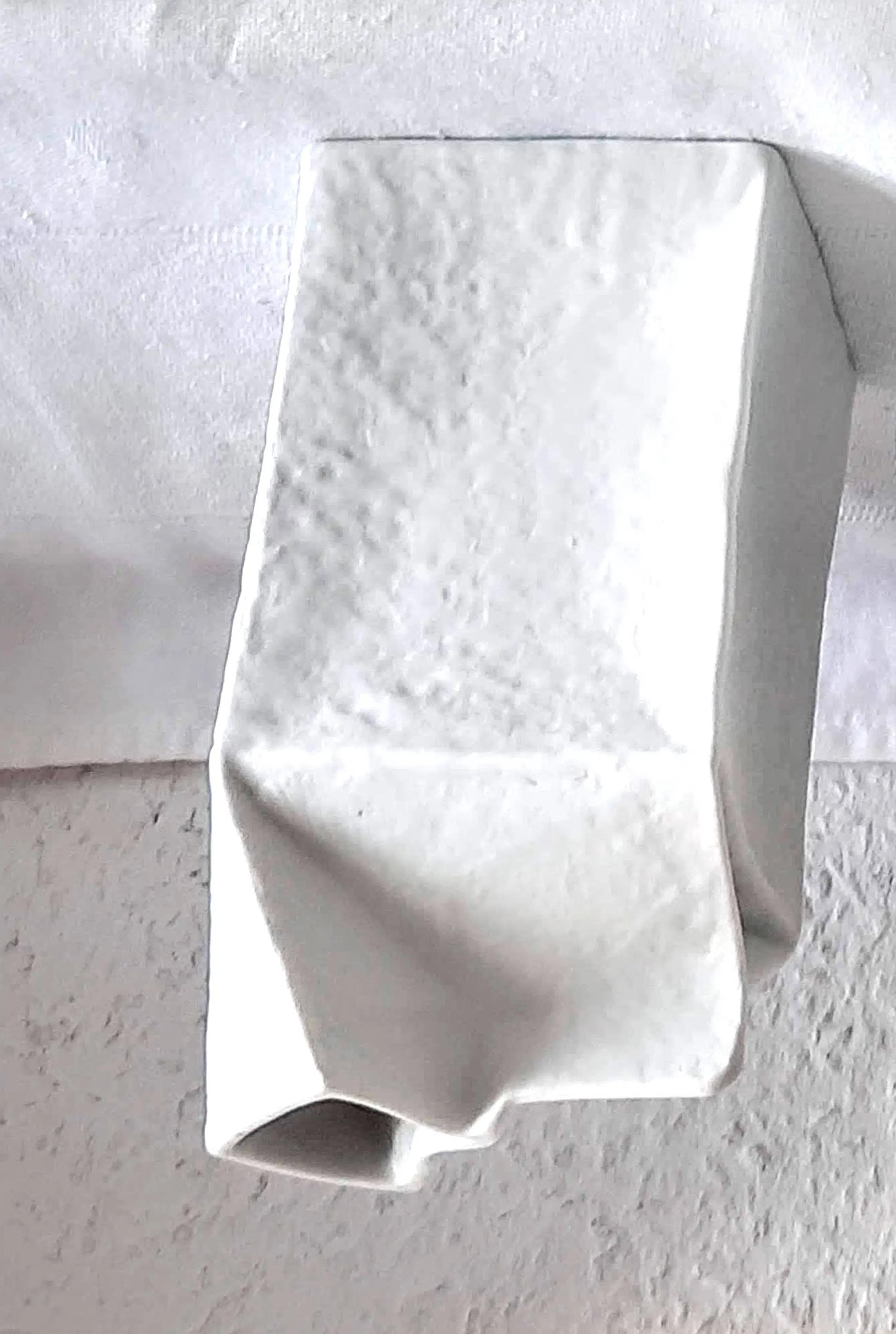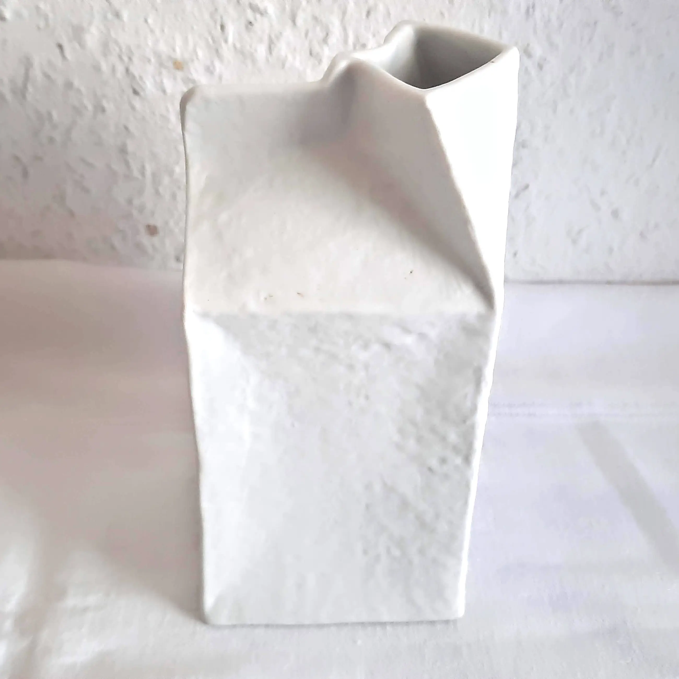 De witte vaas in de vorm van een open melkpak met een gestructureerd oppervlak is ontworpen door Frogen Yang en is gesigneerd. De vaas heeft een hoogte van 13 cm en een breedte van 6 cm.