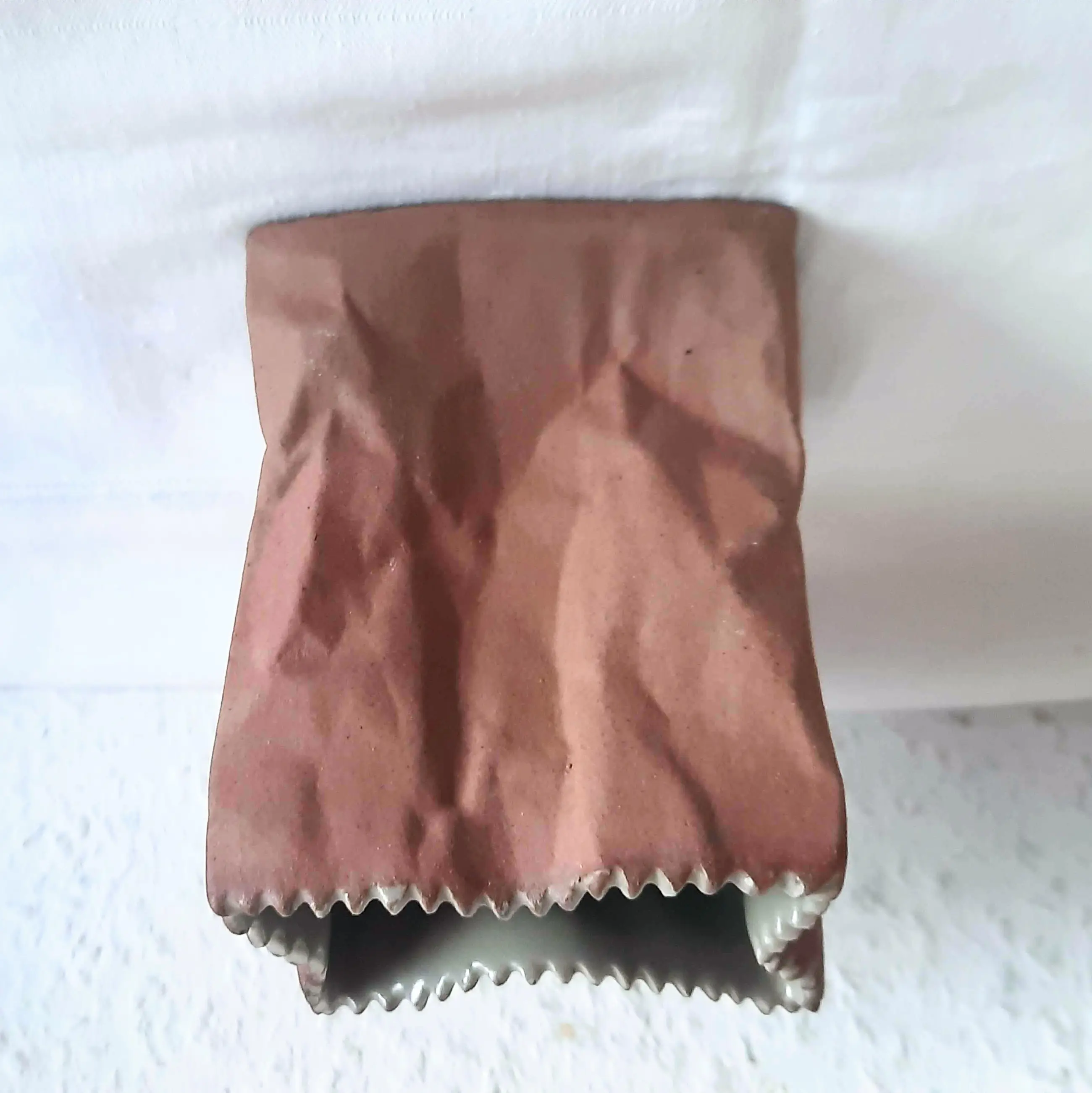 De papieren zakvaas, in de vorm van een verfrommelde bruine papieren zak, ontworpen in 1977 door de Finse ontwerper Tapio Wirkkala, heeft een hoogte van 11 cm en een breedte van 8 cm.