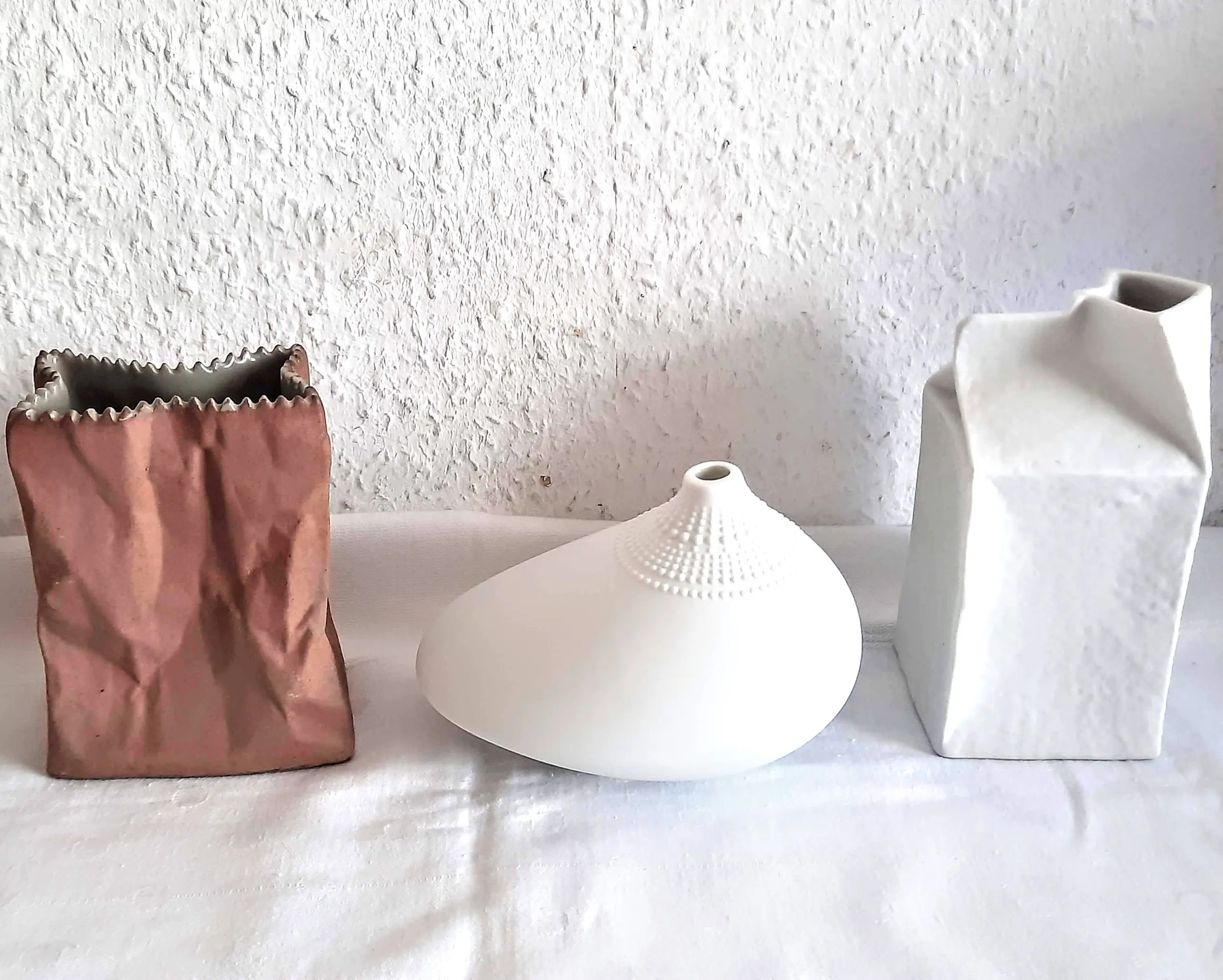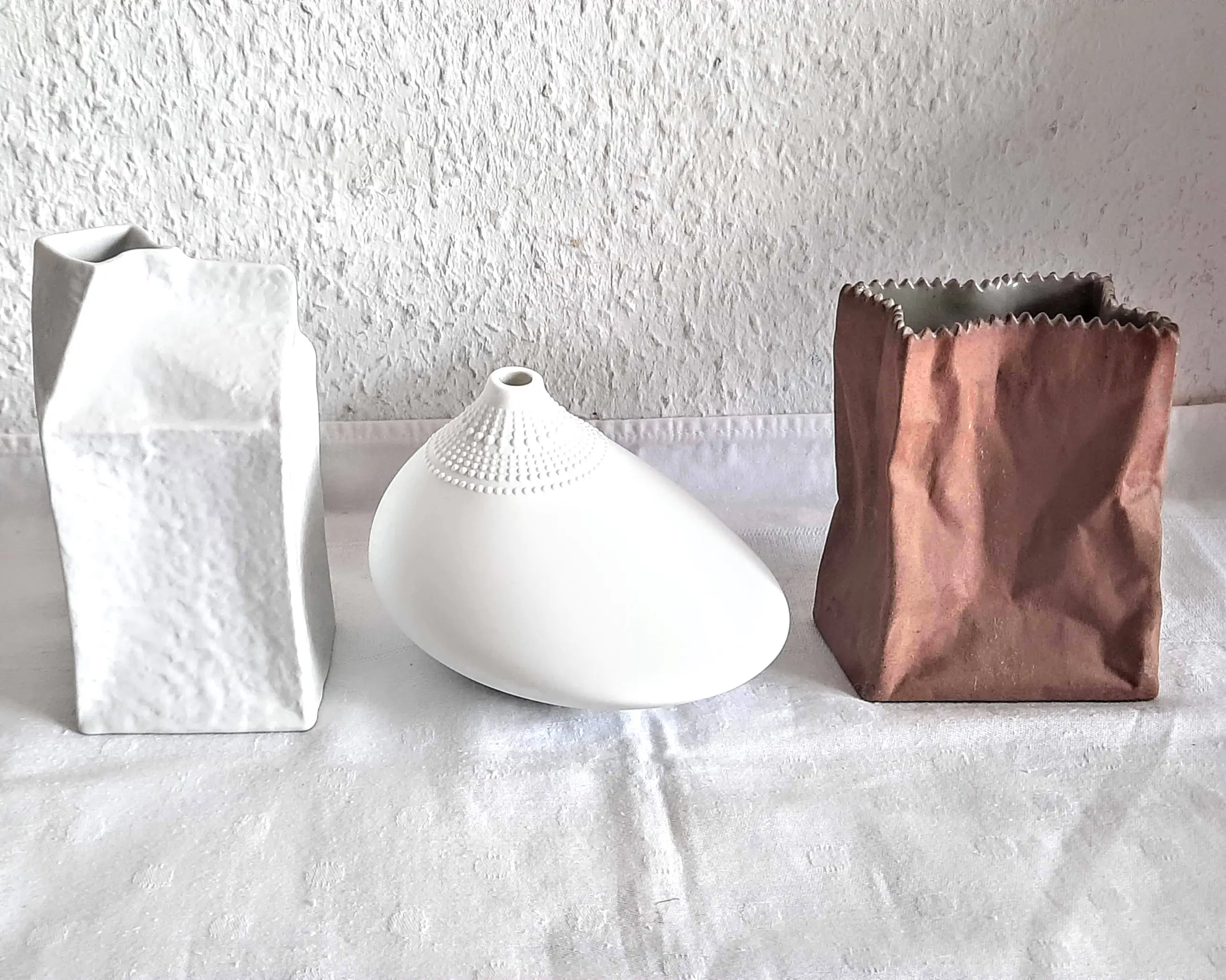 Drie zeer mooie en bijzondere vazen van biscuitporselein uit de "Studio-Line" collectie van Rosenthal, uit de jaren 70, die indruk maken met hun onconventionele ontwerp, geïnspireerd op alledaagse voorwerpen.