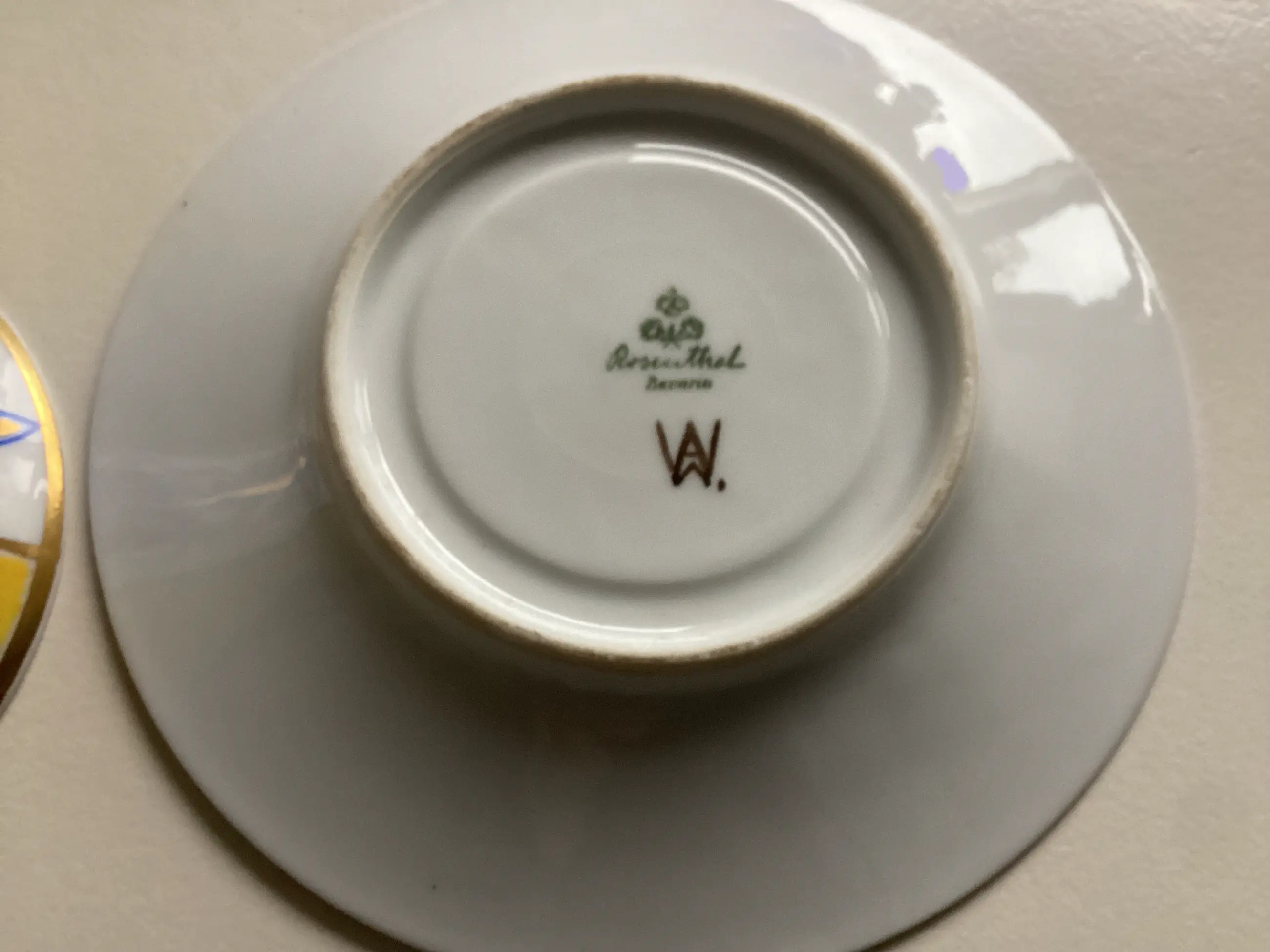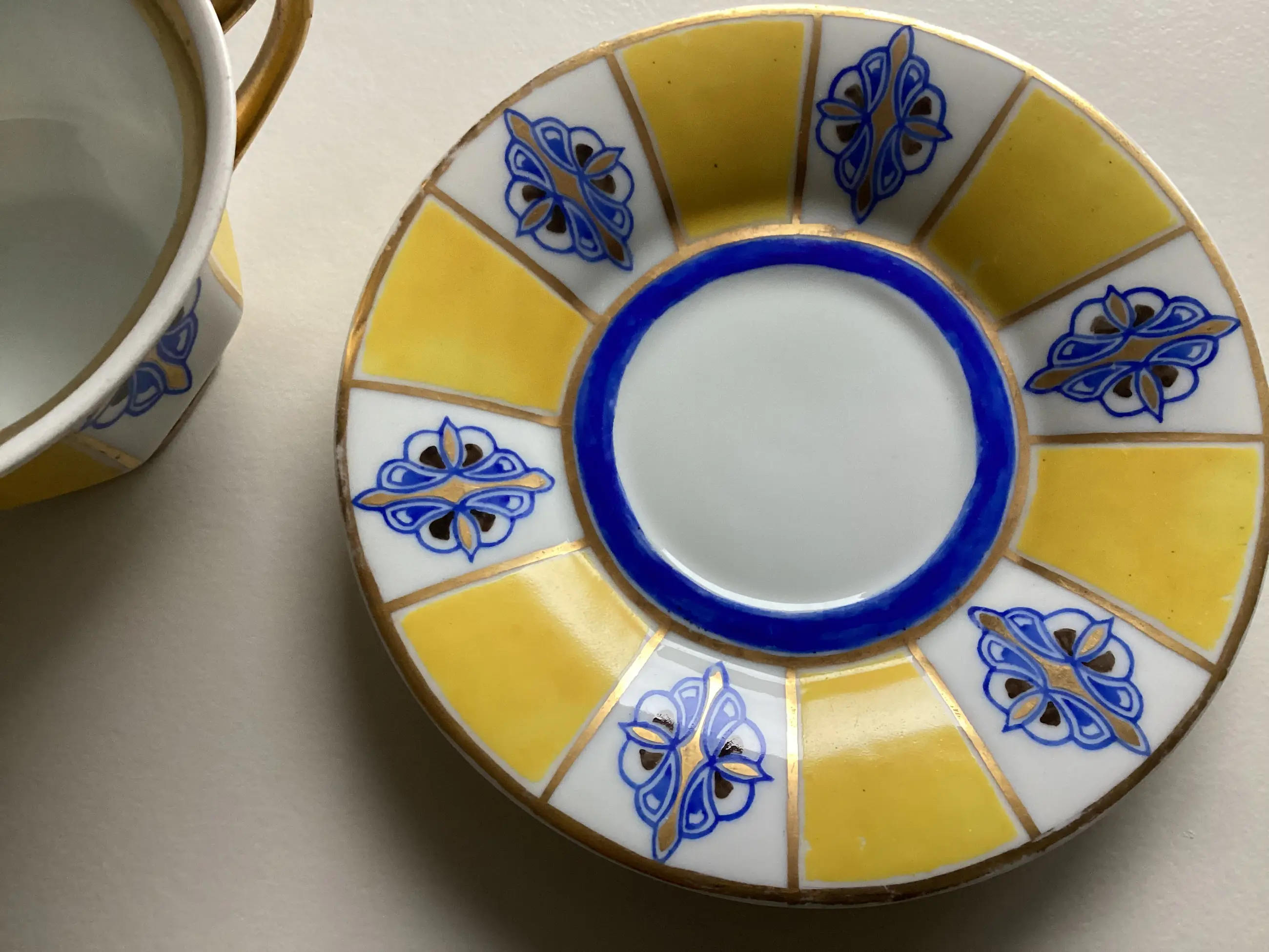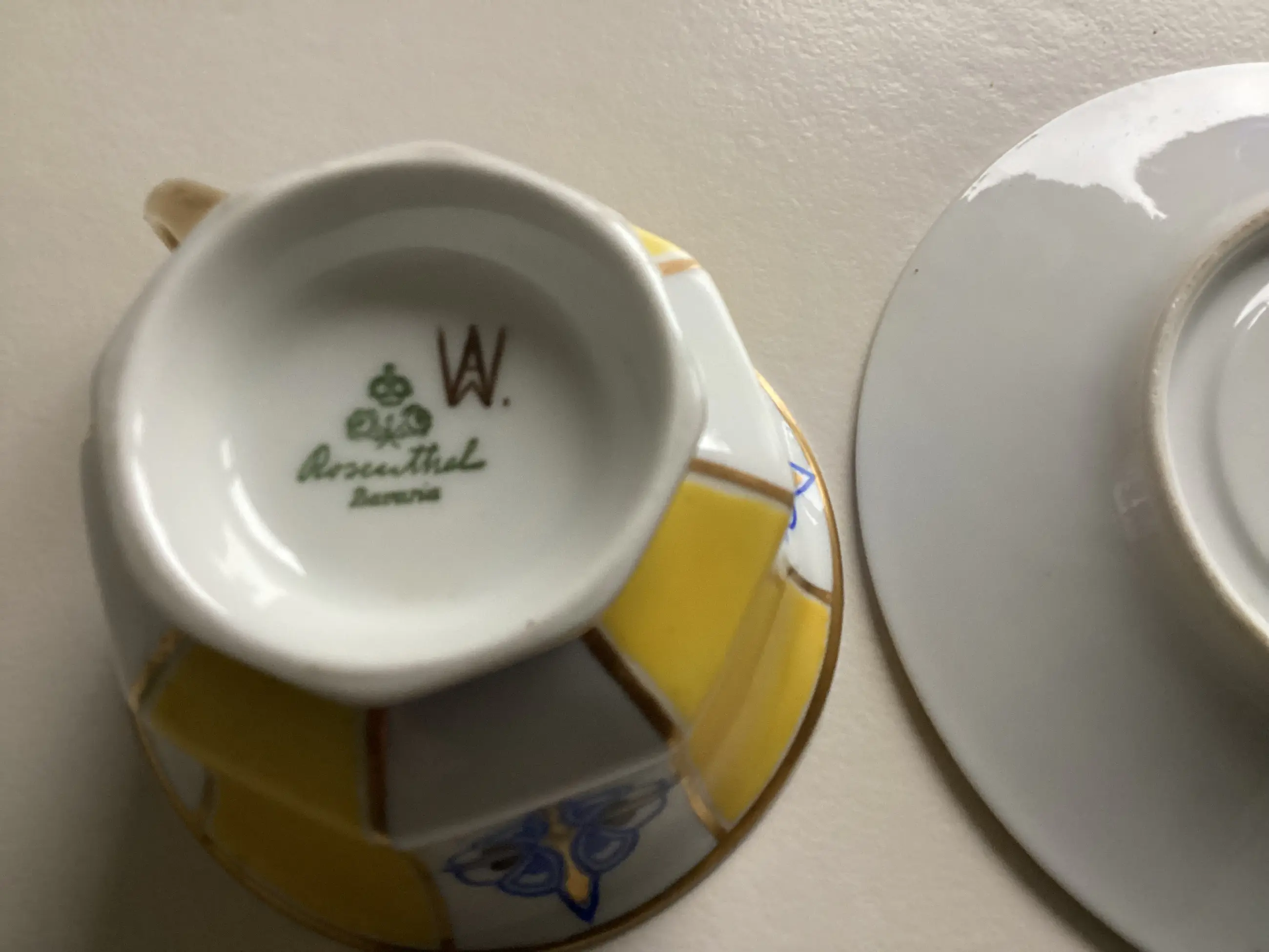 Hand beschilderde theekop en -schotel van Rosenthal/ Bavaria. Art Deco stijl, uitgevoerd in geel en blauw met vergulde elementen. Duitsland, begin 20e eeuw. Onderop hand gesigneerd met initialen WA plus stempel Rosenthal/Bavaria. Op klein scheurtje na aan bovenrand in goede conditie gezien de leeftijd ( scheurtje begint boven aan rand en loopt in totaal 1 cm door tot enkele millimeters onder de horizontale vergulde rand - zie foto 7).