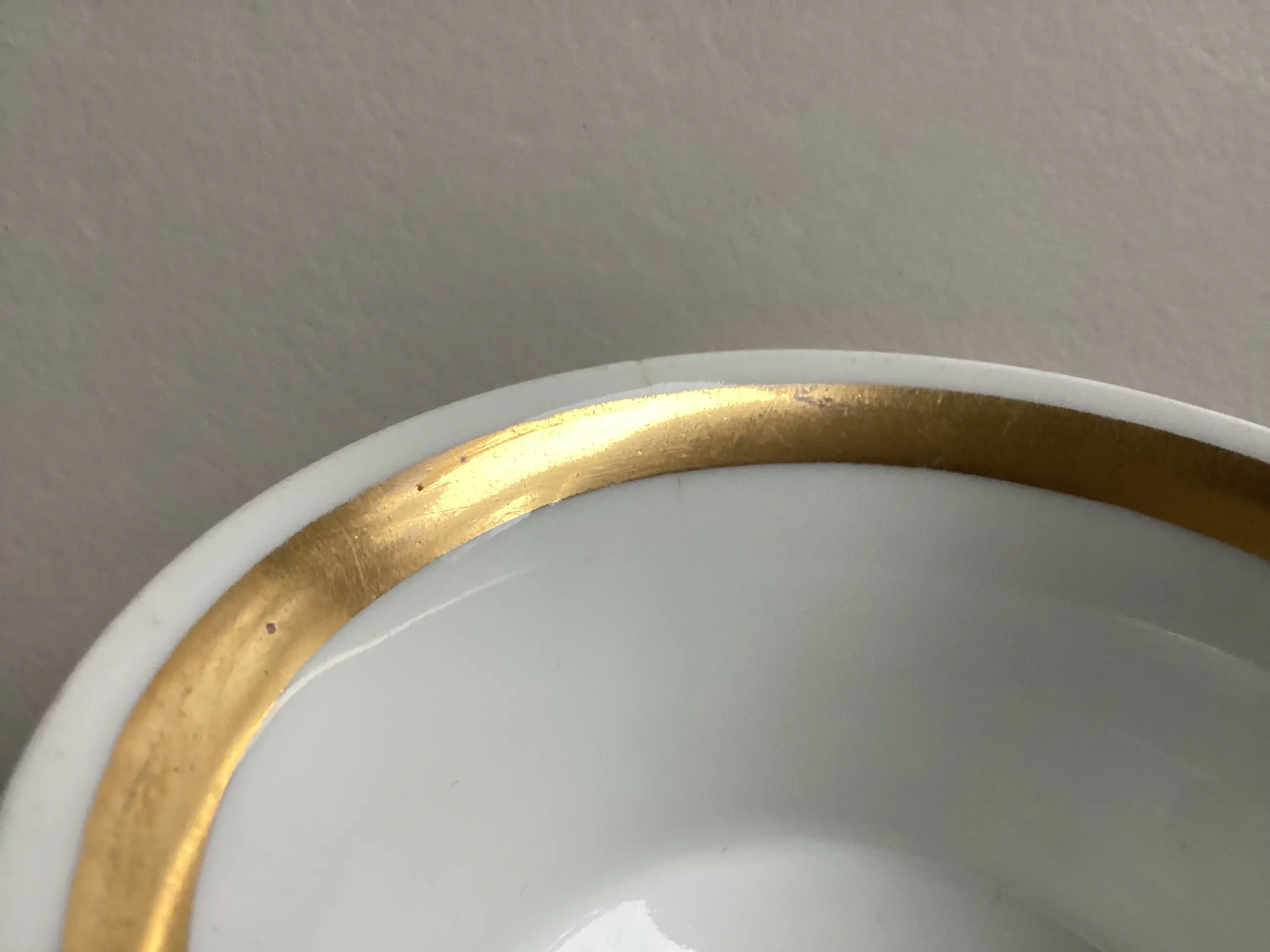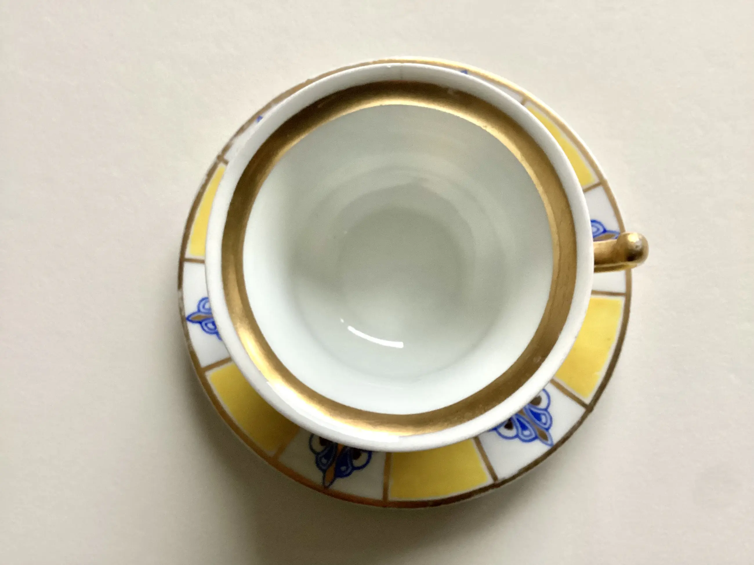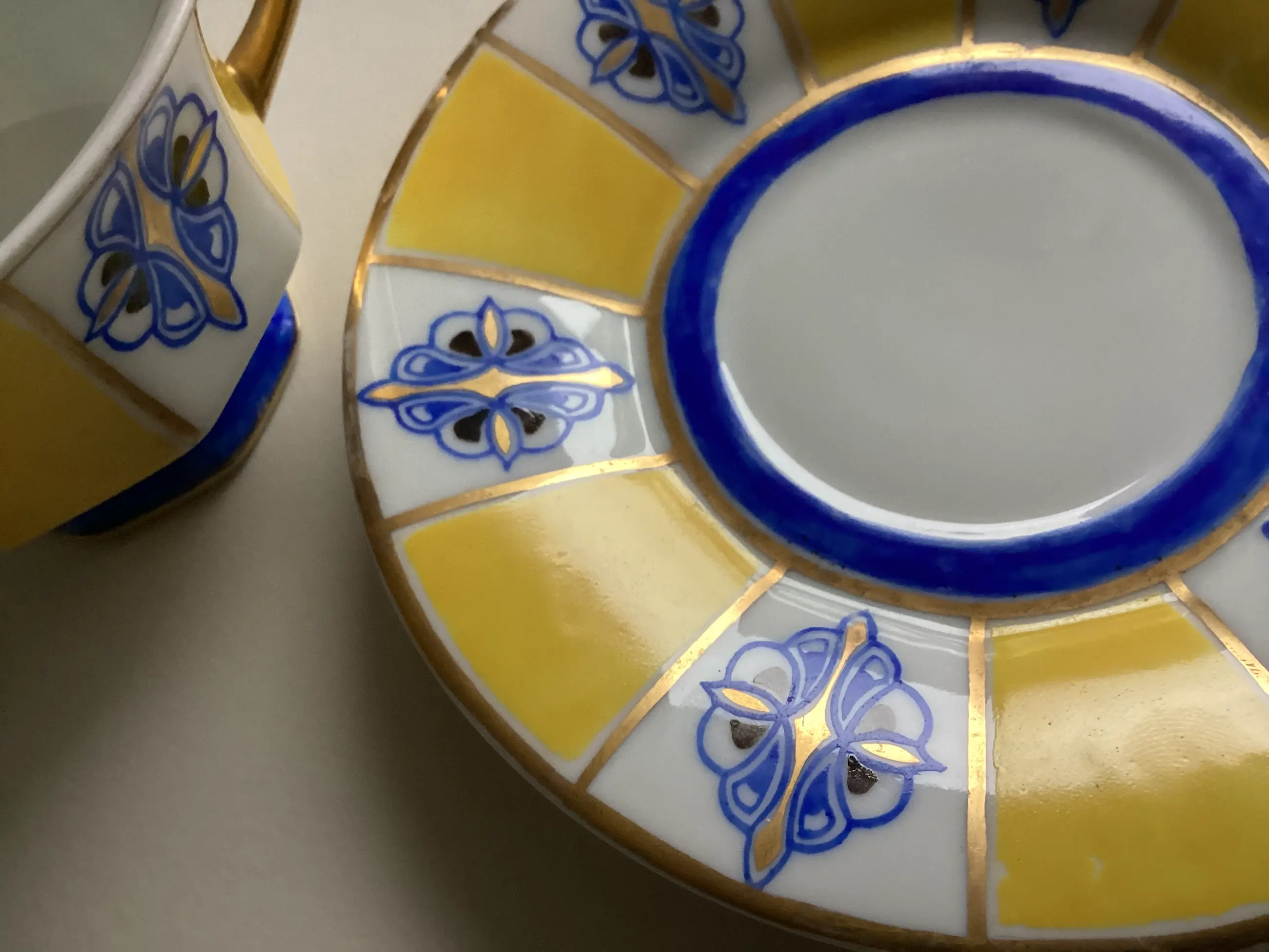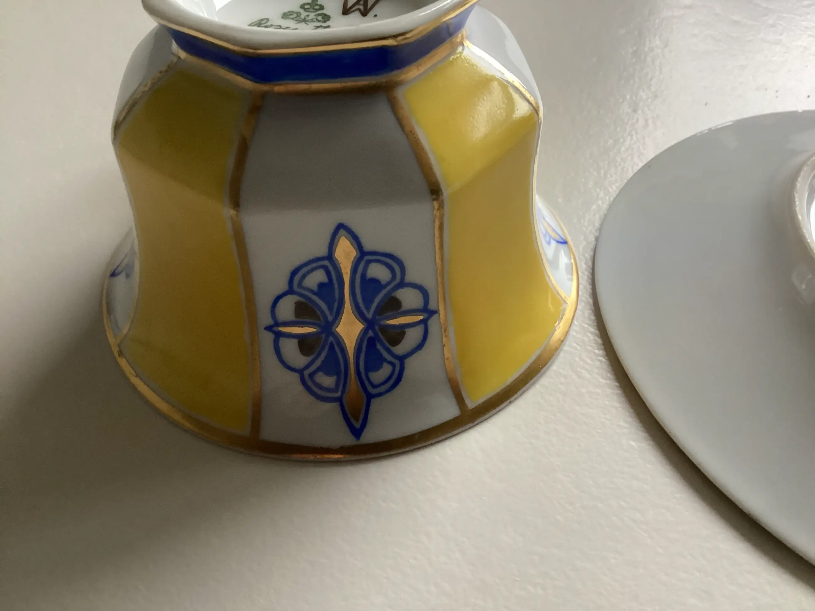 Hand beschilderde theekop en -schotel van Rosenthal/ Bavaria. Art Deco stijl, uitgevoerd in geel en blauw met vergulde elementen. Duitsland, begin 20e eeuw. Onderop hand gesigneerd met initialen WA plus stempel Rosenthal/Bavaria. Op klein scheurtje na aan bovenrand in goede conditie gezien de leeftijd ( scheurtje begint boven aan rand en loopt in totaal 1 cm door tot enkele millimeters onder de horizontale vergulde rand - zie foto 7).