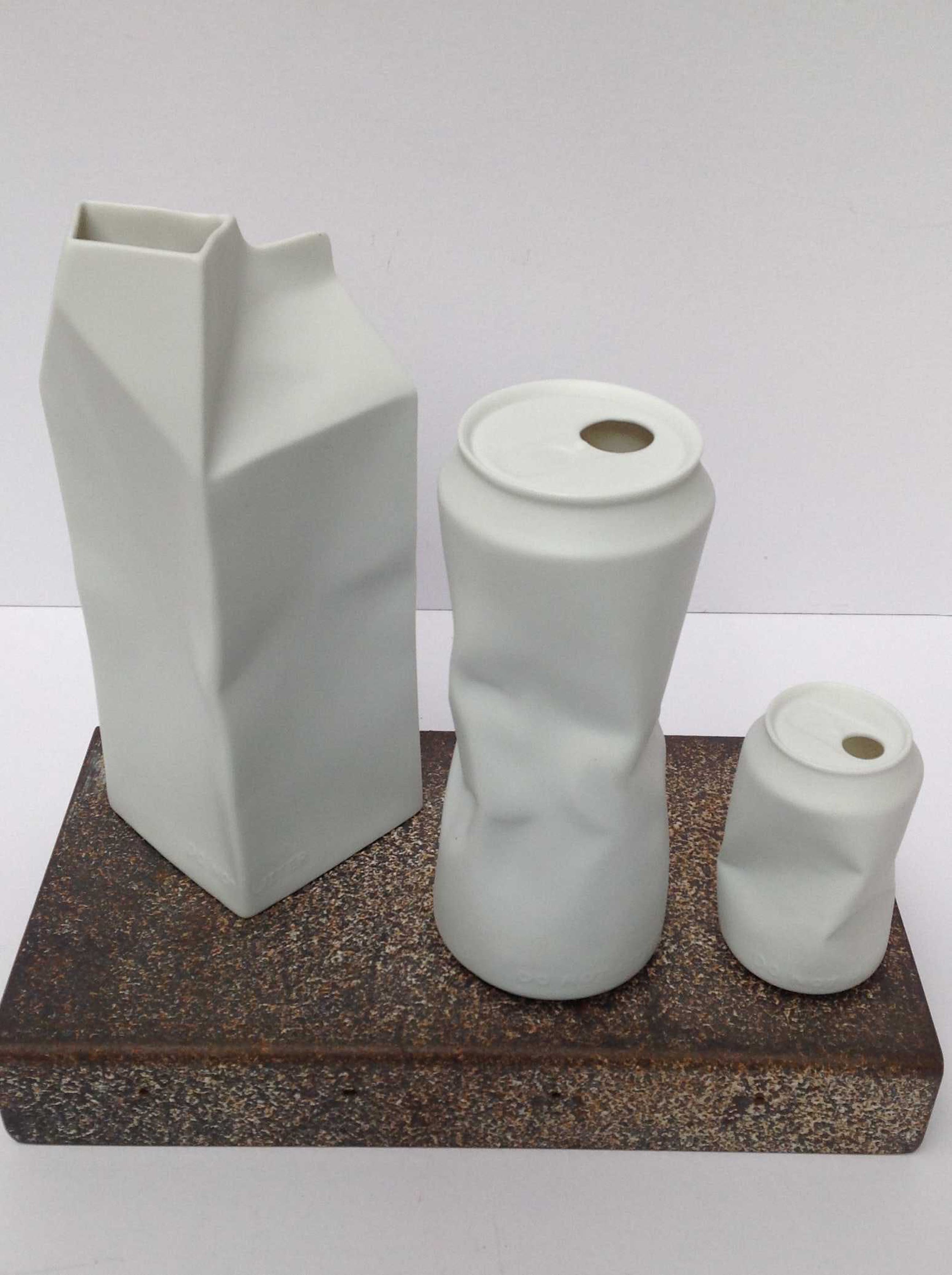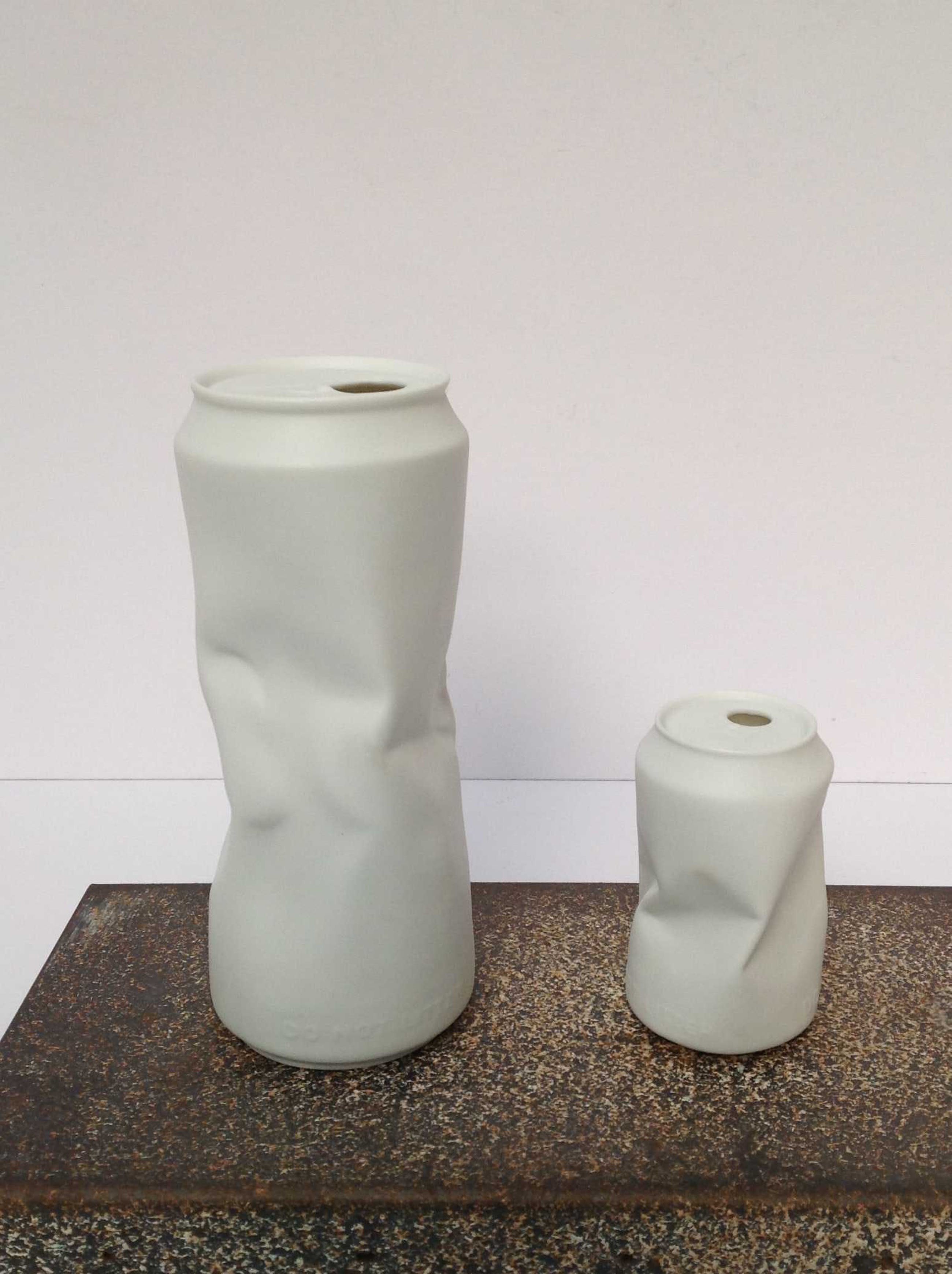 Prachtige, puntgave Blikvaas, Crazy Can van wit biscuit (mat) porselein, uit de serie Do not Litter van Rosenthal. Miniem puntje zit in het porselein.