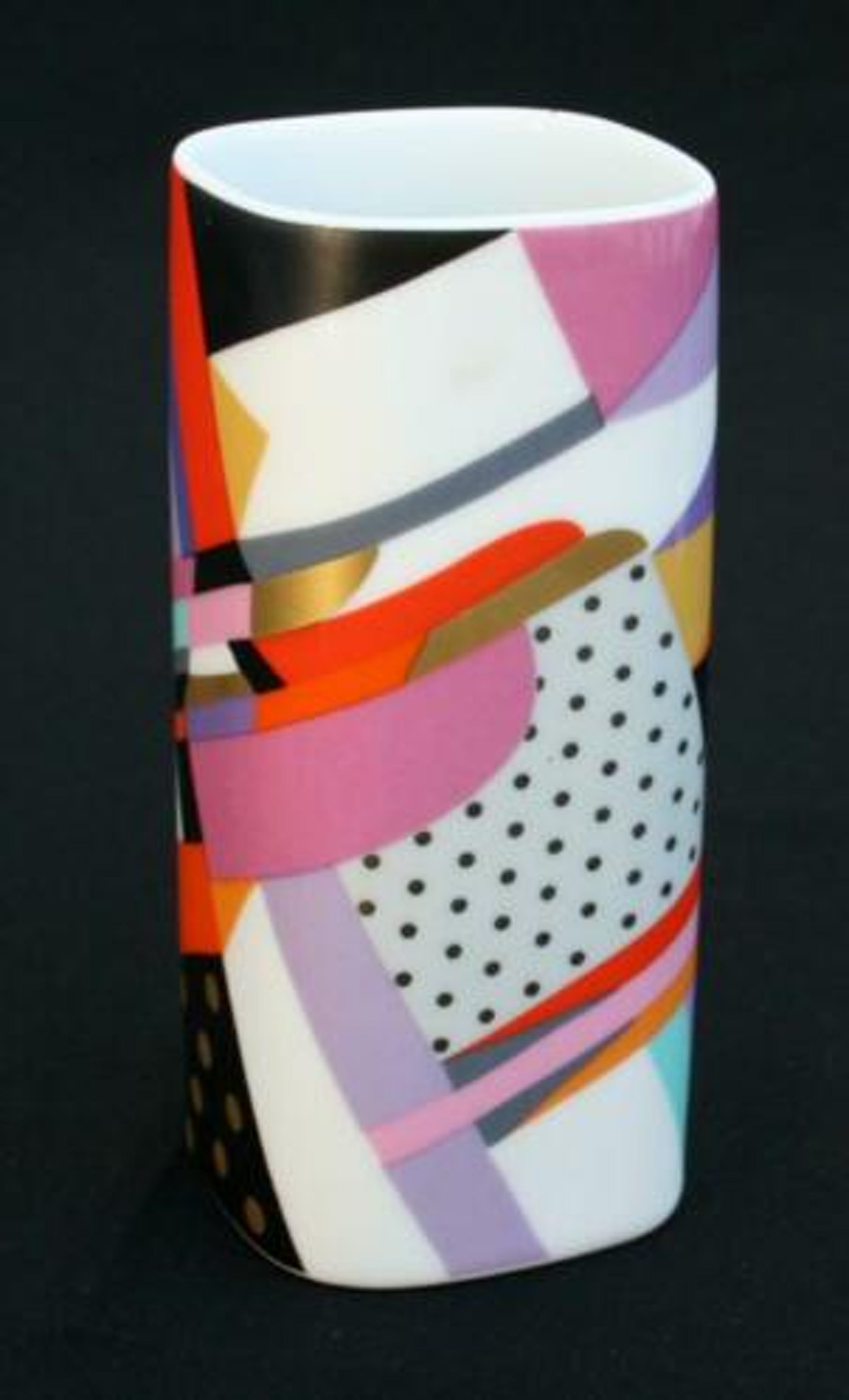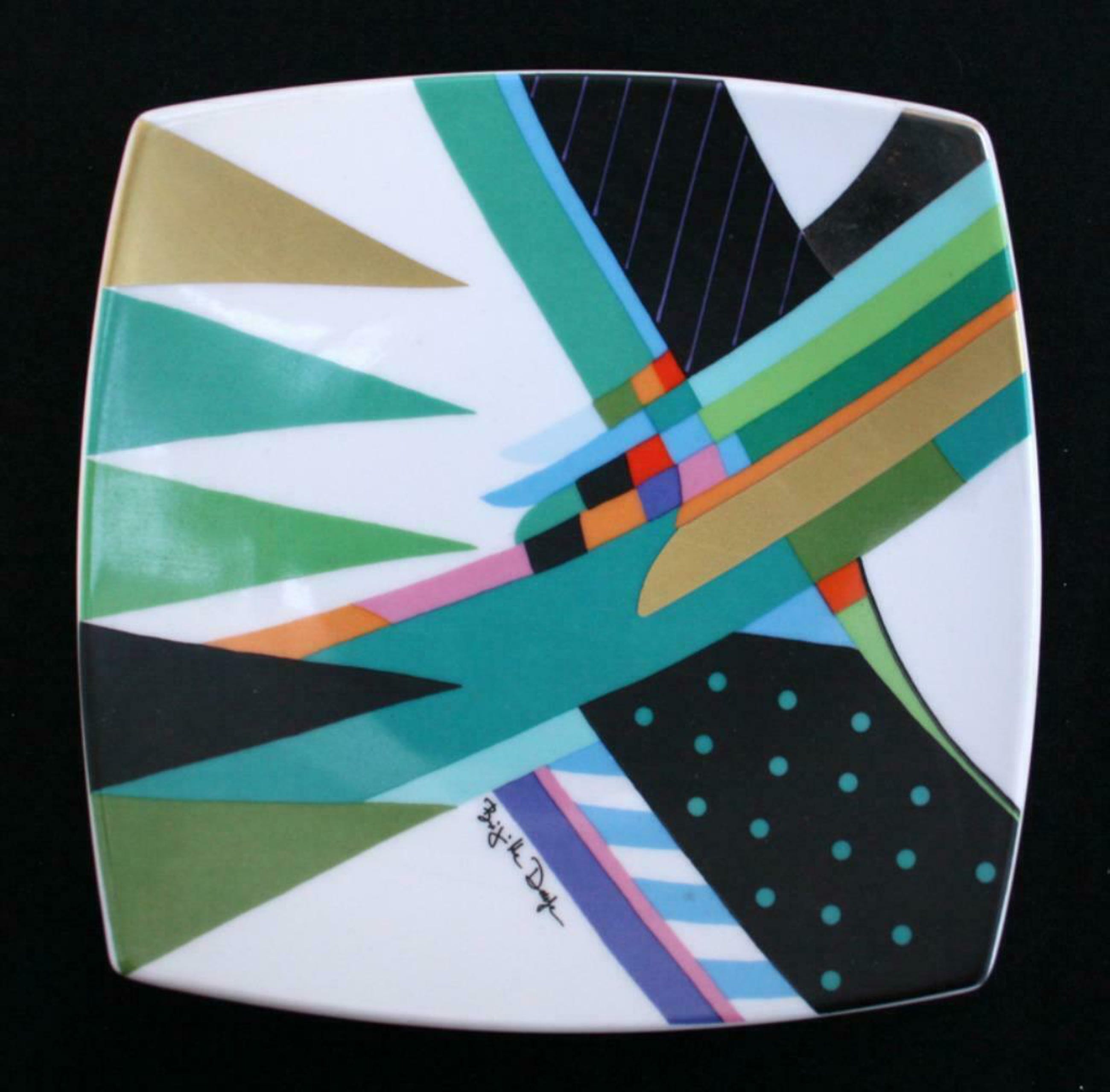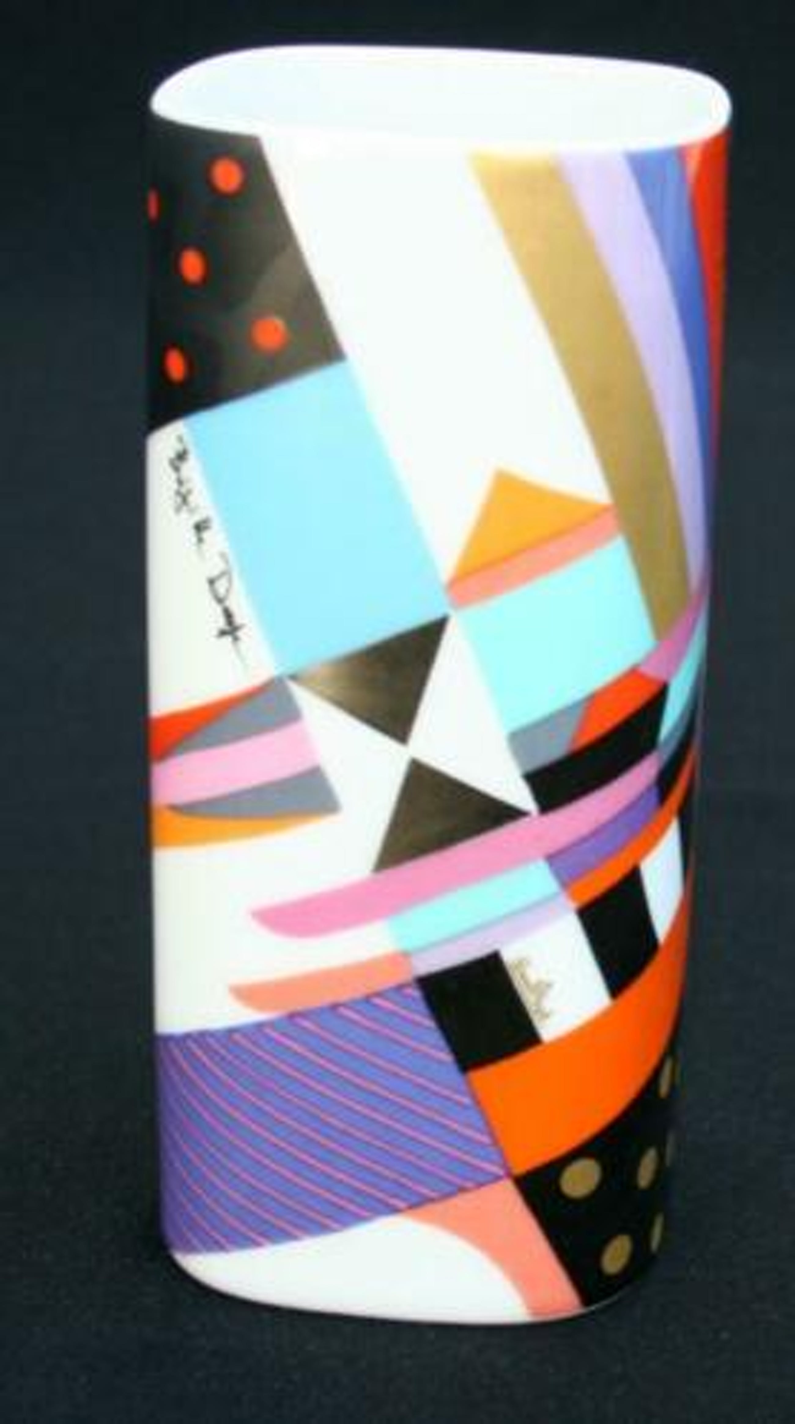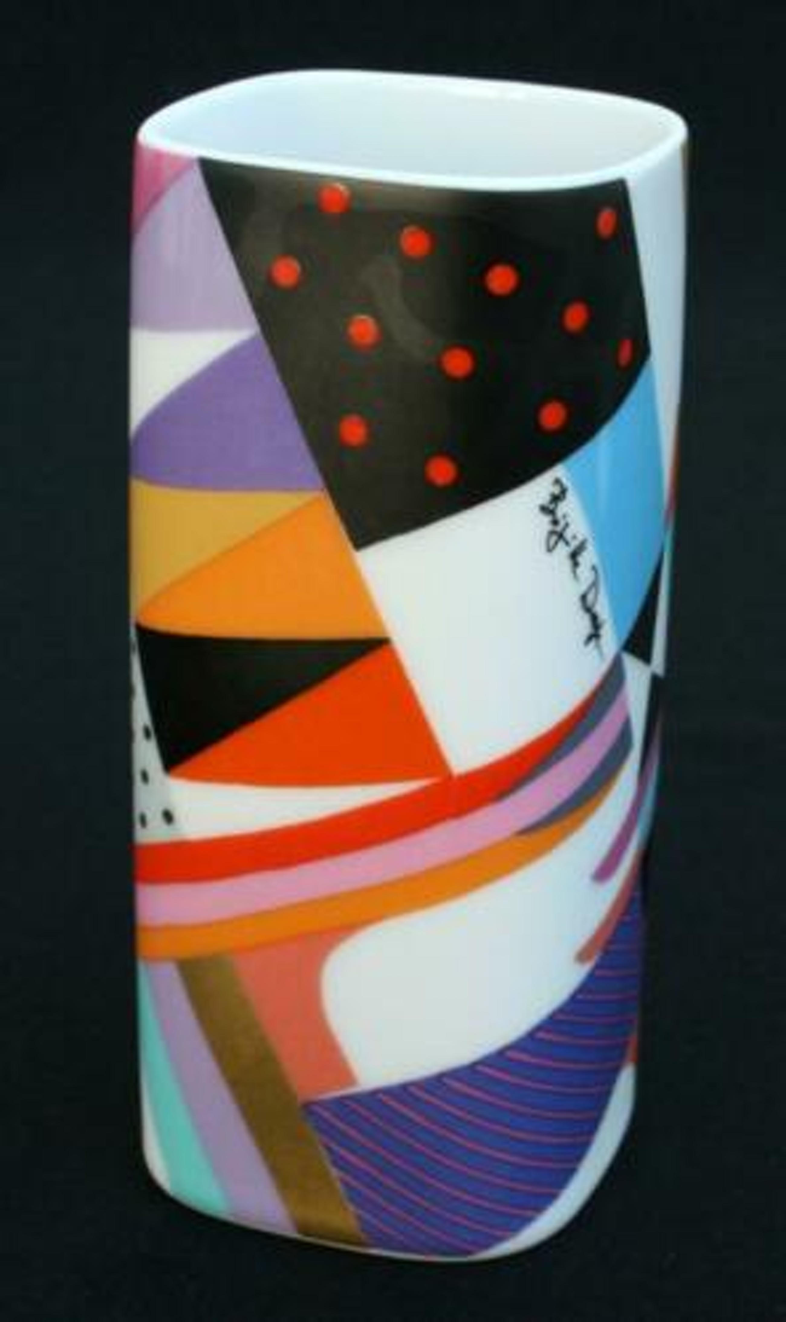 Zeer kleurrijk en decoratief door verschillende technieken deze vaas 15 x 6,5 x 6,5 cm en schaal 4 x 18 x 18 cm gemaakt bij Rosenthal ontworpen door Brigitte Doege met signatuur ingebakkem
