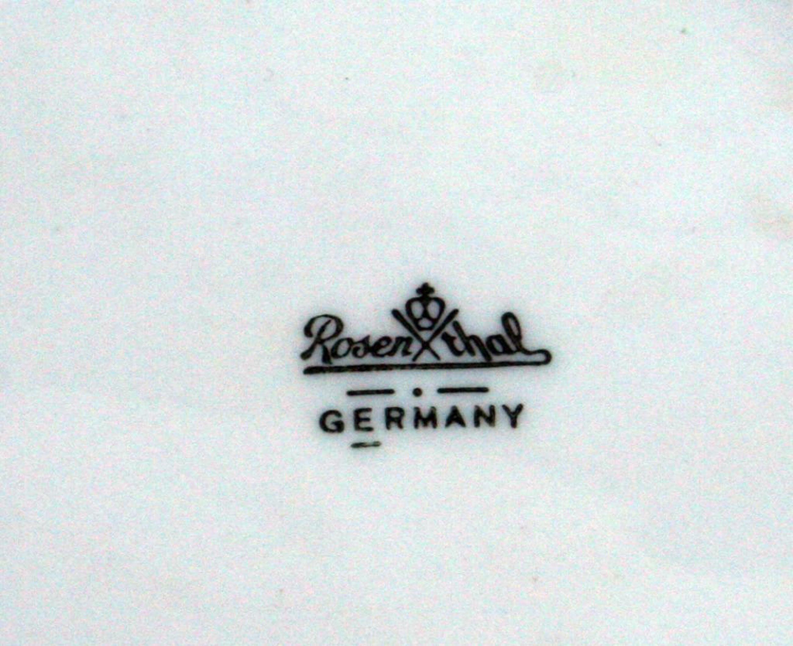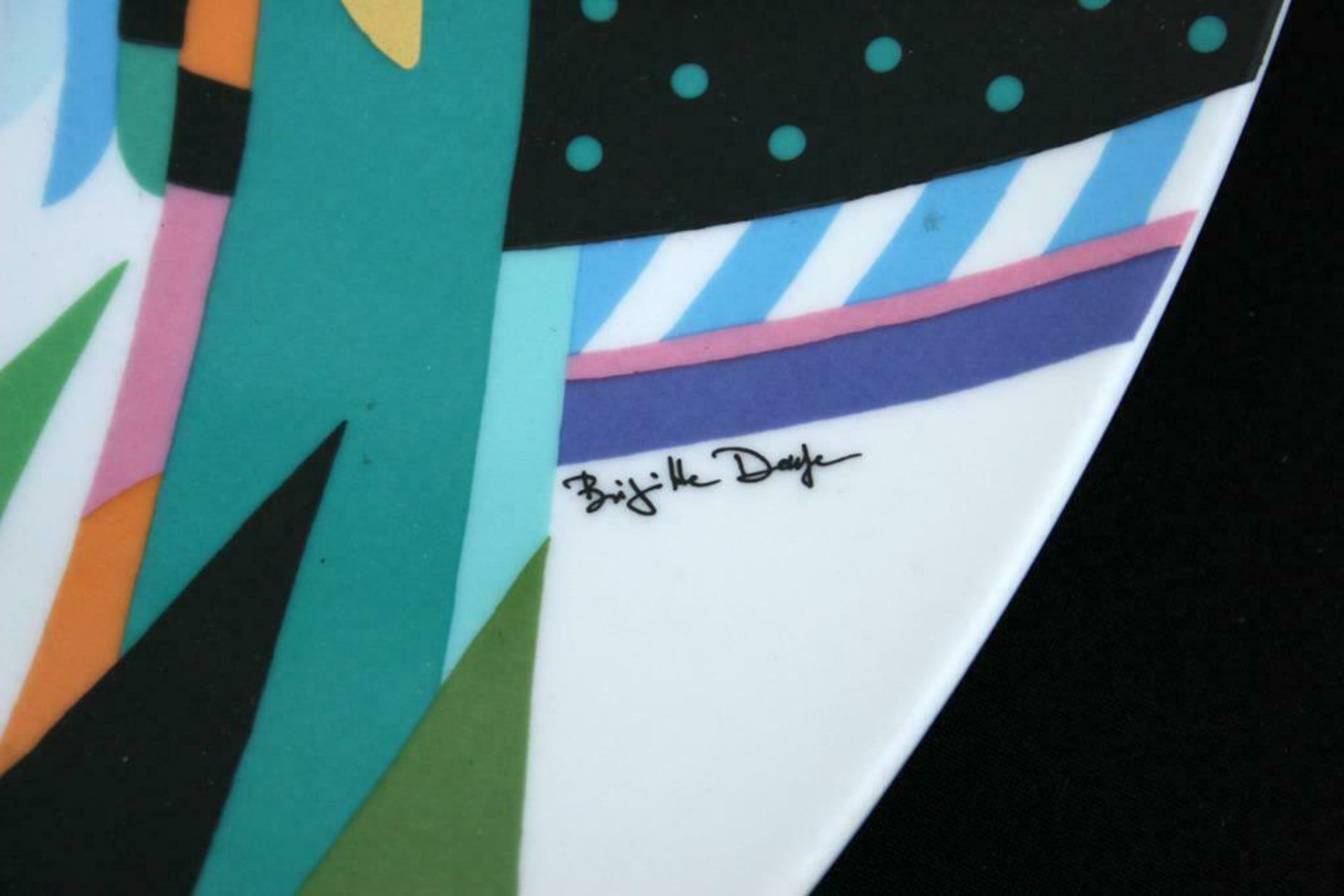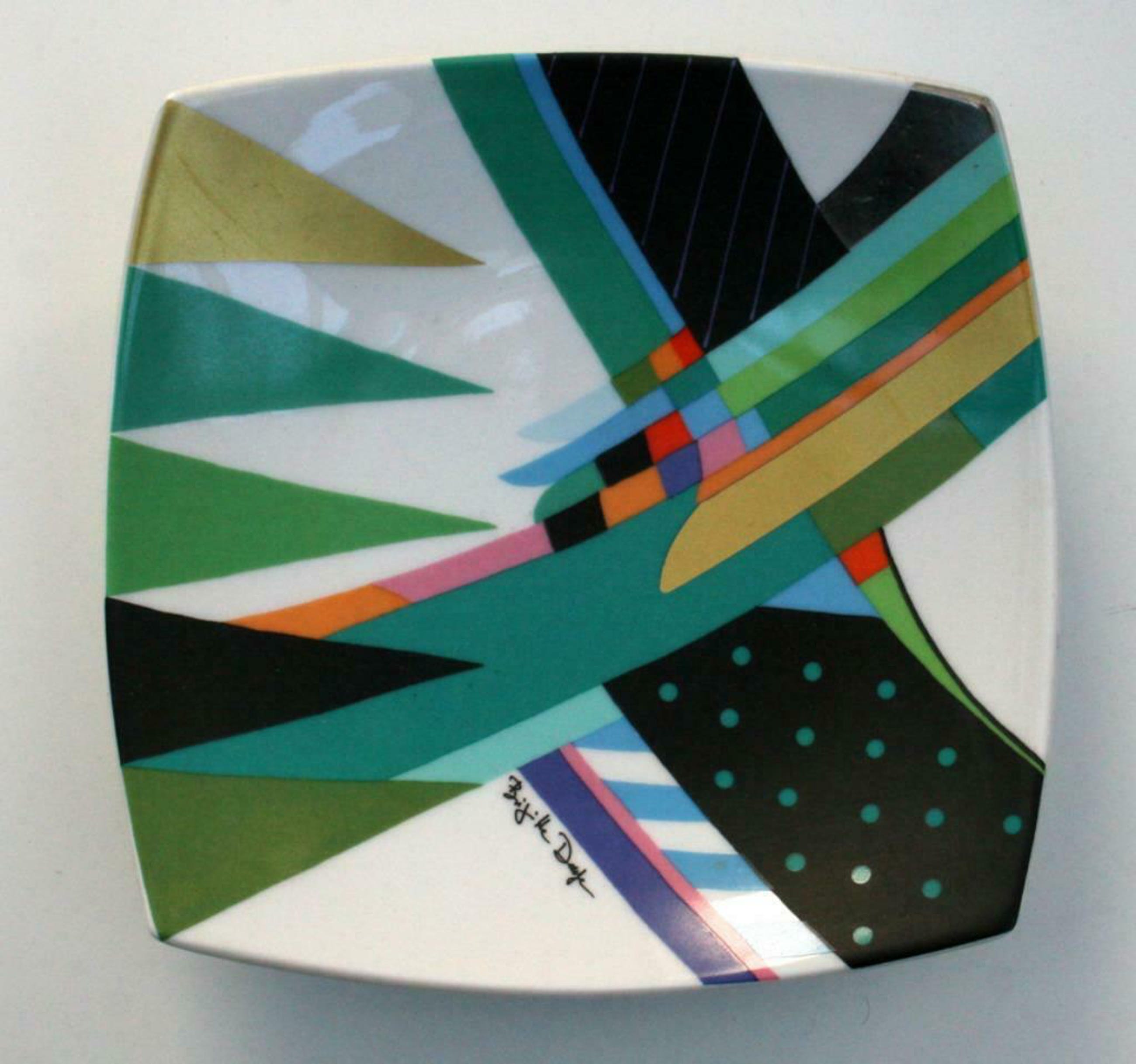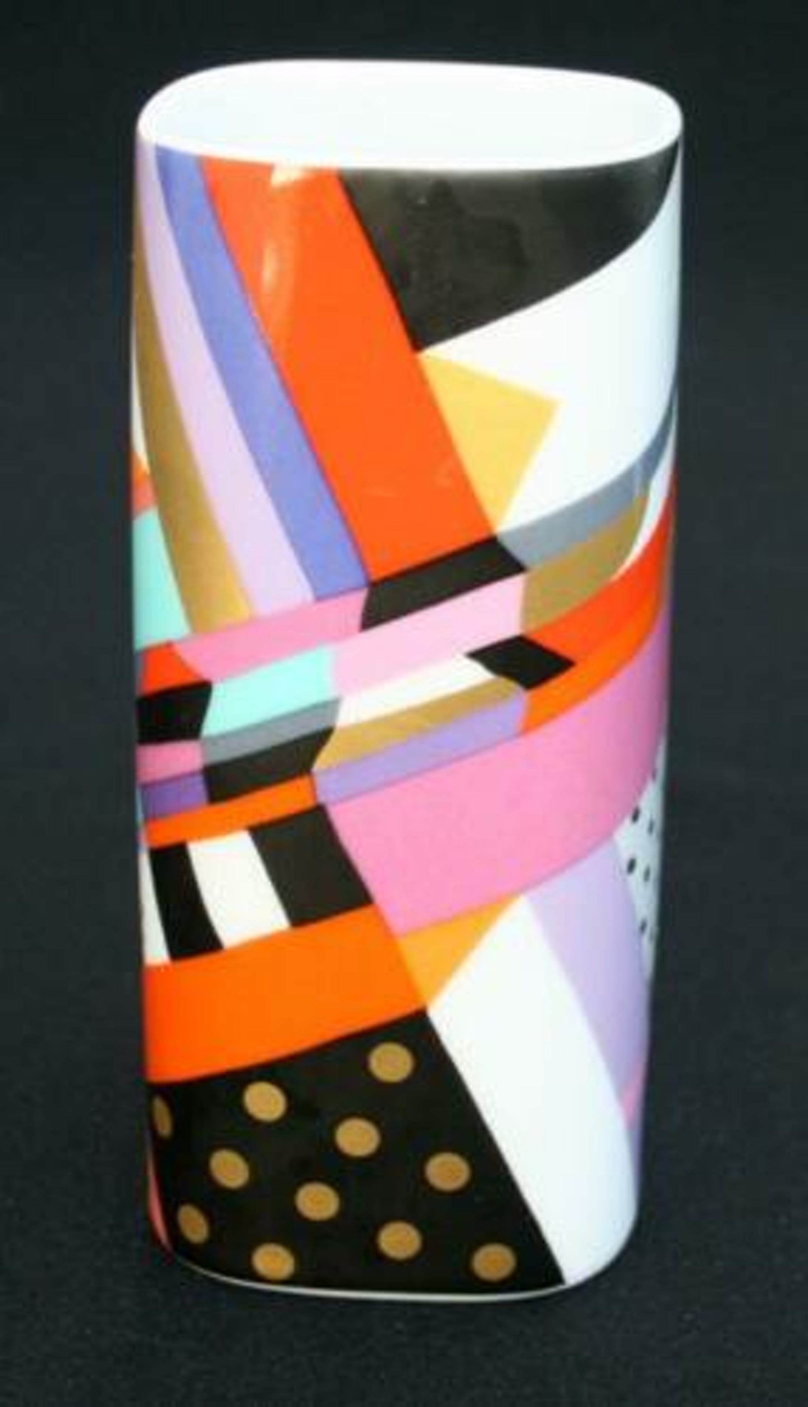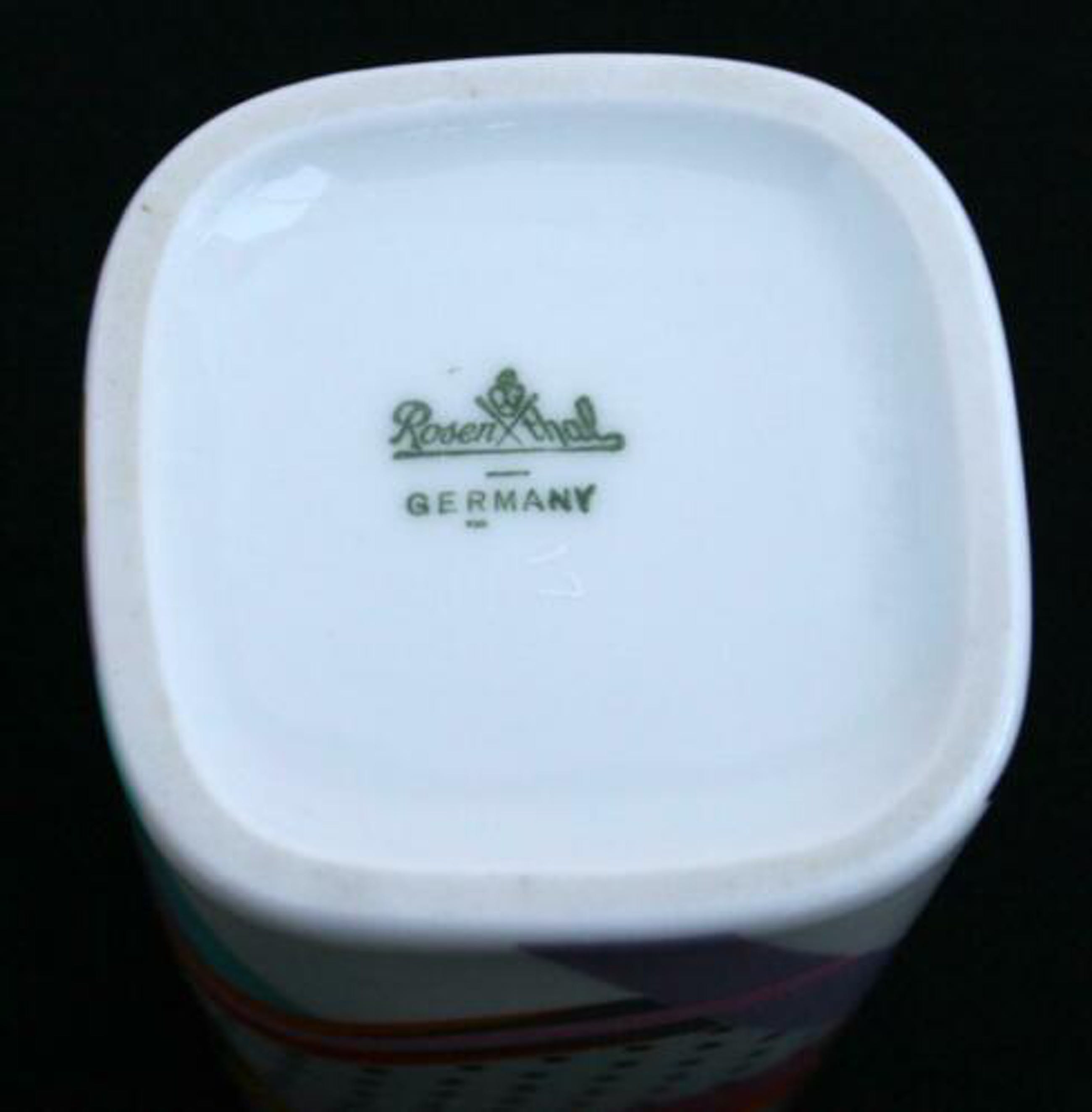 Zeer kleurrijk en decoratief door verschillende technieken deze vaas 15 x 6,5 x 6,5 cm en schaal 4 x 18 x 18 cm gemaakt bij Rosenthal ontworpen door Brigitte Doege met signatuur ingebakkem