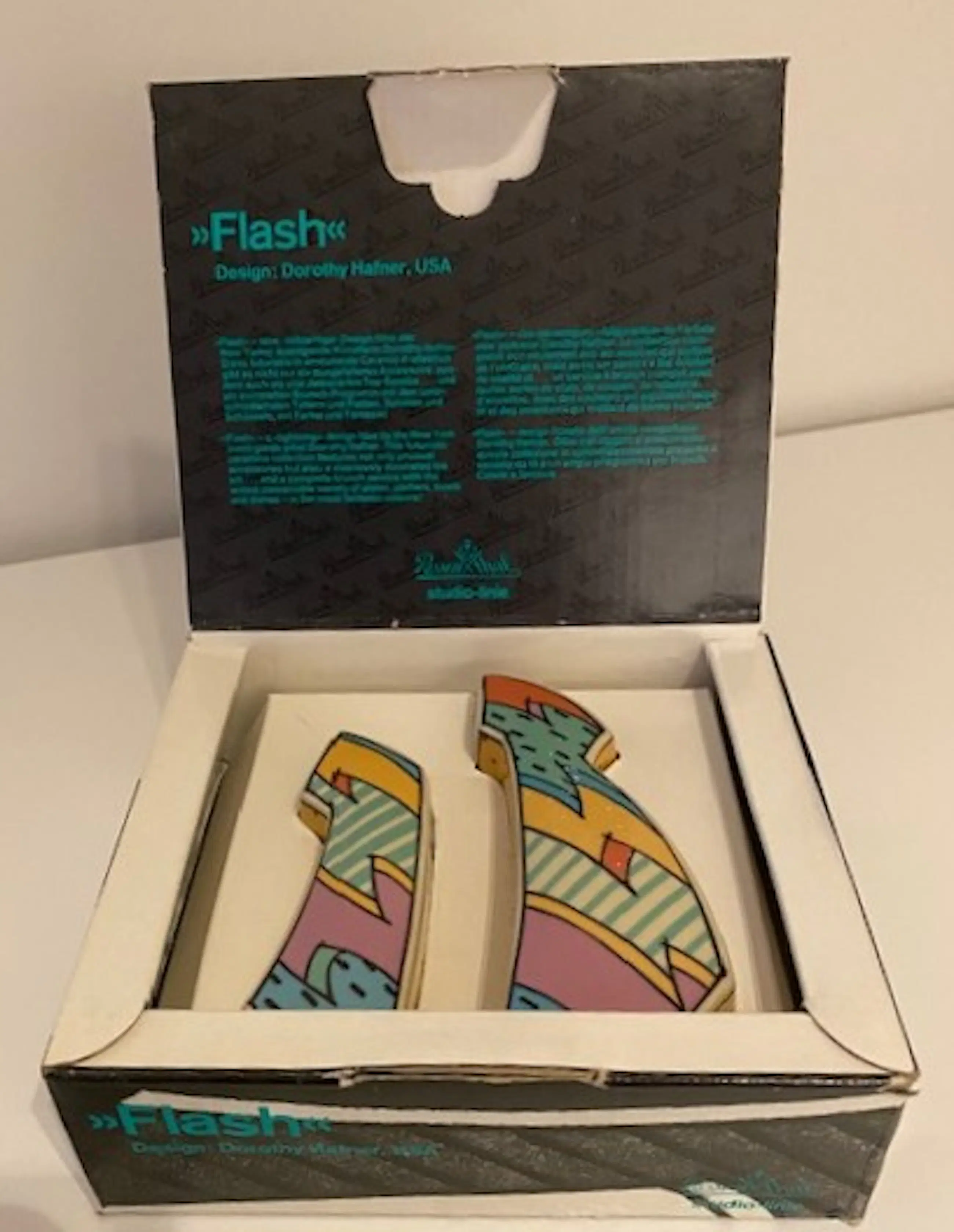 Peper & zoutstel Flash One in Memphis style Ontwerp Dorothy Hafner (1952) in 1980's In originele doos met toelichting Gesigneerd op beide onderdelen Uitvoering Rosenthal Studio Line (kunstafdeling)