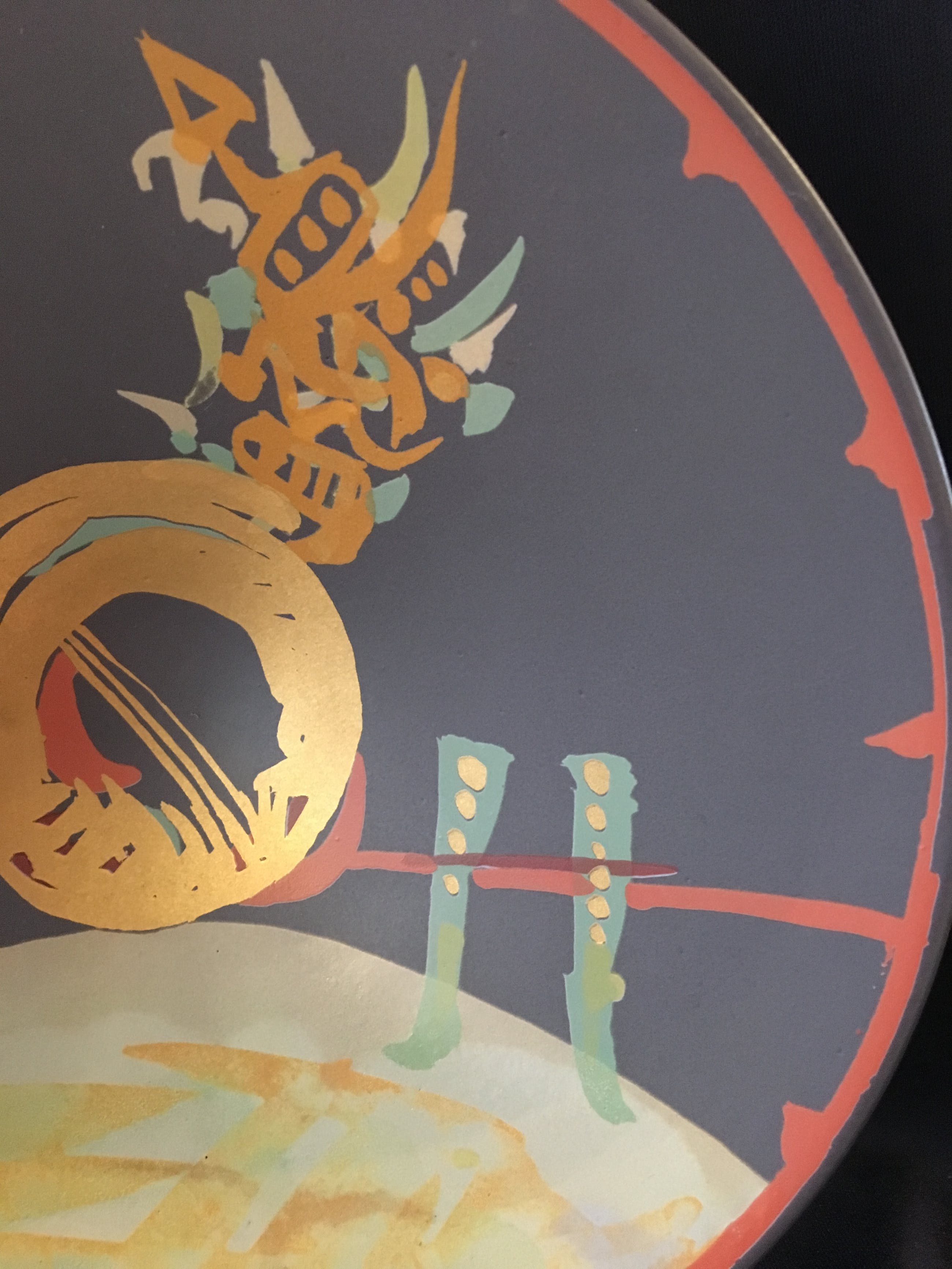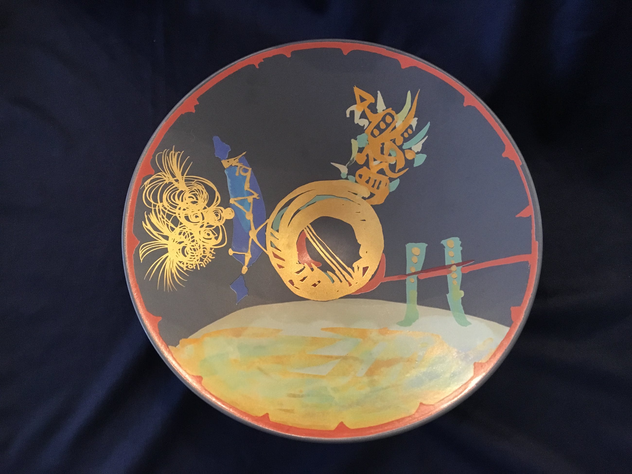 Decoratieve schaal ontworpen door de Franse meester ceramist en schilder Gilbert Portanier. Geboren in 1926 In Cannes. Mooie blauwe glaze met kleurige en gouden abstracte beschilderingen. Wereldwijd verkocht en verzameld. Helemaal gaaf en onbeschadigd. Er wordt online het veelvoudige voor gevraagd. Zie foto’s