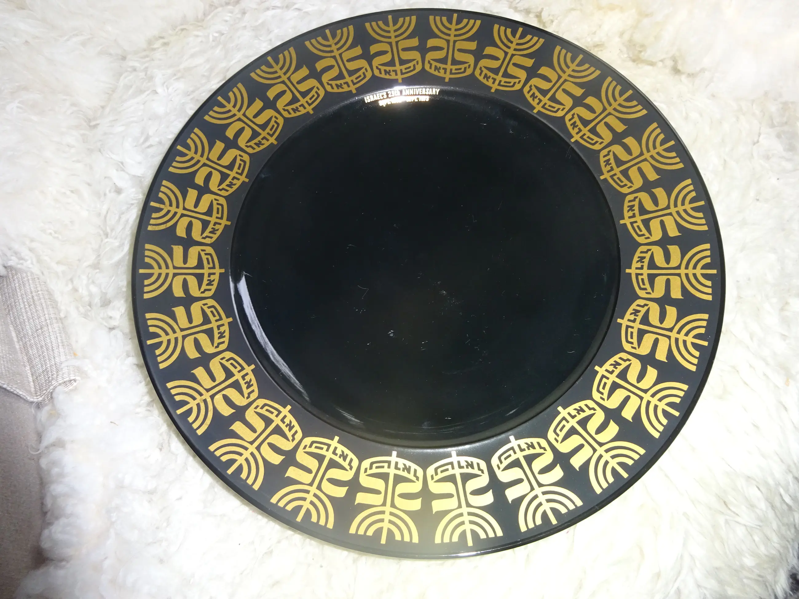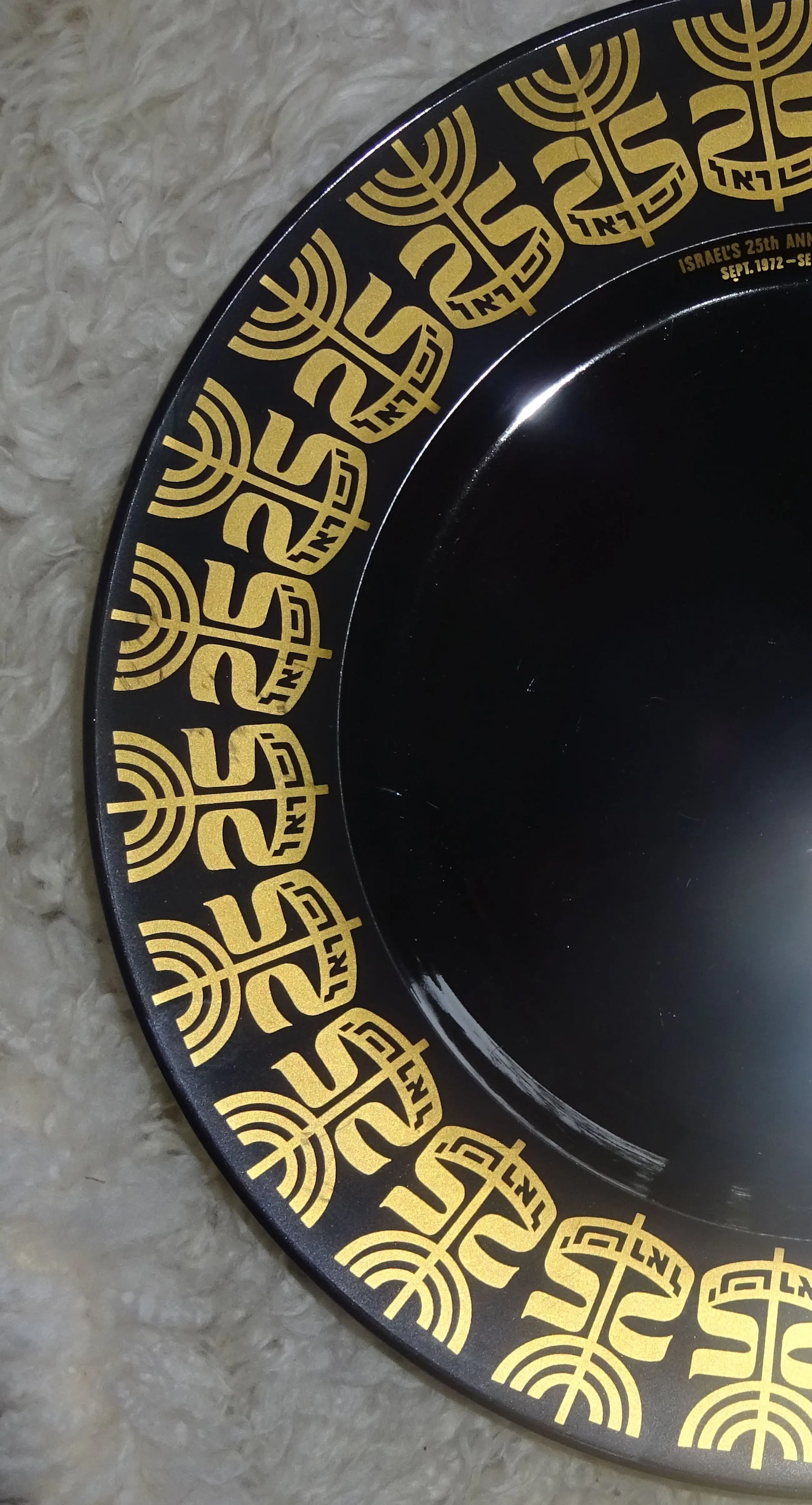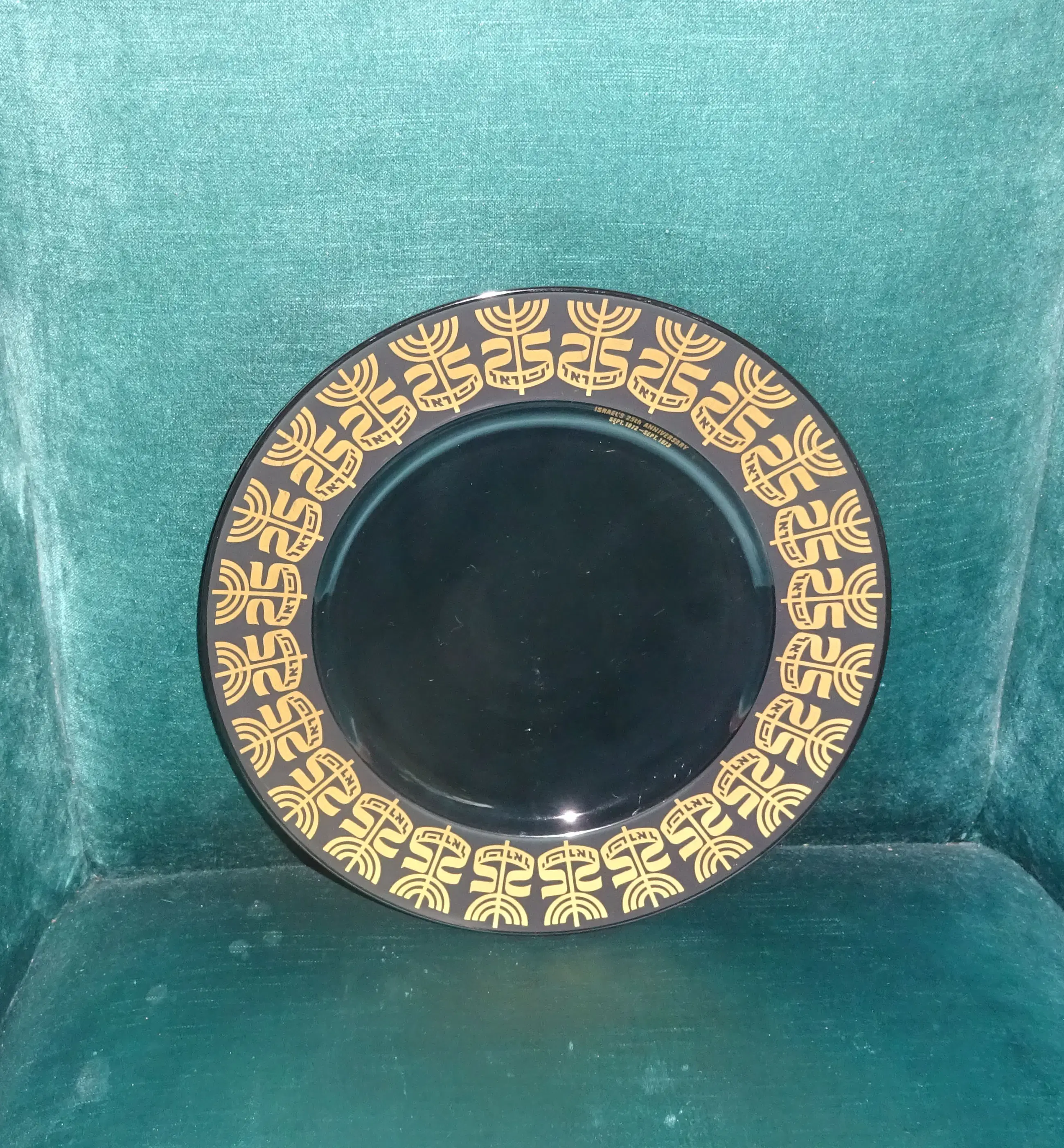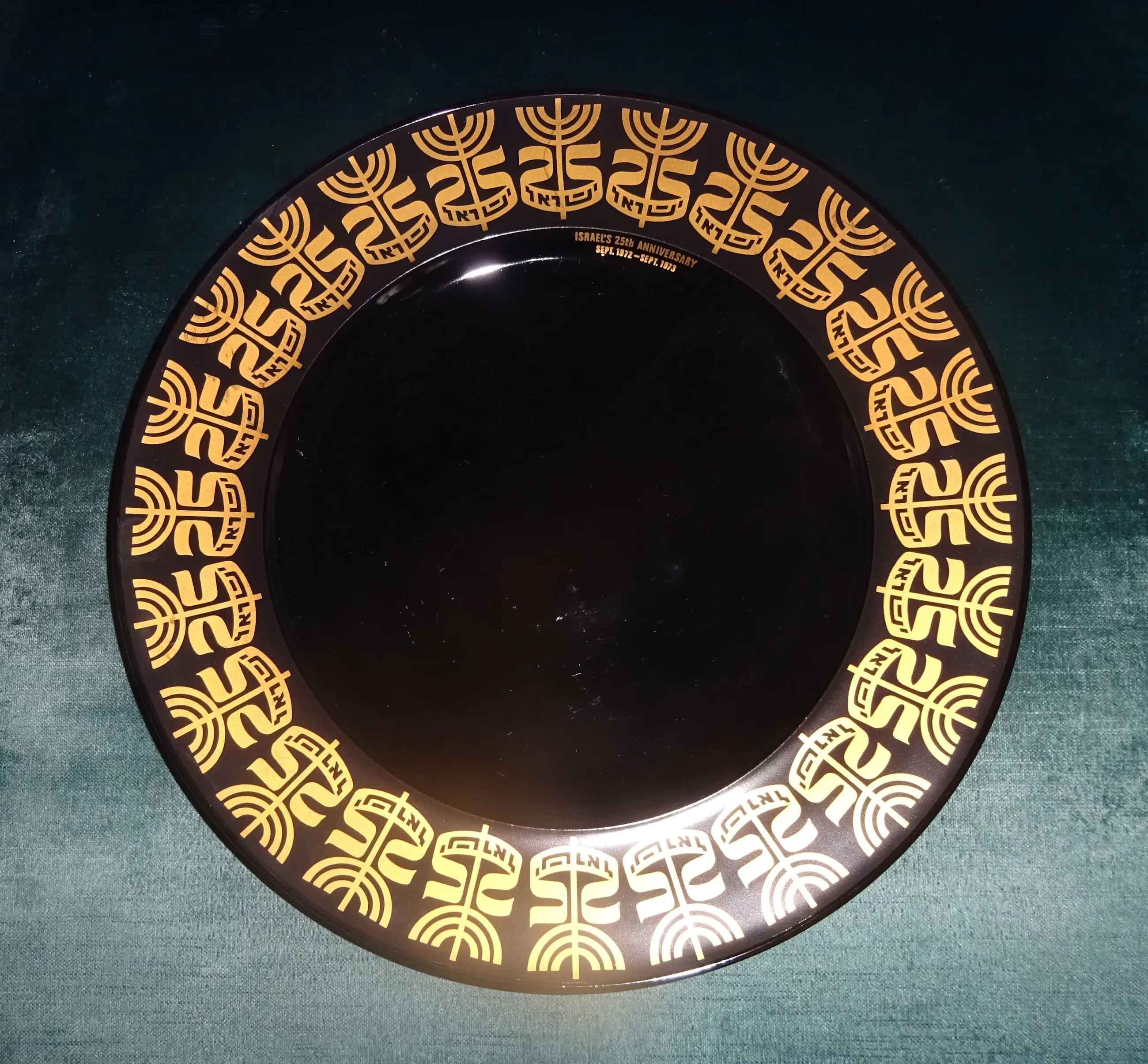 Zwart glanzend porselein bord met gouden opdruk Ontwerp: Tapio Wirkkala 1915-1985 Uitvoering: Rosenthal Germany Tekst: Israel's 25 th anniversary sept 1972-sept 1973 Jaar: 1972-1973 Diameter: 28 cm Conditie: nieuwstaat