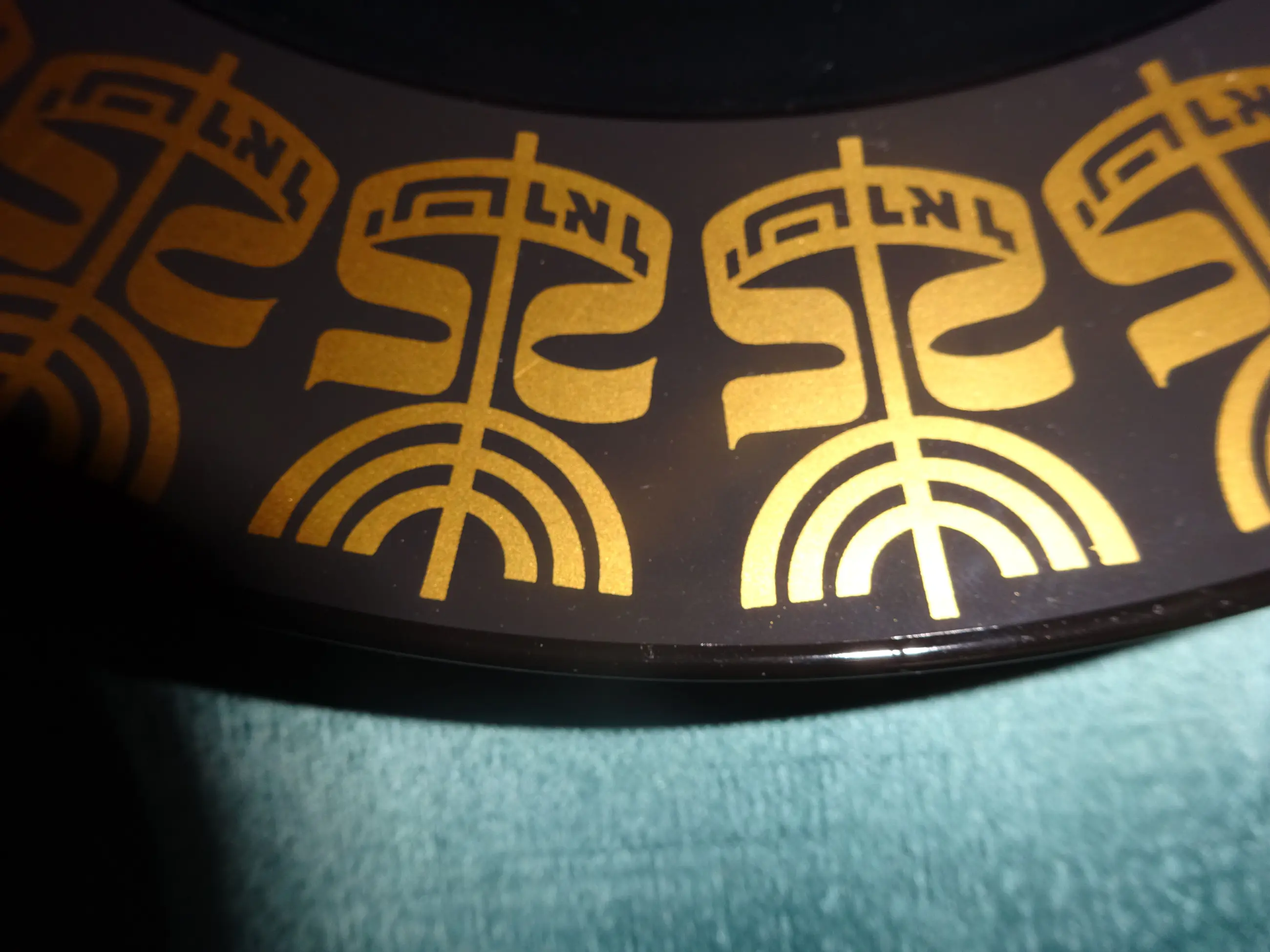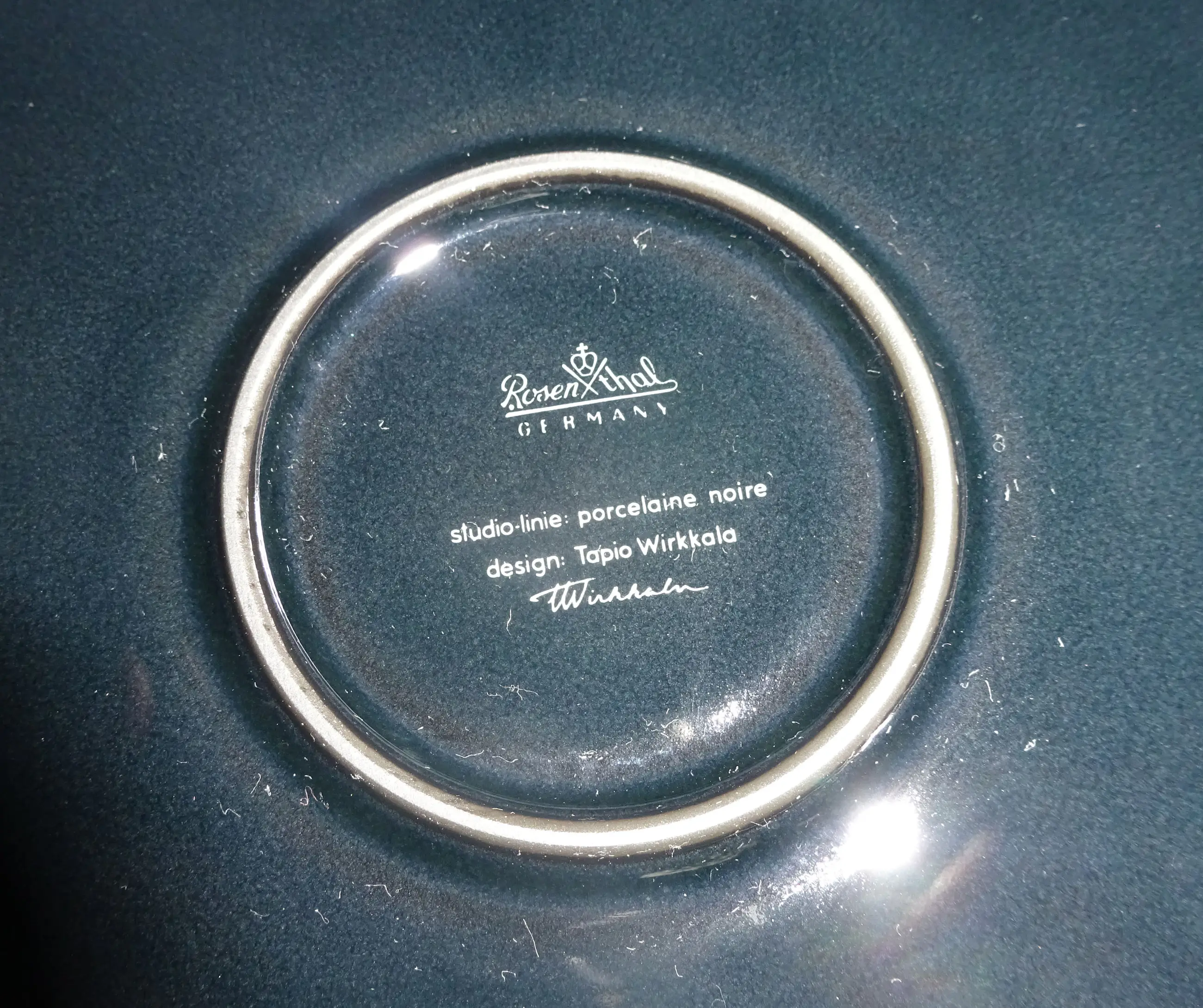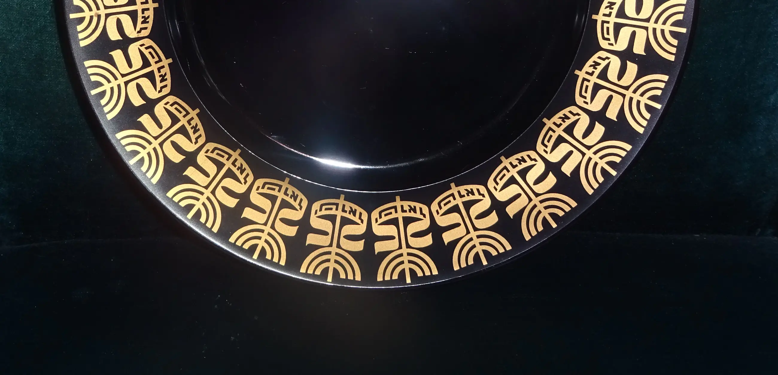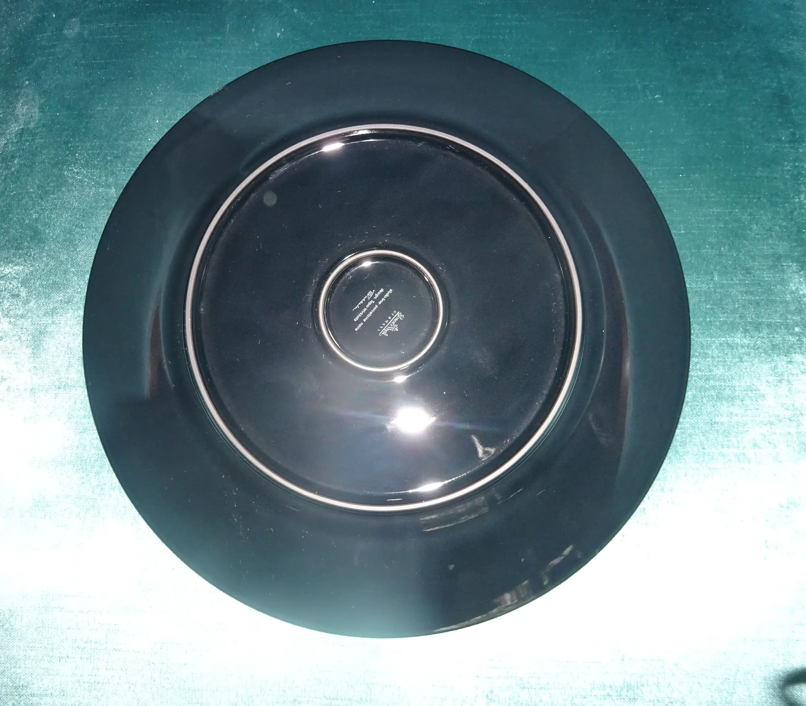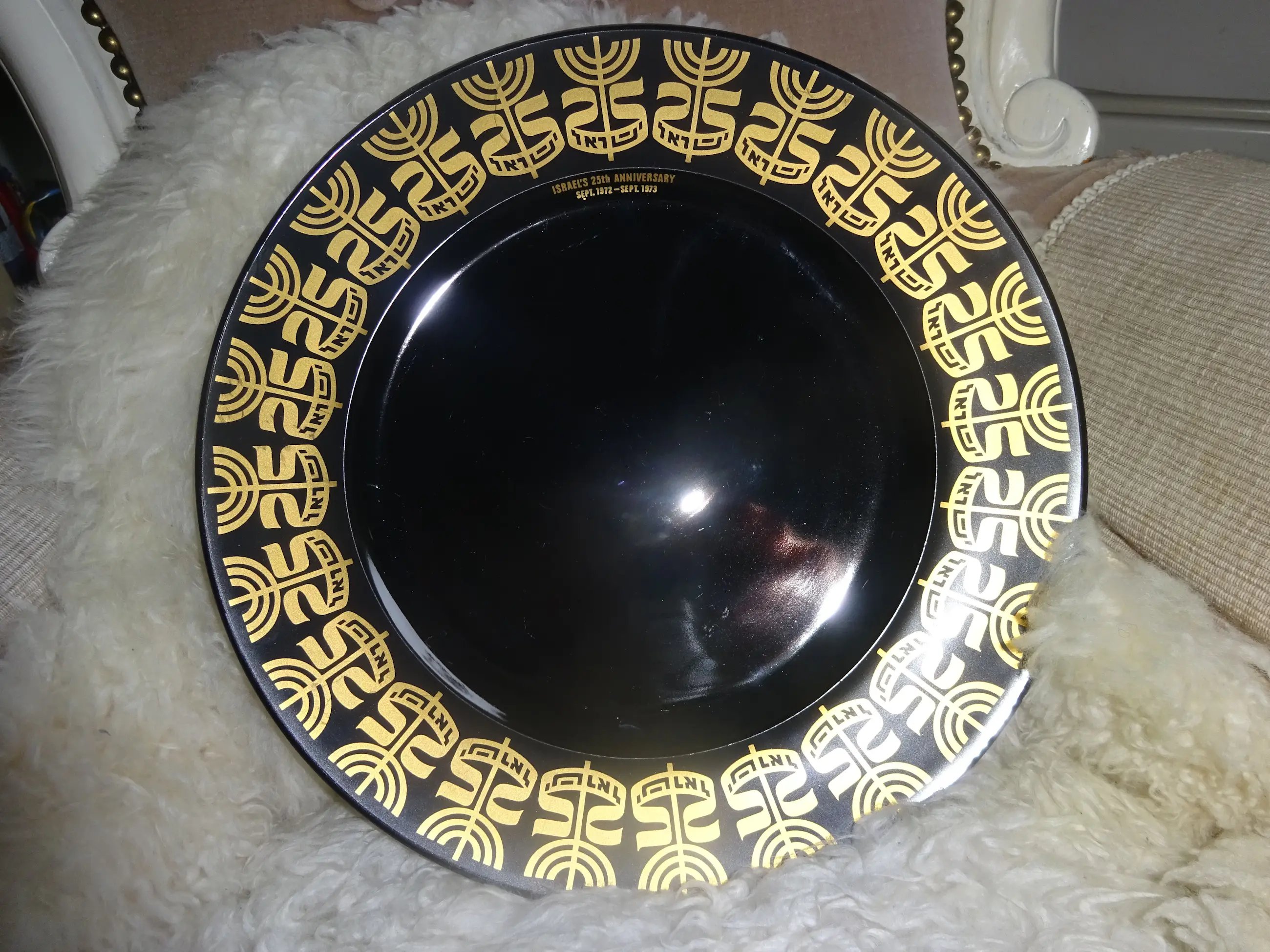 Zwart glanzend porselein bord met gouden opdruk Ontwerp: Tapio Wirkkala 1915-1985 Uitvoering: Rosenthal Germany Tekst: Israel's 25 th anniversary sept 1972-sept 1973 Jaar: 1972-1973 Diameter: 28 cm Conditie: nieuwstaat