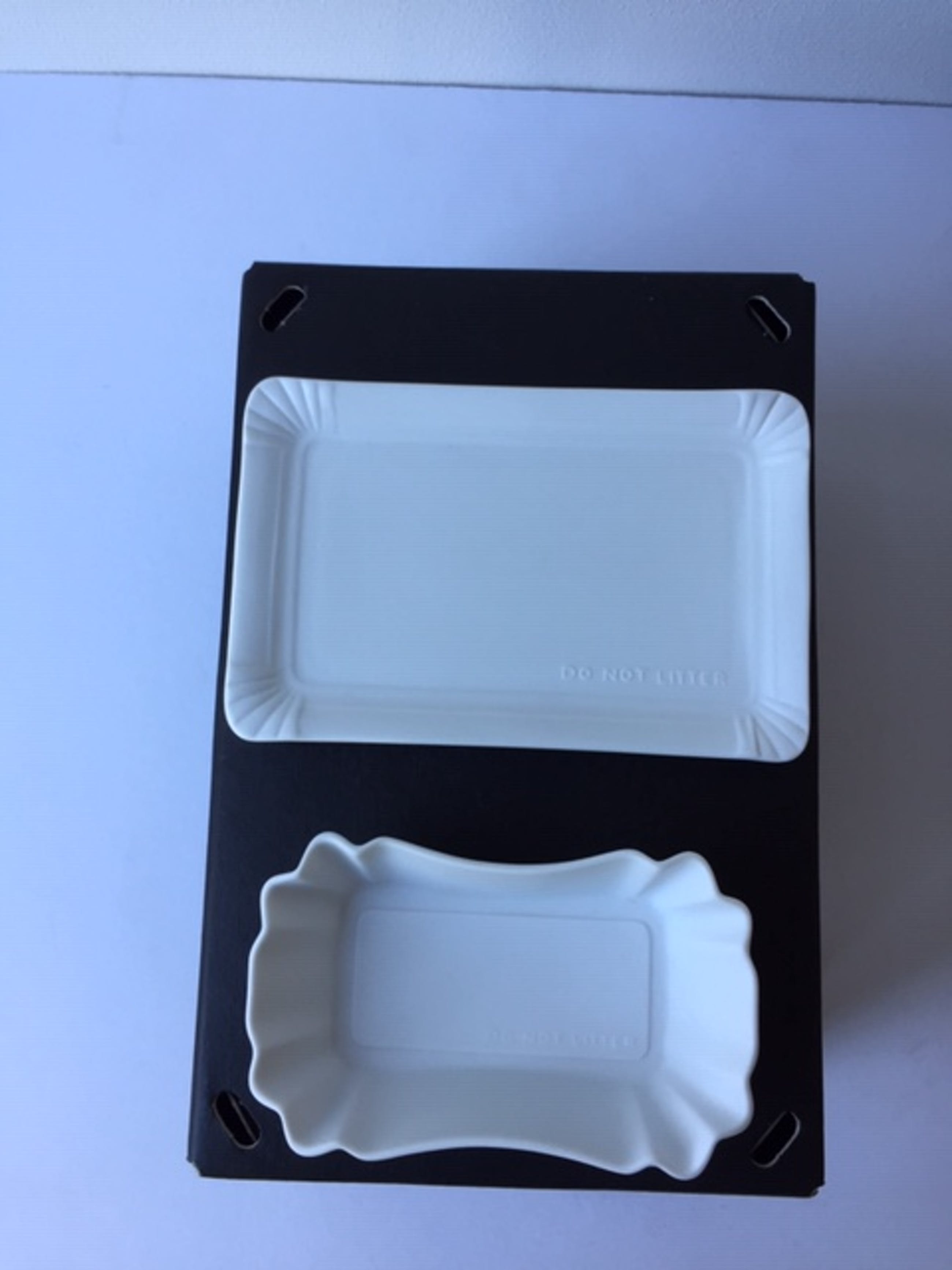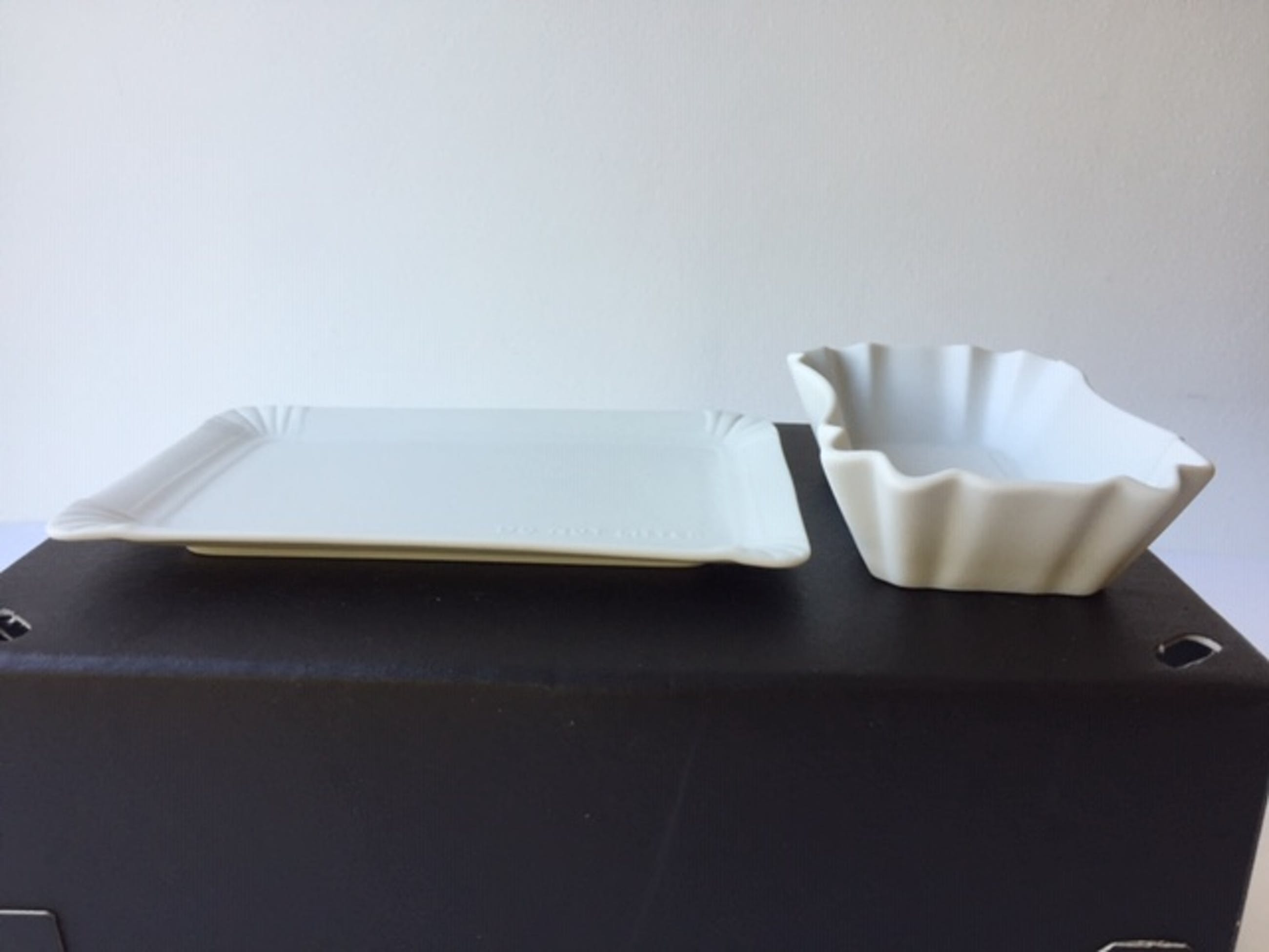 Twee zeldzame objecten uit de Do not Litter Collection van Rosenthal. Wit, biscuit (mat) porselein. Beide in uitstekende conditie. Geen beschadigingen. 1) Schaaltje voor vleeswaren afm. 17,5 x 11,5 x 1 cm In alle jaren dat ik de Do not Litter collection verzamel is dit de eerste keer dat ik het heb kunnen inkopen. 2) Frietbakje "Pommes-Fit" afm. 14 x 8 x 3,5 cm. Wordt niet vaak aangeboden.