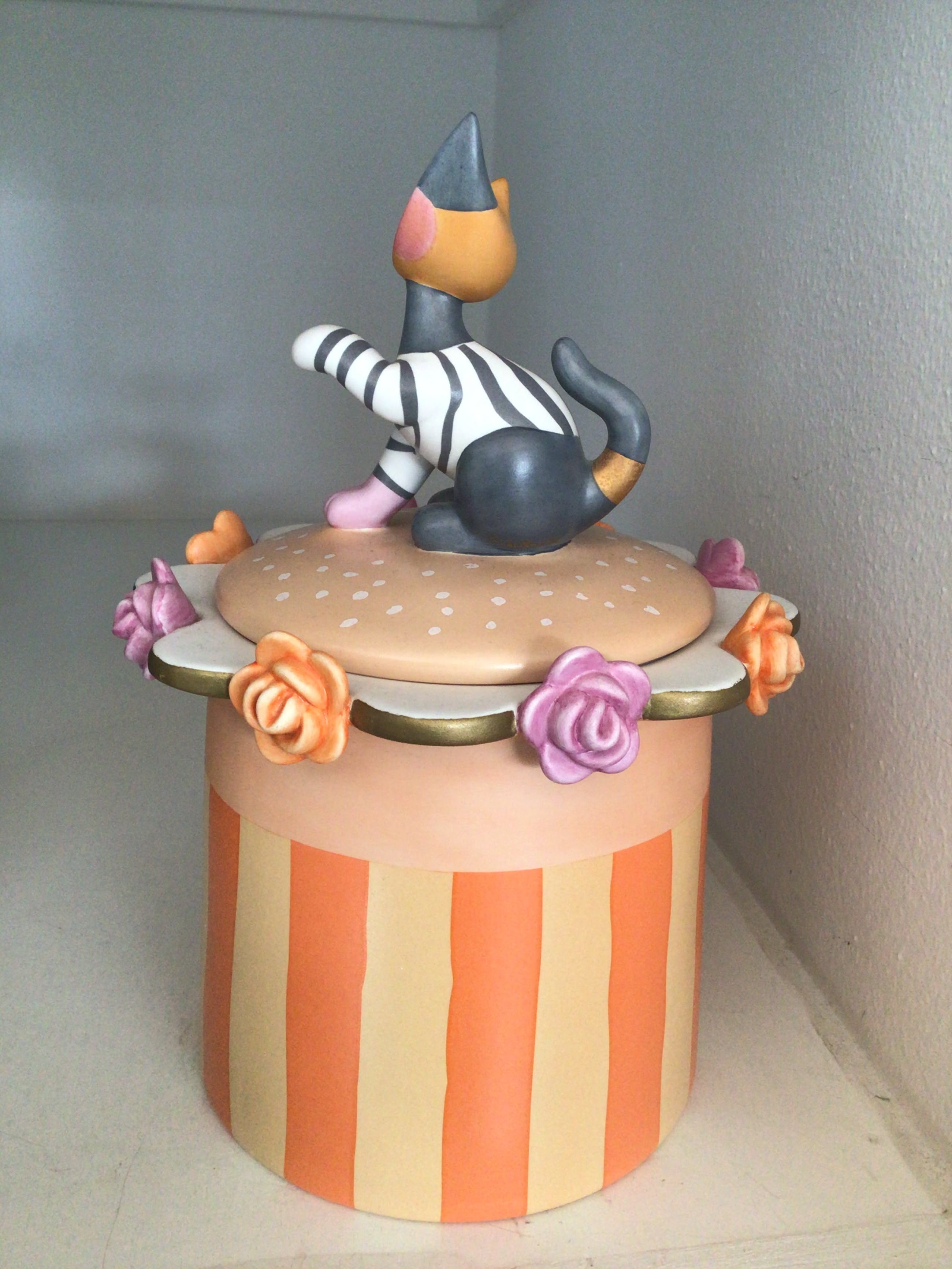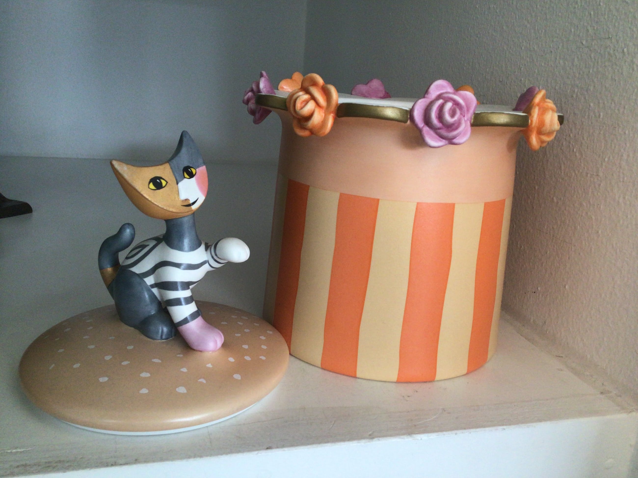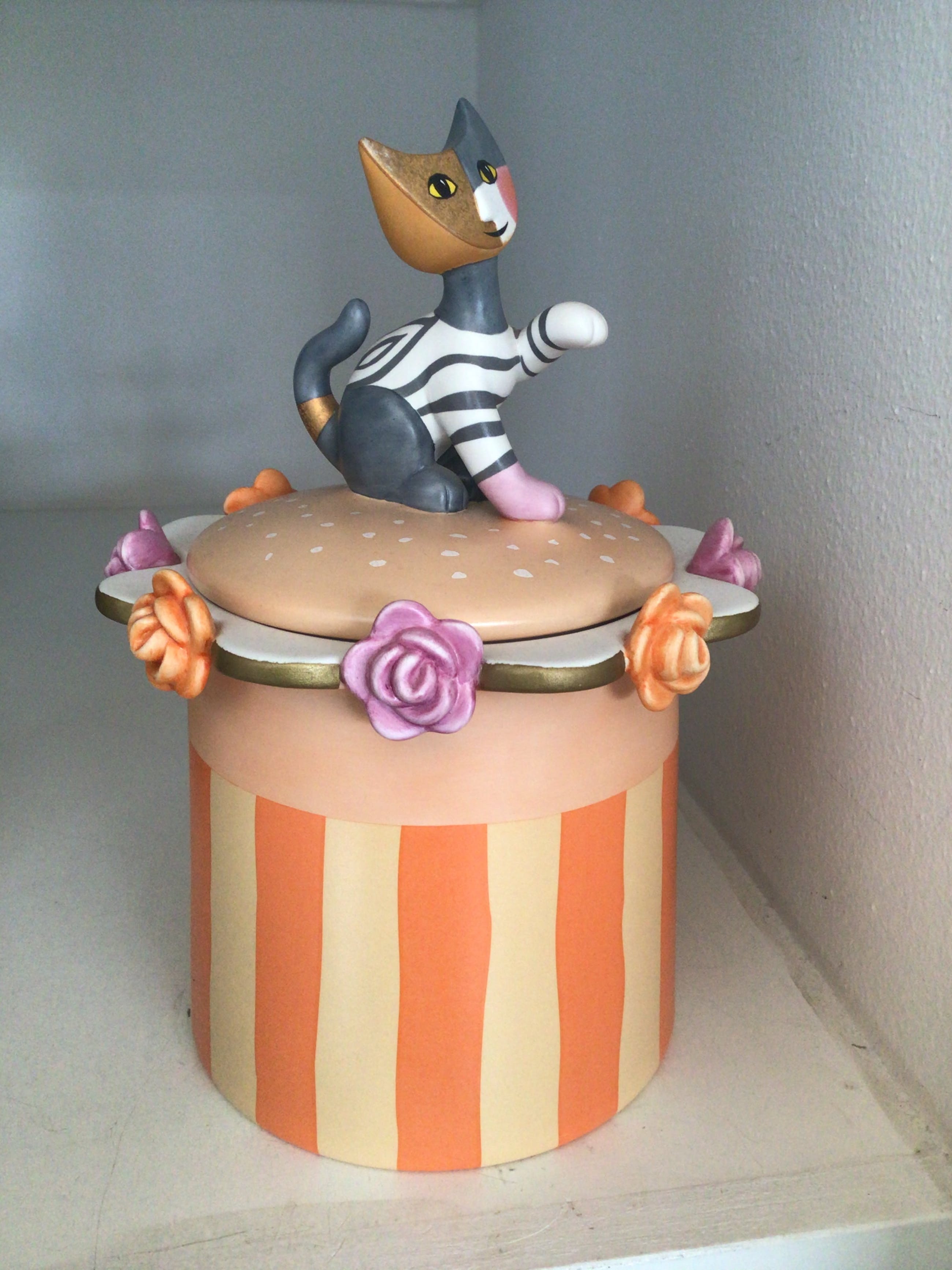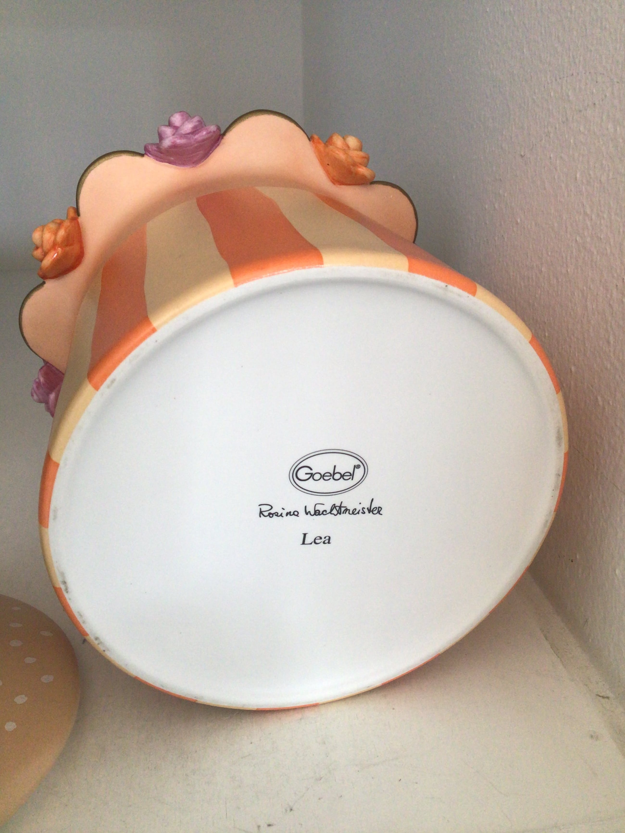 Schitterende hoge sierdoos in zacht roze / oranje met bovenop het vrolijke katje Lea. Het betreft een vrij zeldzaam exemplaar, niet meer verkrijgbaar in de vrije verkoop. Kunstenares: Rosina Wachtmeister Hoogte : 26 cm Doorsnee : 17 cm Materiaal: porselein- Goebel fabriek Het verkeert in goede staat en wordt zorgvuldig verpakt en aangetekend verzonden. Zie ook mijn andere items van Rosina op deze veilingsite!