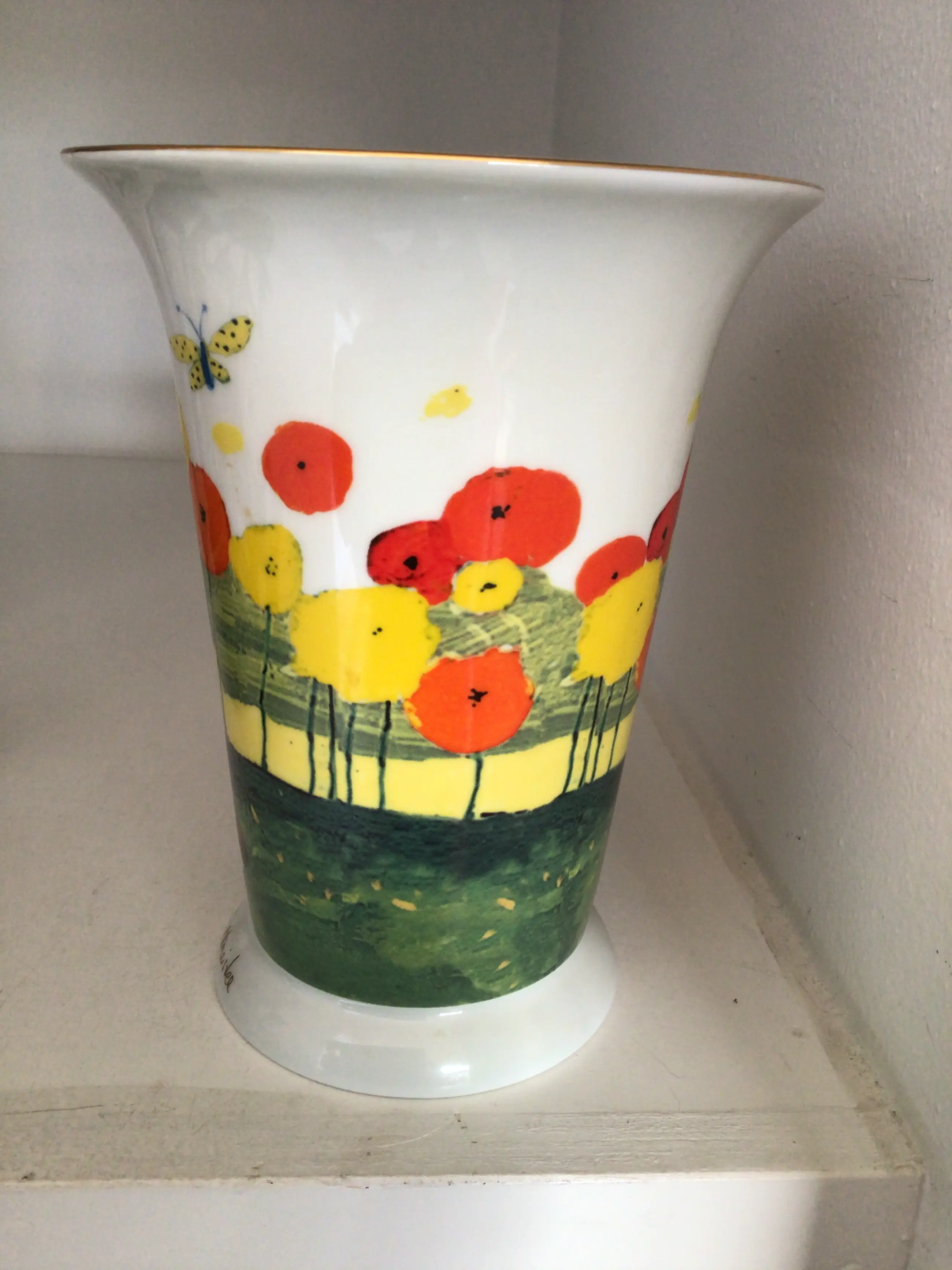 Fraaie siervaas met een afbeelding van een kat in een vrolijke tuin vol met oranje/ gele bloemen. Hoogte : 19 cm Materiaal: keramiek Kunstenares: Rosina Wachtmeister. De vaas is druk-gesigneerd aan de onderzijde. De vaas verkeert in zeer goede staat en wordt zorgvuldig verpakt en aangetekend verzonden.