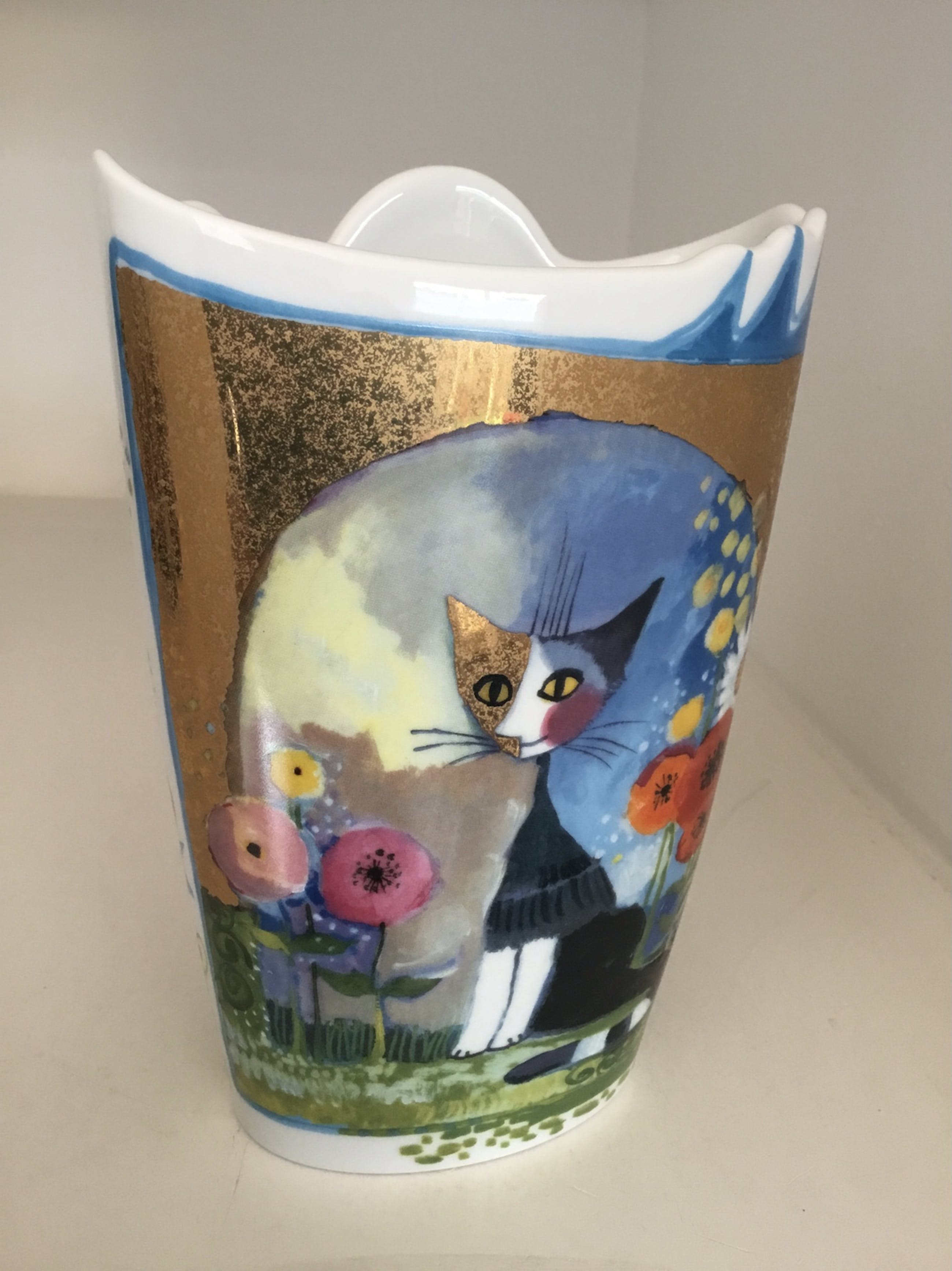 Prachtige kleurrijke vaas met afbeeldingen van katten, een bloementuin en een stralende zon, afgewerkt met bladgoud. Kunstenares: Rosina Wachtmeister / Goebel Titel “ Luce Solare “ Hoogte : 19 cm Materiaal: keramiek De vaas verkeert in zeer goede staat en wordt zorgvuldig verpakt en aangetekend verzonden.
