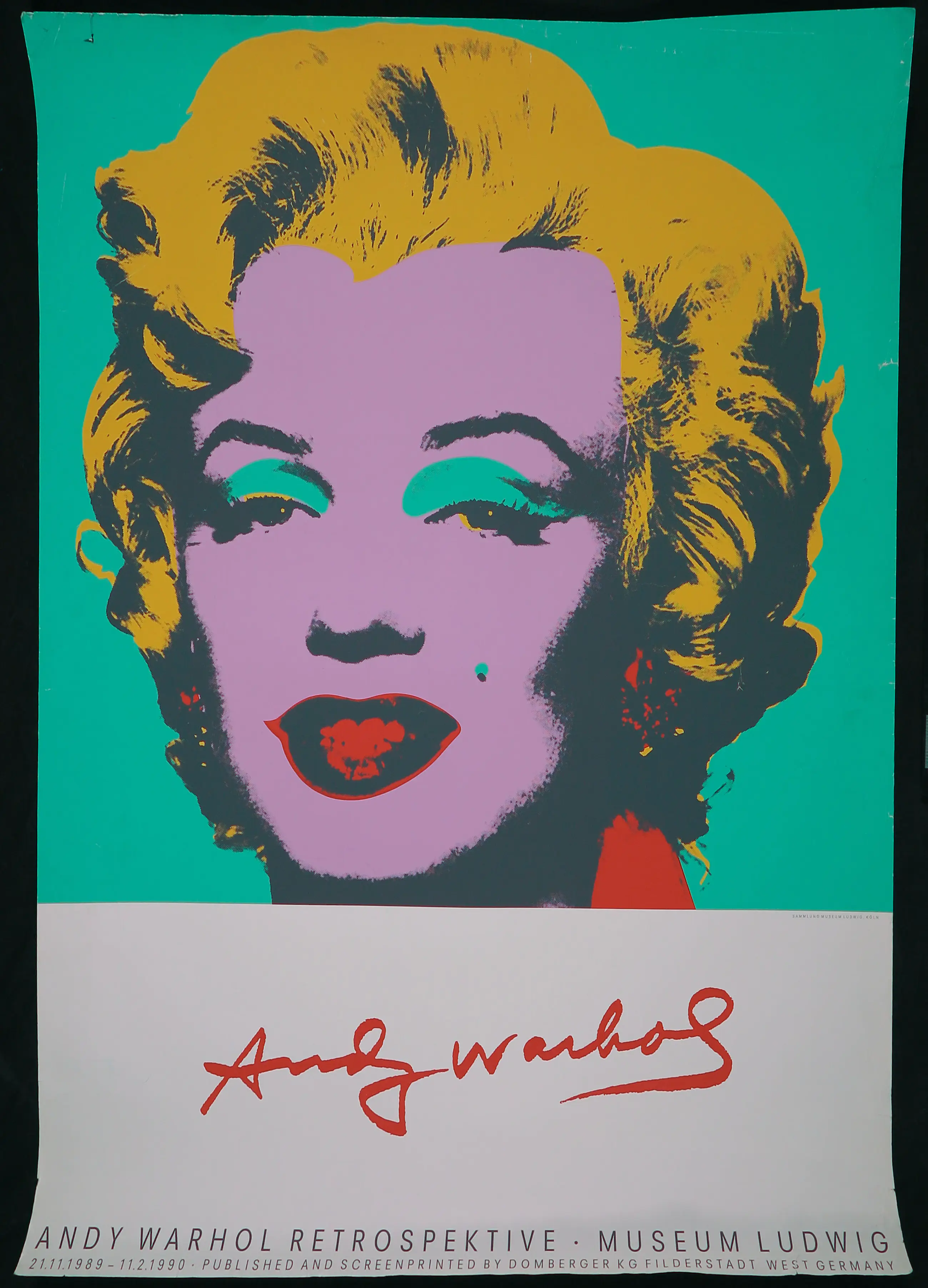Bij het affiche komt ook een groot affiche van Andy Warhol, ter gelegenheid van een retrospectief tentoonstelling in het Ludwig Museum van 1989 tot 1990. Afmetingen: 118,5 x 84 cm. Let op, zie conditie.
