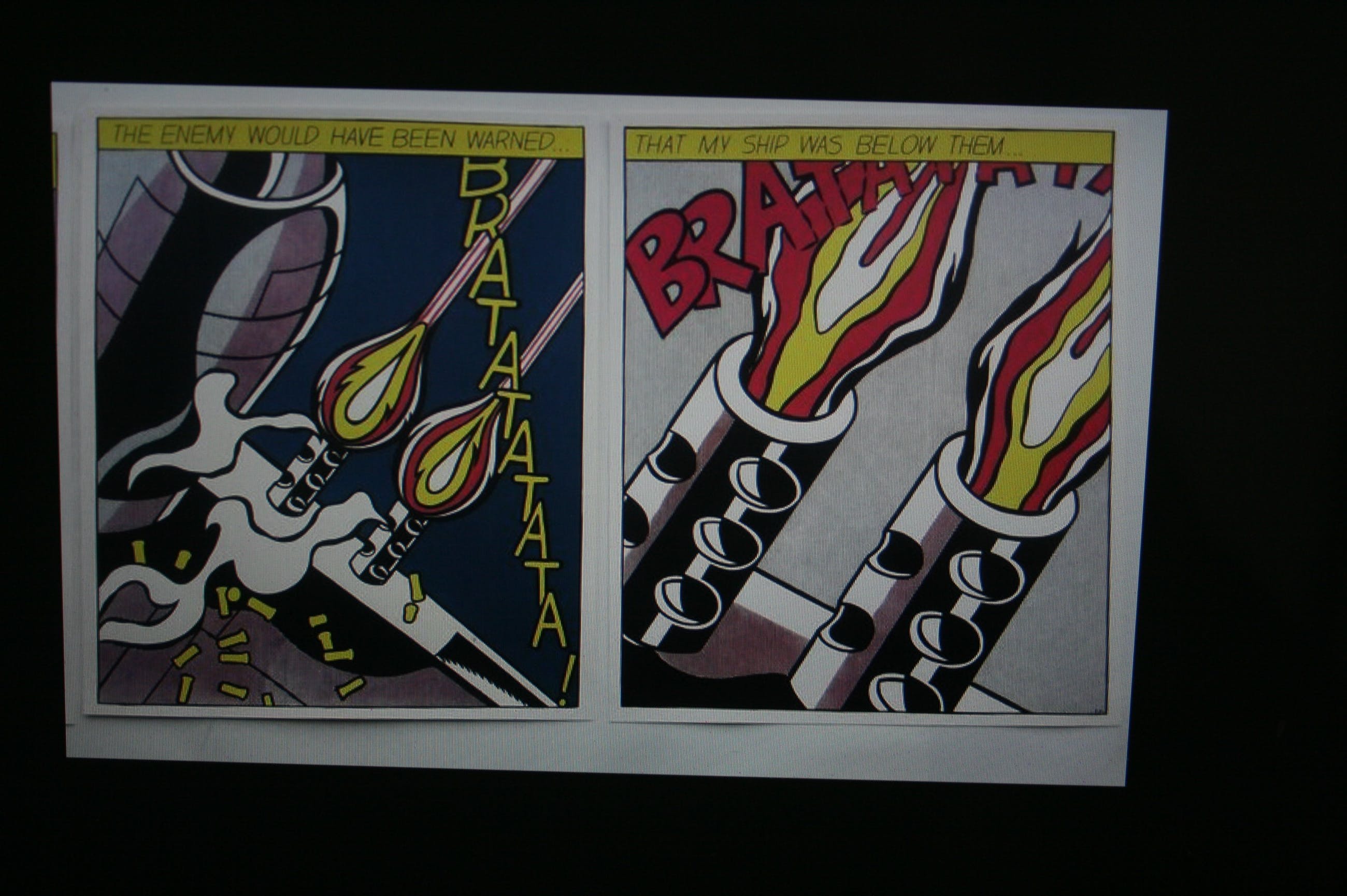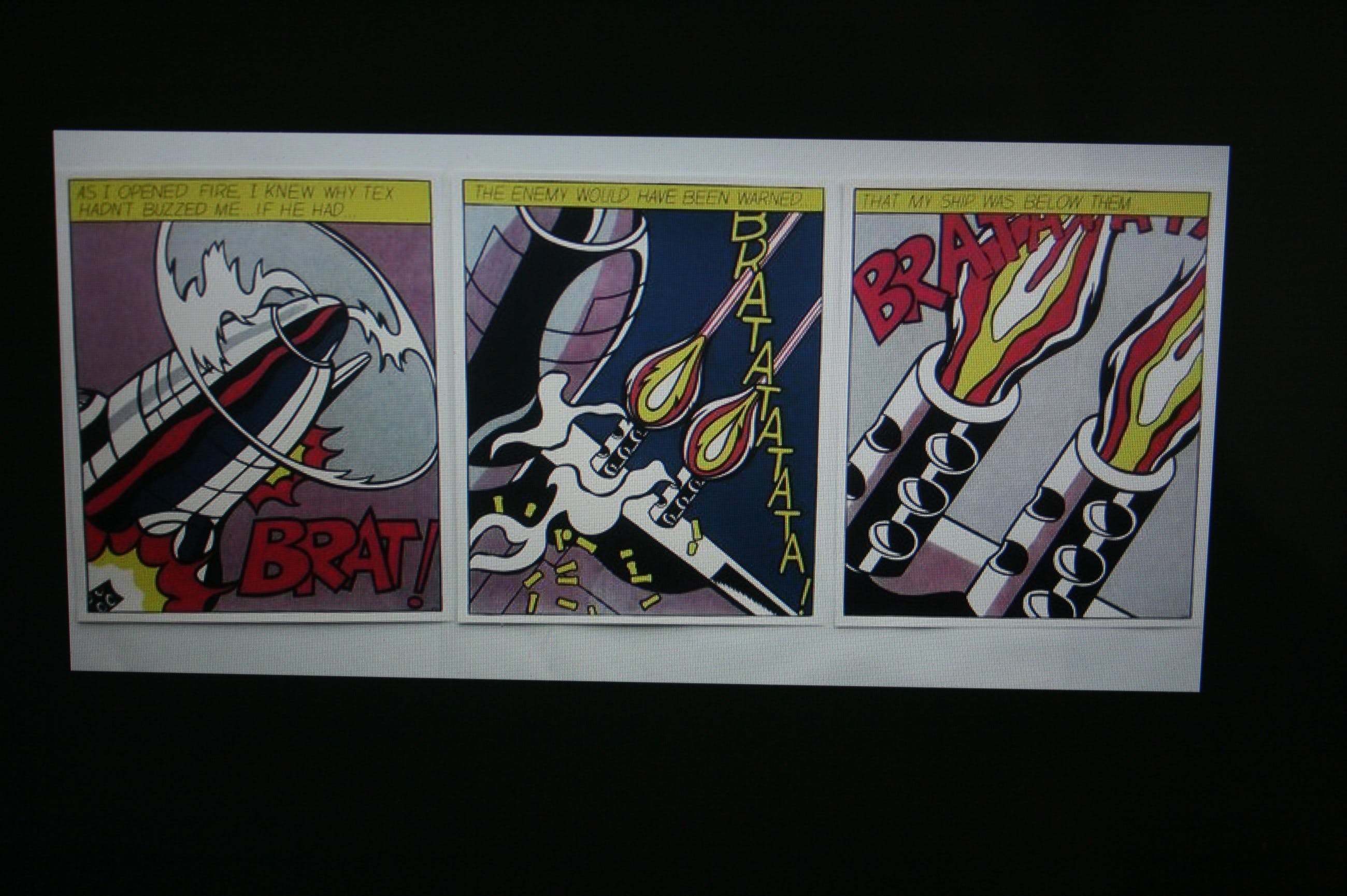 Lichtenstein Roy (naar): Triptiek 'As I Opened Fire'. Dit is de eerste (oude) druk. Uitgegeven tussen 1965 en 1972 in twee oplagen van in totaal 3.140 exemplaren door het Stedelijk Museum van Amsterdam naar aanleiding van een tentoonstelling van Lichtenstein die het origineel op doek aan het museum schonk (nog te zien).