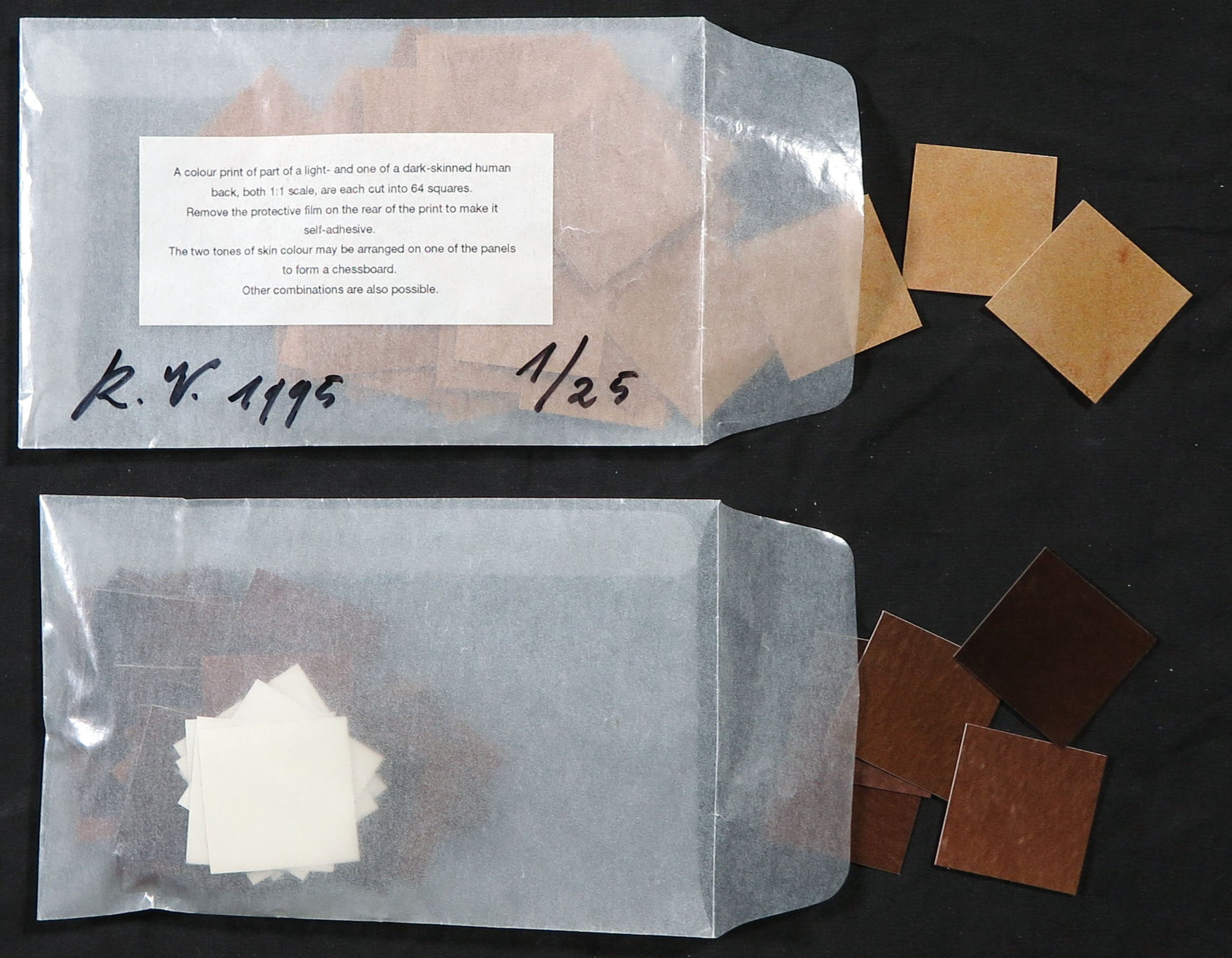 - Twee zakjes met zelf-plakkende vierkanten, waarmee het bord ingericht kan worden. De vierkantjes tonen foto close-up's van de huid van lichtgekleurde en donkergekleurde mensen.